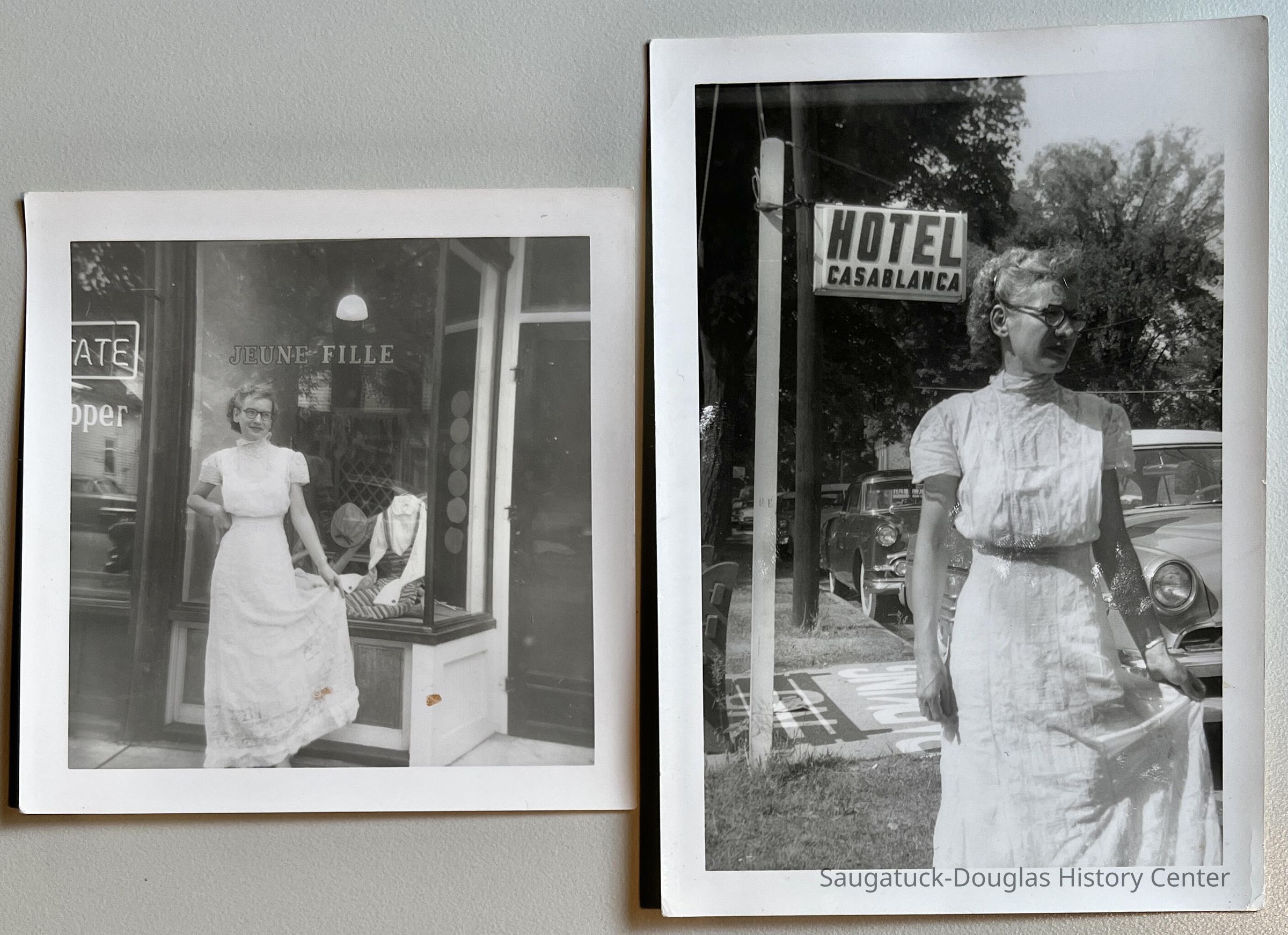 5. Ann Diepenhorst in a high-collared, short-sleeved, ankle-length gown reminiscent of "pouter pigeon" Edwardian Era dresses. She is posed in front of the Jeune Fille shop. Handwritten note on photo back "Mrs. Ann Diepenhorst, our girl, Jeune Fille manager, ..."