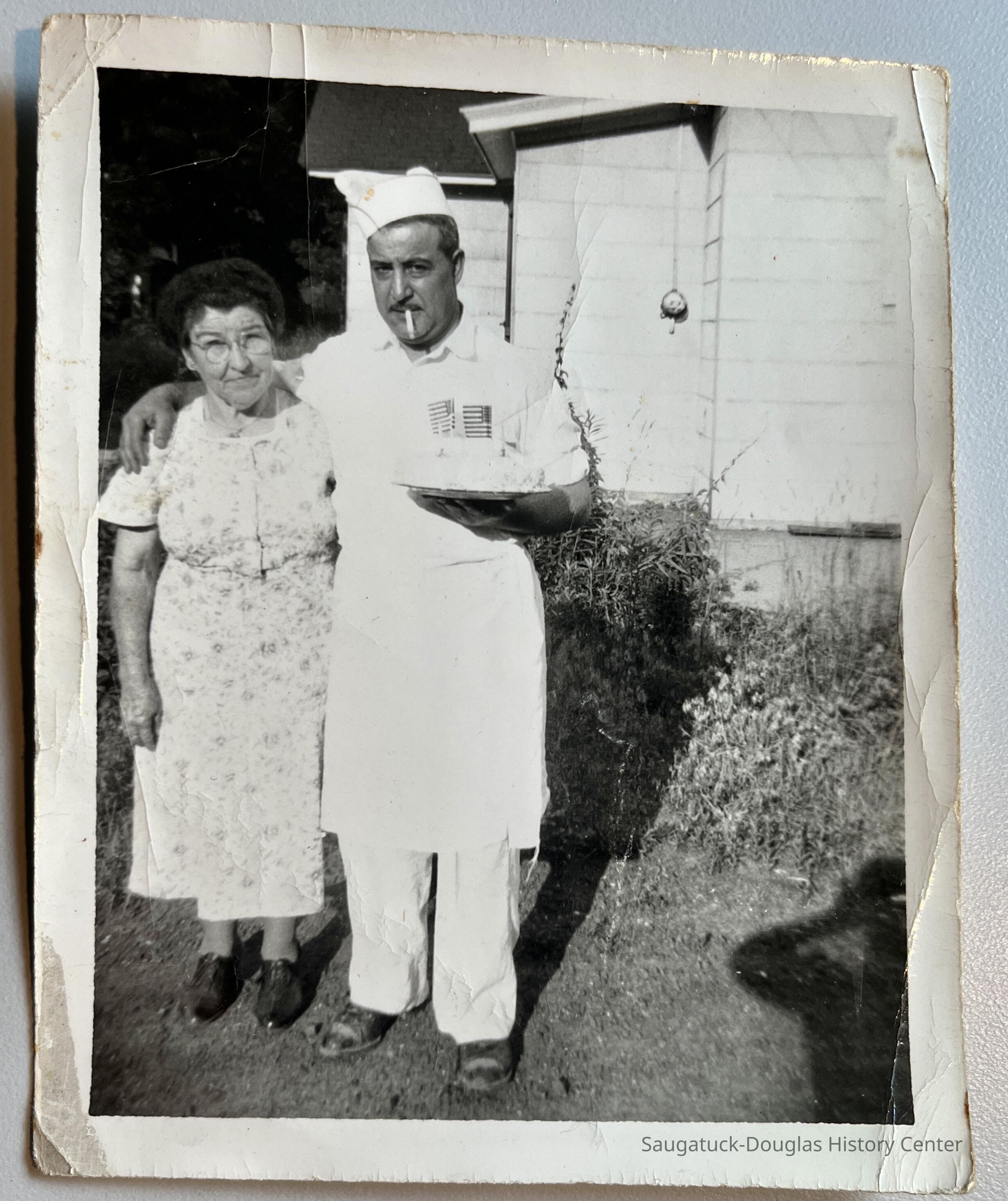 7. "Guilio & Mom (Bertha Diepenhorst) when Guilio Mocini became a U.S.A. citizen with the cake mom made for him. John's mother Bertha at Walton"