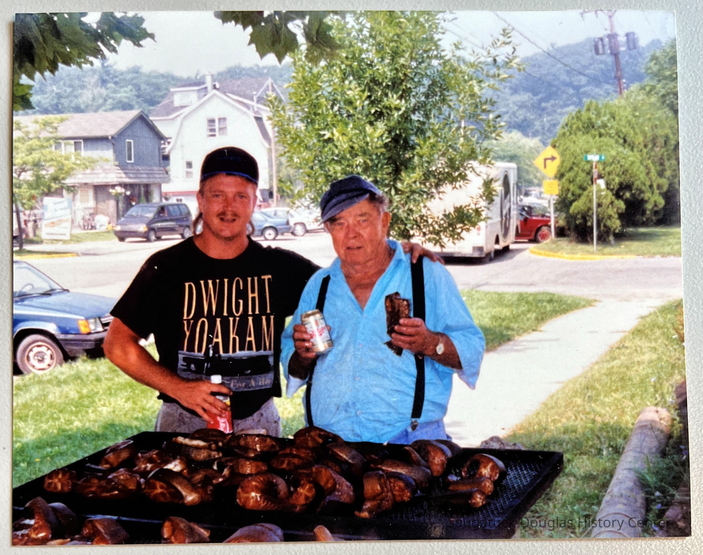 11. Color photo of a young man and John C. Diepenhorst standing in front of a rack of smoked fish. 700 block of Water Street visible in background including Jim Sewers boat barn and the Star of Saugatuck building. Circa mid 1980s to 1990s