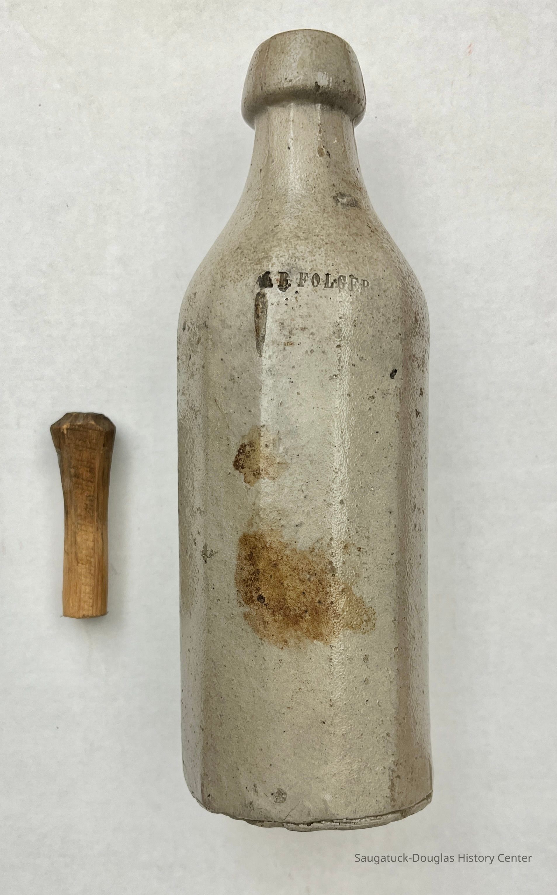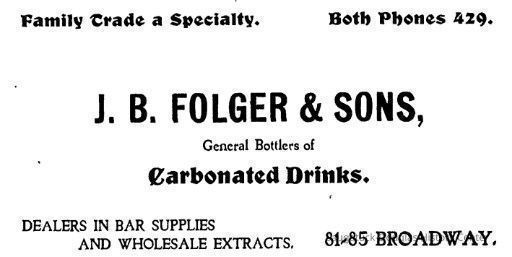 J.B. Folger bottles came from Grand Rapids, Michigan. John Baldwin Folger founded the J.B. Baldwin and Sons Bottling Company in the 1870s. The bottles were manufactured by the Merrill Pottery Company of Ohio and predominantly used for root beer, sarsaparilla, lemon beer or other beverages.