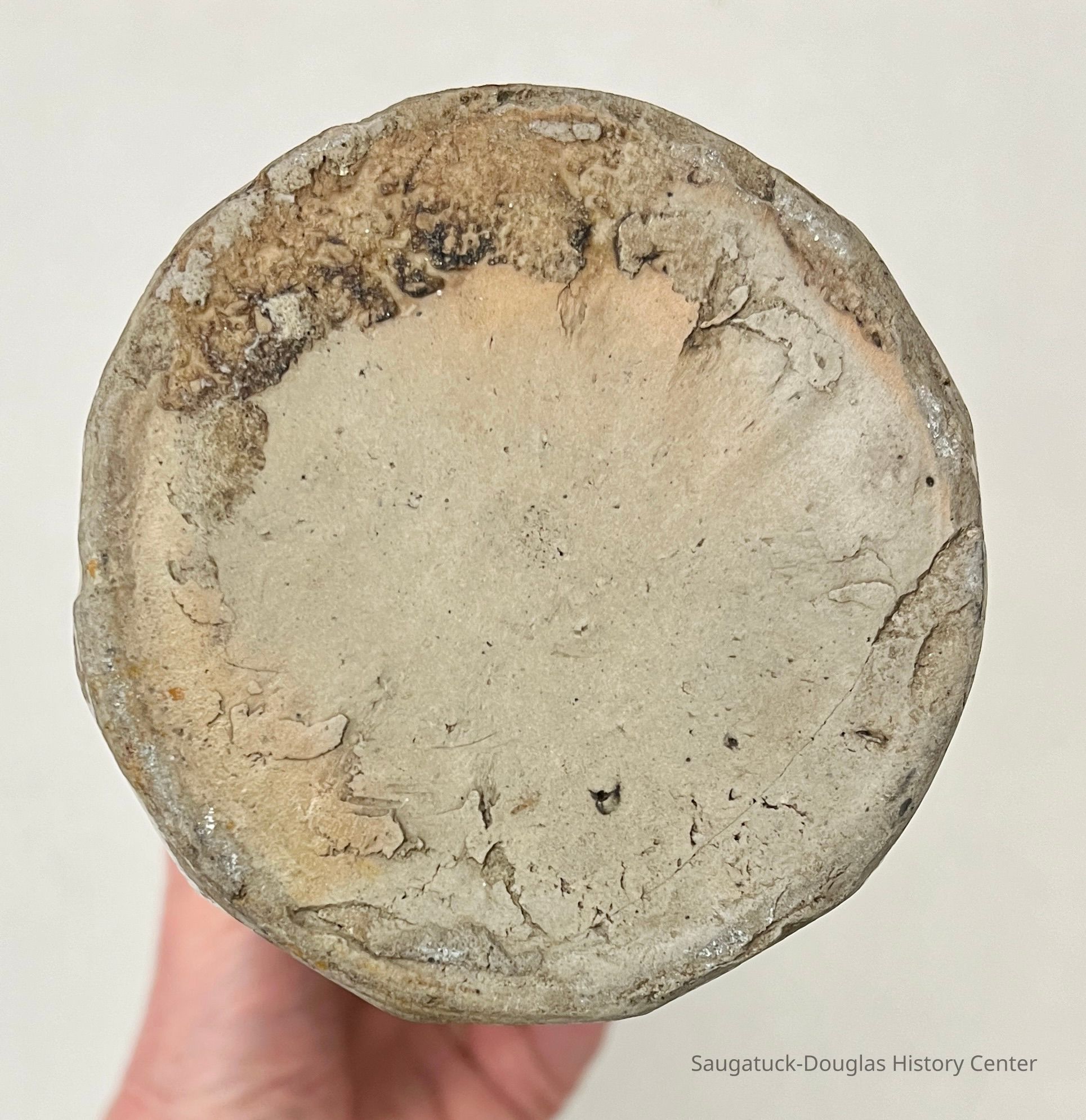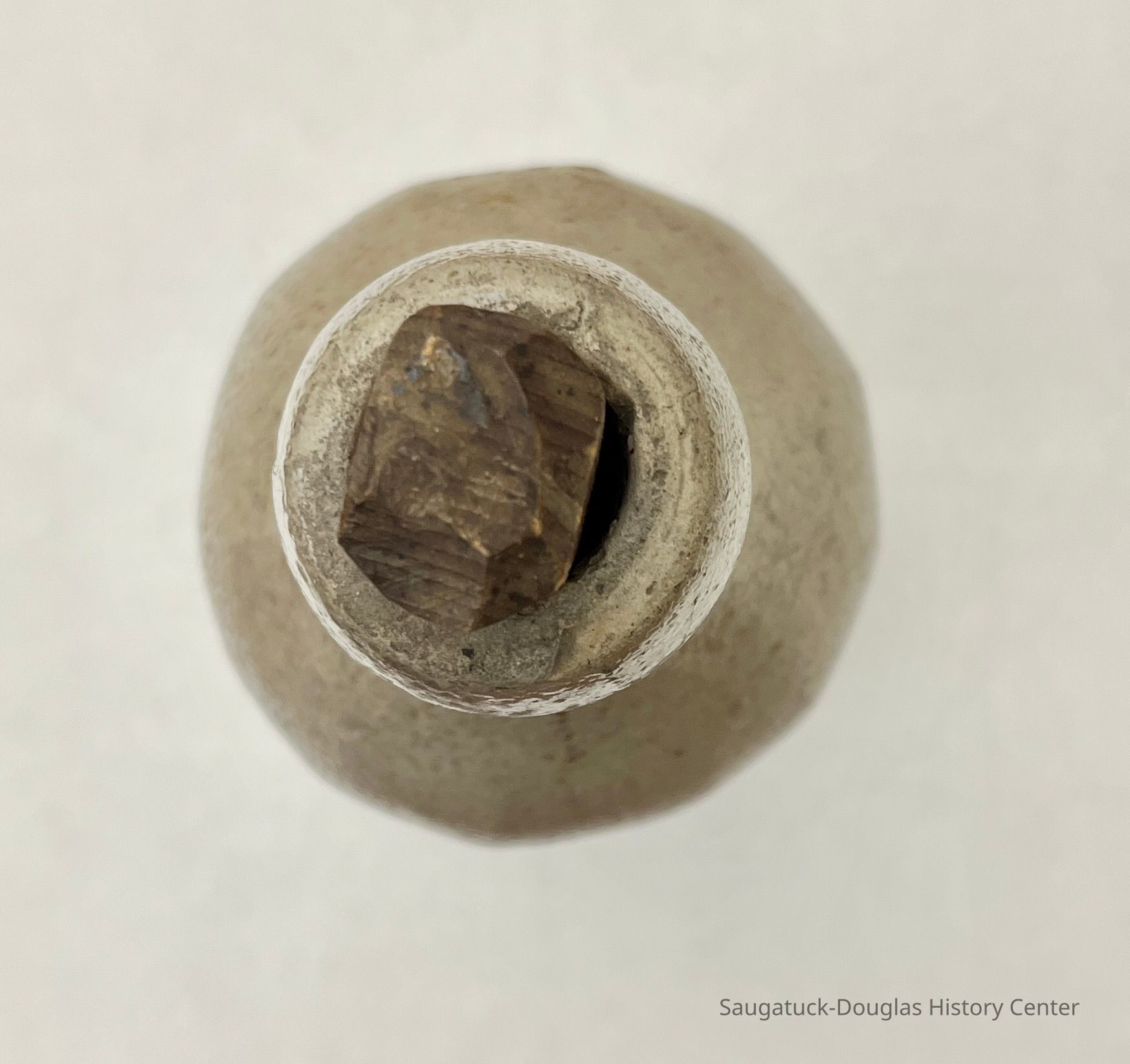 Gray-glazed ceramic bottle with wooden stopper. The 12-sided, stoneware, salt glaze, blob top bottle is stamped J.B. Folger just below the neck.