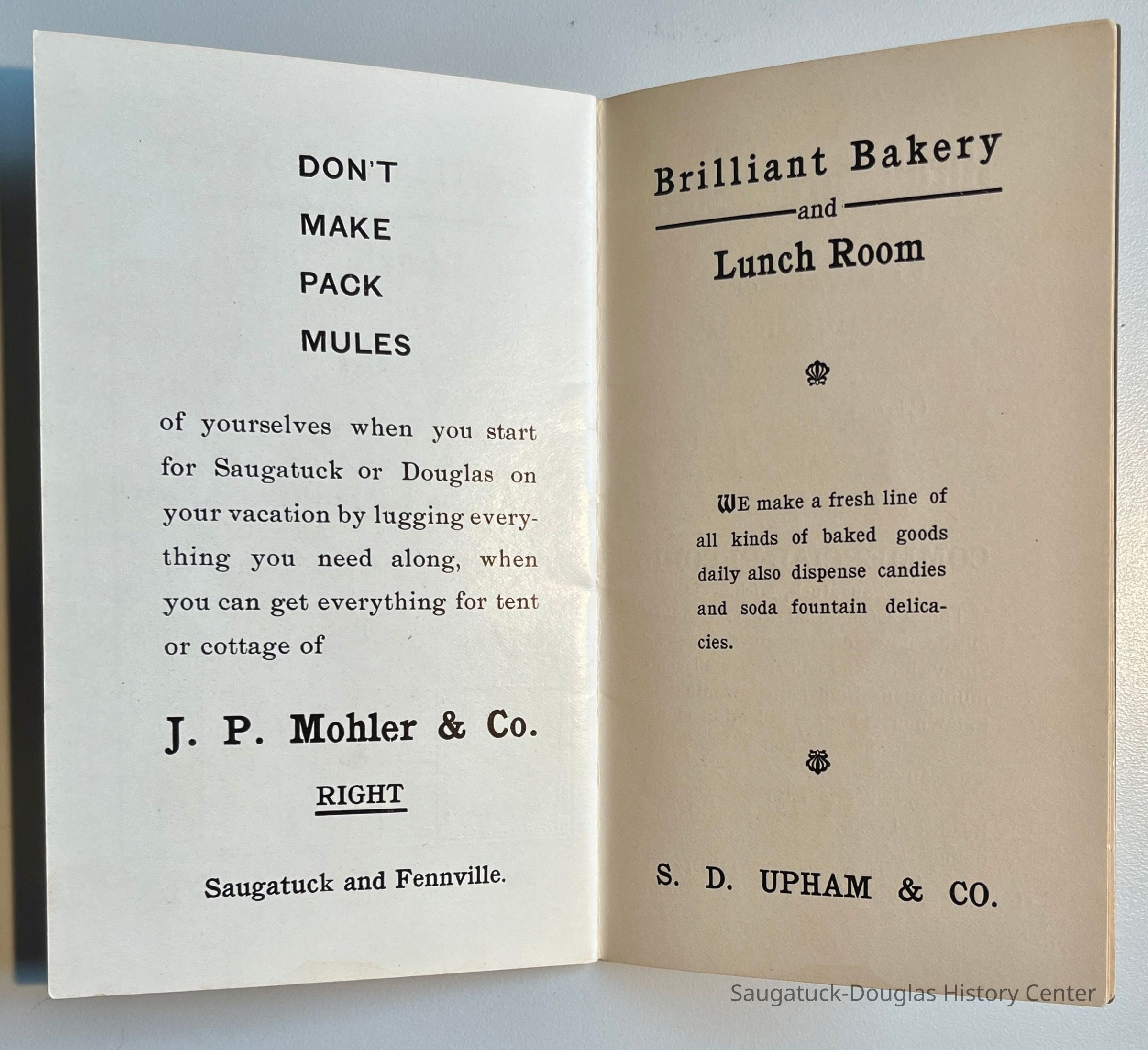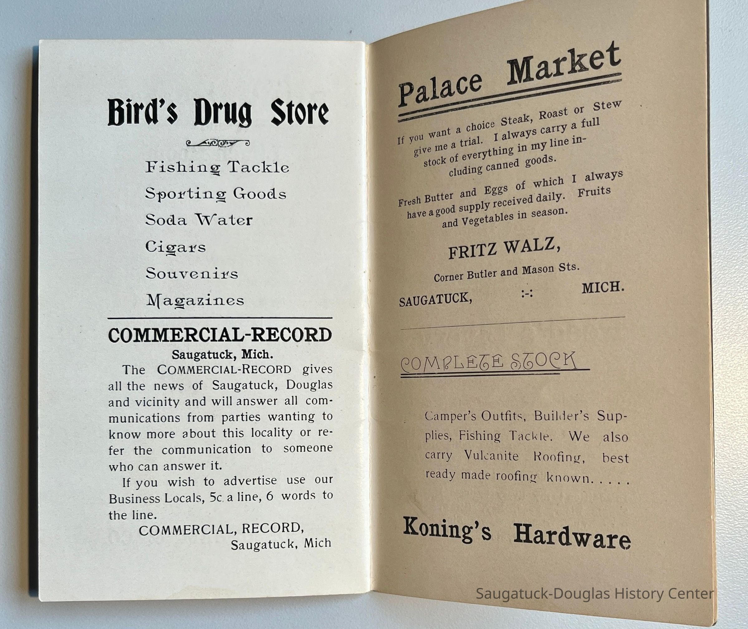 Mize Rose Garden north side/Fruit Growers State Bank/Clapp's Grocery/Flint's Shoes/Walz Meat Market/Griffin/TannerRed Cross Drug StoreDavis Livery/Heath & Stillson livery/Schaberg’s Roller RinkGraham & Morton Transportation Co. 1874-1950Saugatuck Harbor Piers/Channel 1906-presentGriffin & Henry Lumber Yard/Griffin & Henry Sawmill/Griffin & Williams/Stockbridge & Johnson/Wells & Johnson/M.B. Spencer Mill317 Butler/Saugatuck Gallery/Singapore Bank Book Store/Kozy Koffee/Variety Shop/Aliber Grocery/Moore BuildingAliber, James Amos 1853-1920Bird, Harry Moffat 1877-1914326 Butler/Grins/Martha Shop/Dr. Walker's office/Miller Robinson/Turell BuildingRobinson, Miller 1859-1940Roda, Richard A.202 Butler/Pumpernickle's/Carl's AG/Richard Roda's Billiard Hall/Union Hotel 1870Presbyterian Camp/Camp Gray/Forward Movement Park 1899-2014Saugatuck Harbor Natural Area/South Denison Property/Gay/Nude Beach;J.P. Mohler & Co.Upham, Sherman D. 1858-1940Brilliant Bakery and Lunch Room306 Butler/Landsharks/Tripp's/Kruger's/C.E. Bird's/Ensign Drug Store/Wilcox BuildingCommercial Record newspaper, TheWalz, Fritz "Fred" 1858-1934439 Butler/Butler Pantry/Wilkins/Koning/Nies HardwareLudwig Real Estate Agency119-121 Butler/Leland's Department Store Building 1907Leland, E.L. "Lee" 1878-1963246 Culver/Restaurant Toulouse/Reed's Livery/Union HouseGoshorn, George Washington 1868-1934Mount Baldhead Dune/ParkPottawatomie Club c1906