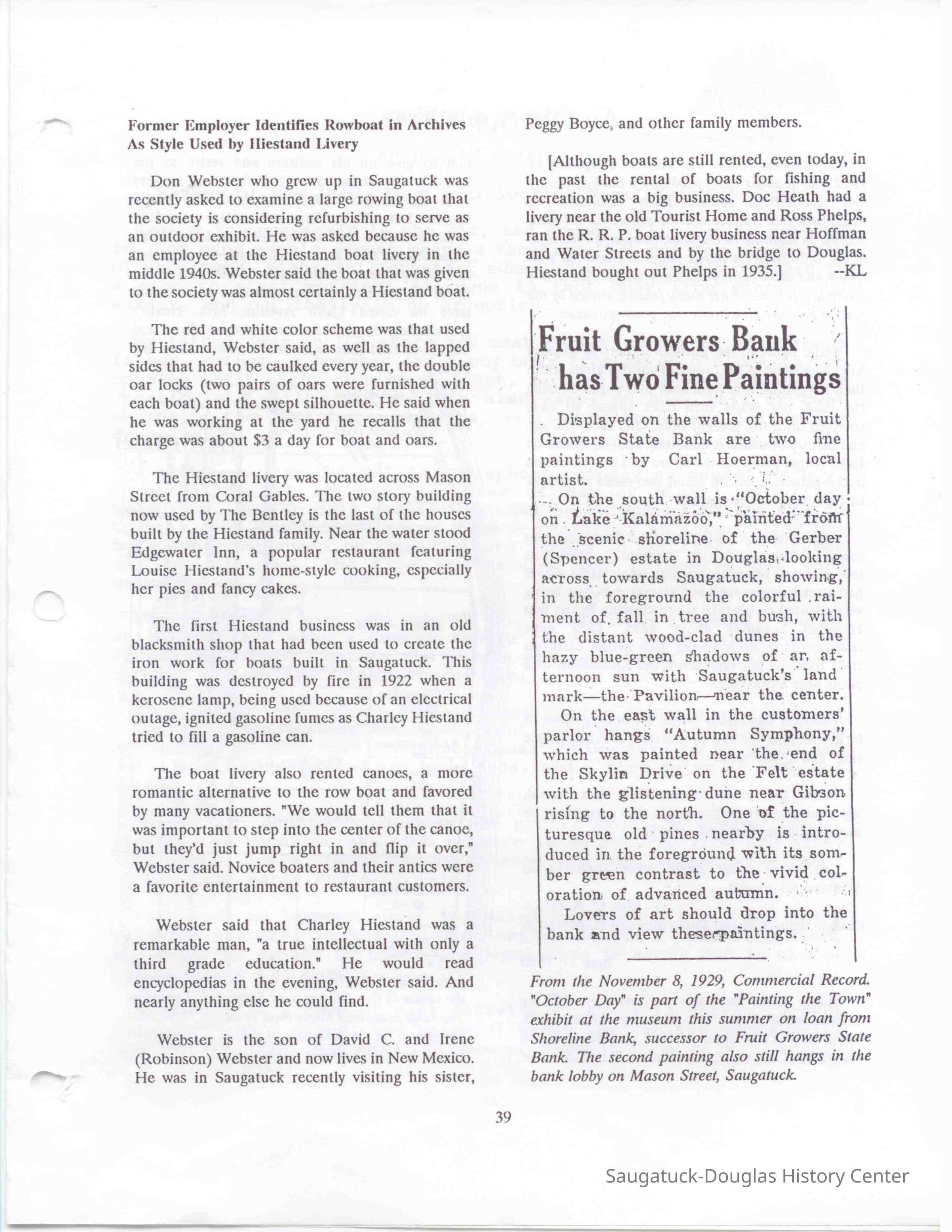 Former Employer Identifies Rowboat in Archives As Style Used by Hiestand Livery Don Webster who grew up in Saugatuck was recently asked to examine a large rowing boat that the society is considering refurbishing to serve as an outdoor exhibit. He was asked because he was an employee at the Hiestand boat livery in the middle 1940s. Webster said the boat that was given to the society was almost certainly a Hiestand boat. The red and white color scheme was that used by Hiestand, Webster said,as well as the lapped sides that had to be caulked every year, the double oarlocks (two pairs of oars were furnished with each boat) and the swept silhouette. He said when he was working at the yard he recalls that the charge was about $3 a day for boat and oars. The Hiestand livery was located across Mason Street from Coral Gables. The two story building now used by The Bentley is the last of the houses built by the Hiestand family. Near the water stood Edgewater Inn, a popular restaurant featuring Louise Hiestand's home-style cooking, especially her pies and fancy cakes. The first Hiestand business was in an old blacksmith shop that had been used to create the iron work for boats built in Saugatuck. This building was destroyed by fire in 1922 when a kerosene lamp, being used because of an electrical outage, ignited gasoline fumes as Charley Hiestand tried to fill a gasoline can. The boat livery also rented canoes, a more romantic alternative to the row boat and favored by many vacationers. "We would tell them that it was important to step into the center of the canoe, but they'd just jump right in and flip it over, Webster said. Novice boaters and their antics were a favorite entertainment to restaurant customers. Webster said that Charley Hiestand was a remarkable man, "a true intellectual with only a third grade education." He would read encyclopedias in the evening, Webster said. And nearly anything else he could find. Webster is the son of David C. and Irene (Robinson) Webster and now lives in New Mexico. He was in Saugatuck recently visiting his sister, Peggy Boyce, and other family members. [Although boats are still rented, even today, in the past the rental of boats for fishing and recreation was a big business. Doc Heath had a livery near the old Tourist Home and Ross Phelps, ran the R. R. P. boat livery business near Hoffman and Water Streets and by the bridge to Douglas.Hiestand bought out Phelps in 1935.]