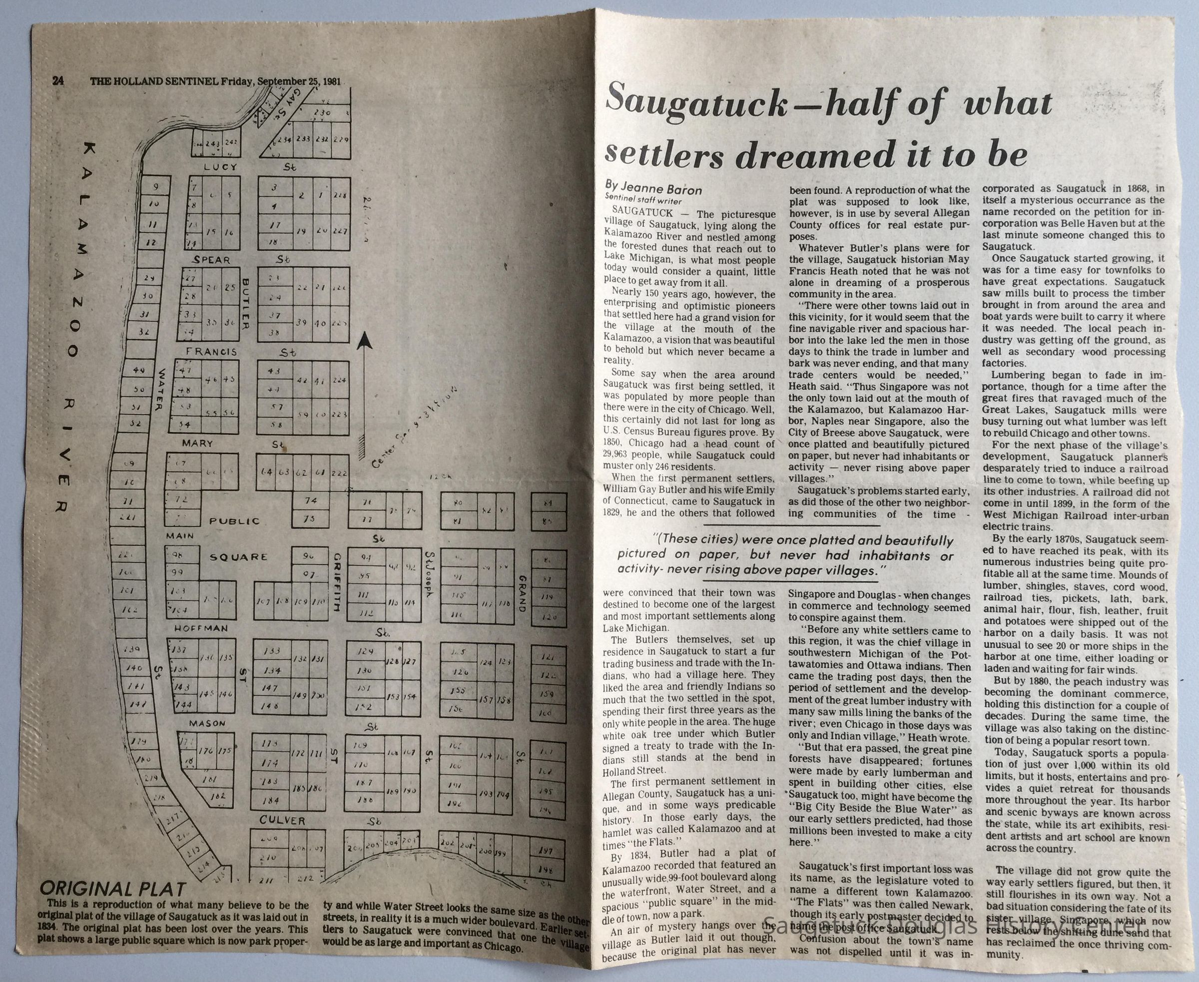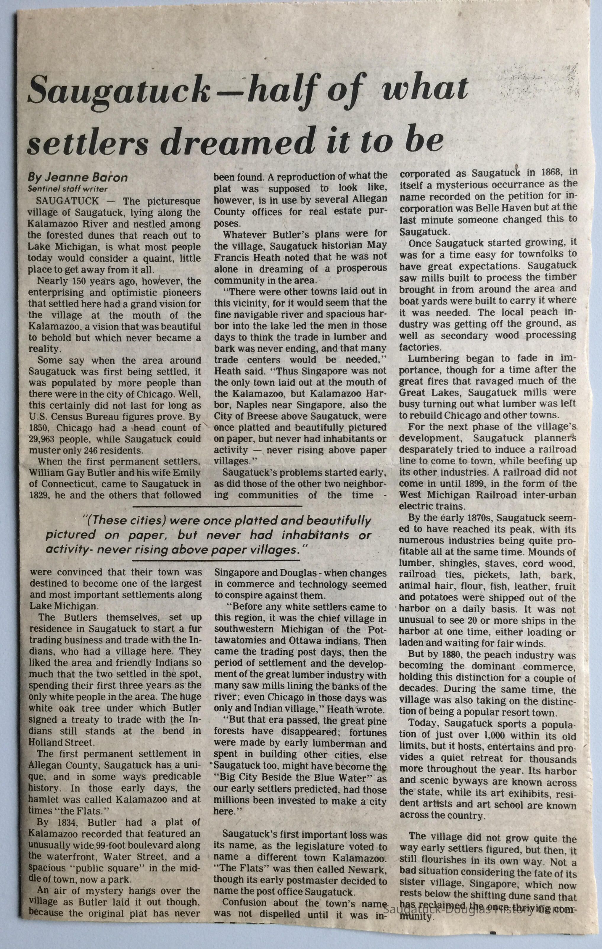 General history of Saugatuck's establishment and economic development by Jeanne Baron, clipped from the Holland Sentinel, Friday, September 25, 1981.
