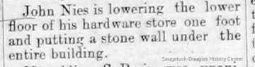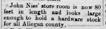 History: Following his discharge from the Union army in 1864, John (Jan) Nies opened a hardware store in Saugatuck (possibly 1868).