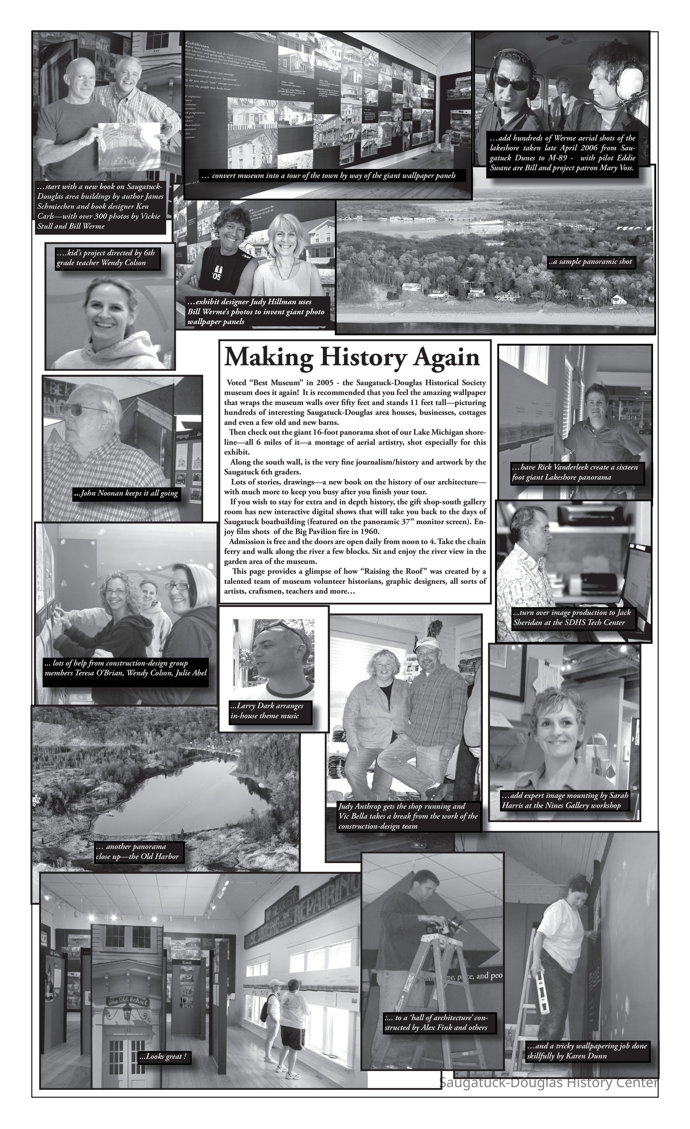 Dr. James Schmiechen, an architectural historian spearheaded an exhibit and book about local buildings titled "Raising the Roof "in 1999. In 2006, he revised both the exhibit and book as "Raising the Roof, the Second Story." Blurb for 1999 exhibit: "For many people, “Reading” buildings is a way of connecting with the past. Using high quality photo documentation, building models, and architectural artifacts, this exhibition was a complete social and spatial history of the villages." Blurb for 2006 exhibit: "This exhibition posited that architecture can reveal many layers of sometimes common, often unique history of our villages. A notable component was stories and drawings about local places by Saugatuck Middle School students."