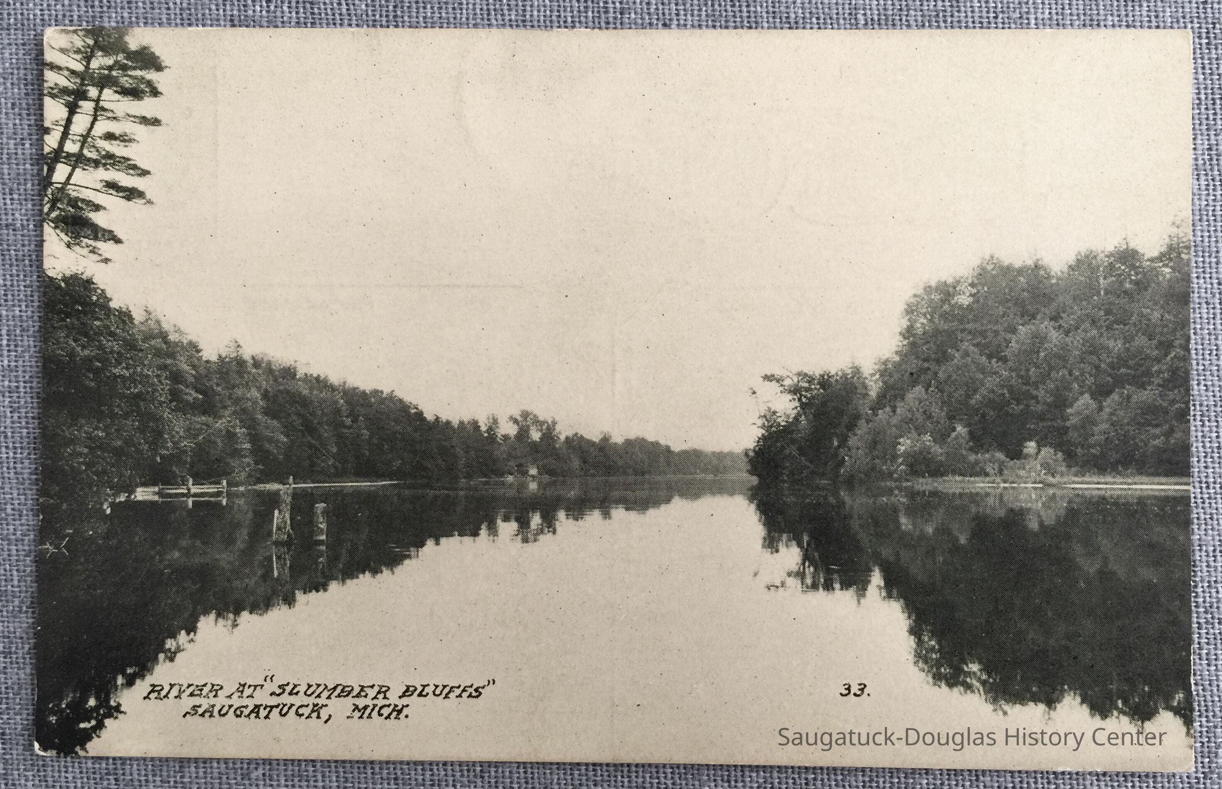 Long view of empty, wide river scene. A lone pine in upper left corner.