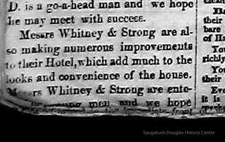 No text file found. Below is OCR scan of document Some twenty years after William G. Butler built his first cabin, the only boarding house in the area was located in Singapore. Visitors to “The Flats” usually stayed with the S. A. Morrison family. According to James E. Sheridan in “Saugatuck Through the Years”, Mrs. Morrison eventually tired of these casual guests in her home and suggested that a commercial establishment be built to house visitors to the village. Mr. Morrison, being an understanding husband and a wise man, persuaded Mr. R. S. Smith, of Battle Creek, a builder and carpenter by trade, to build a hotel here. As an inducement to Mr. Smith, Morrison contributed financial backing and a desirable lot that fronted on Mason St. between Butler and Griffith Streets. Accepting the offer in 1852, Smith proceeded to build a fine and substantial structure, perhaps even a pretentious one, and named it the Saugatuck House. Saugatuck House was a success and relieved Mrs. Morrison of her burden. However, a feature of the Saugatuck not pleasing to the temperance beliefs of the Morrisons was the inclusion of a bar within the hotel. The first chapter in the history of this establishment ended, in Sheridan’s words, “ Certainly the hotel bar made it a more convenient place for those who had a taste for whiskey, a common drink of the times. R. S. Smith had some fame as a frequent imbiber and was one of his own best customers. During a period of intemperance, Smith was drowned in New Richmond in a boating accident. An unkind wit of the day noted that this was a fine example of a victory for water over whiskey... Smith’s heirs sold the Saugatuck House to Whitney and Strong who were proprietors for many years thereafter.” At some point later in its life the establishment was renamed Hotel Hamilton. In 1913, the building was dismantled to make way for the Parrish Drug Store building which is today the home of the Saugatuck Drug Store.