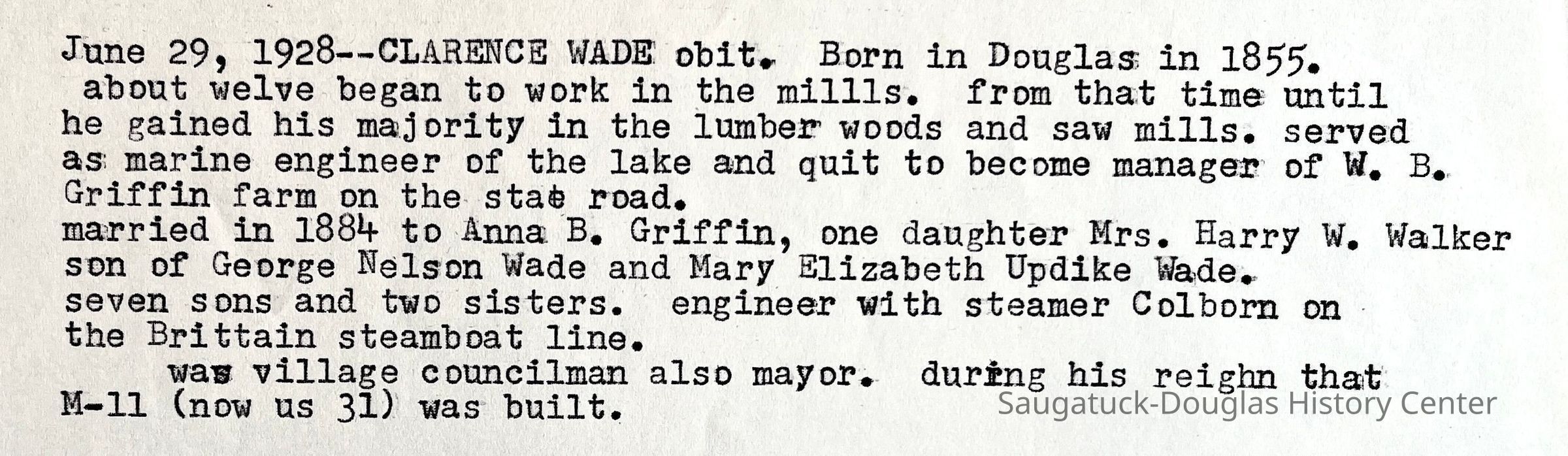 Wade, Clarence W. 1855-1928Wade, Fred 1862-1933Wade, Ida (Nies) 1865-1903Wade, Anna Bell (Griffin) 1862-1935Walker, Adelaide Elizabeth (Wade) 1885-1932