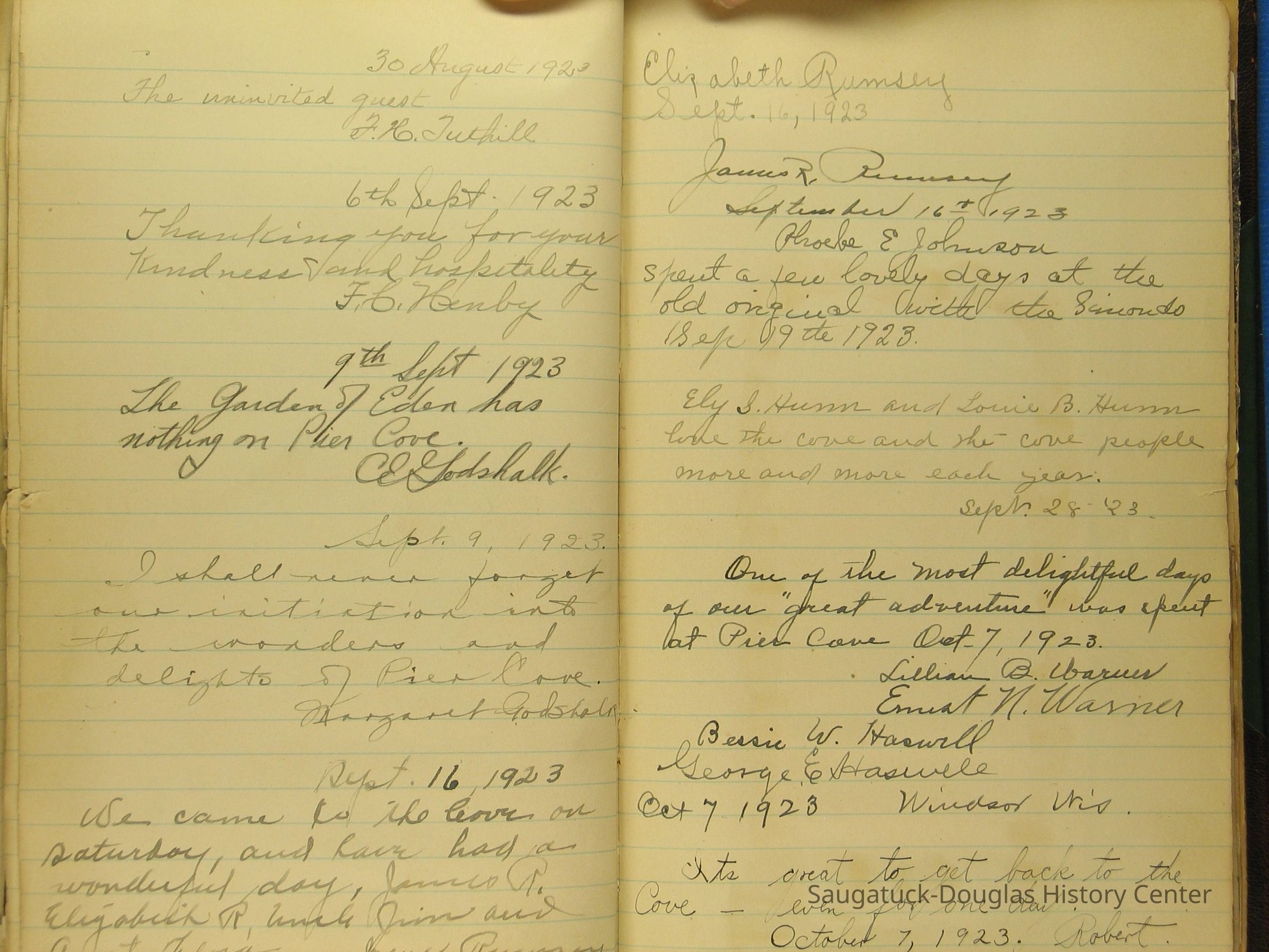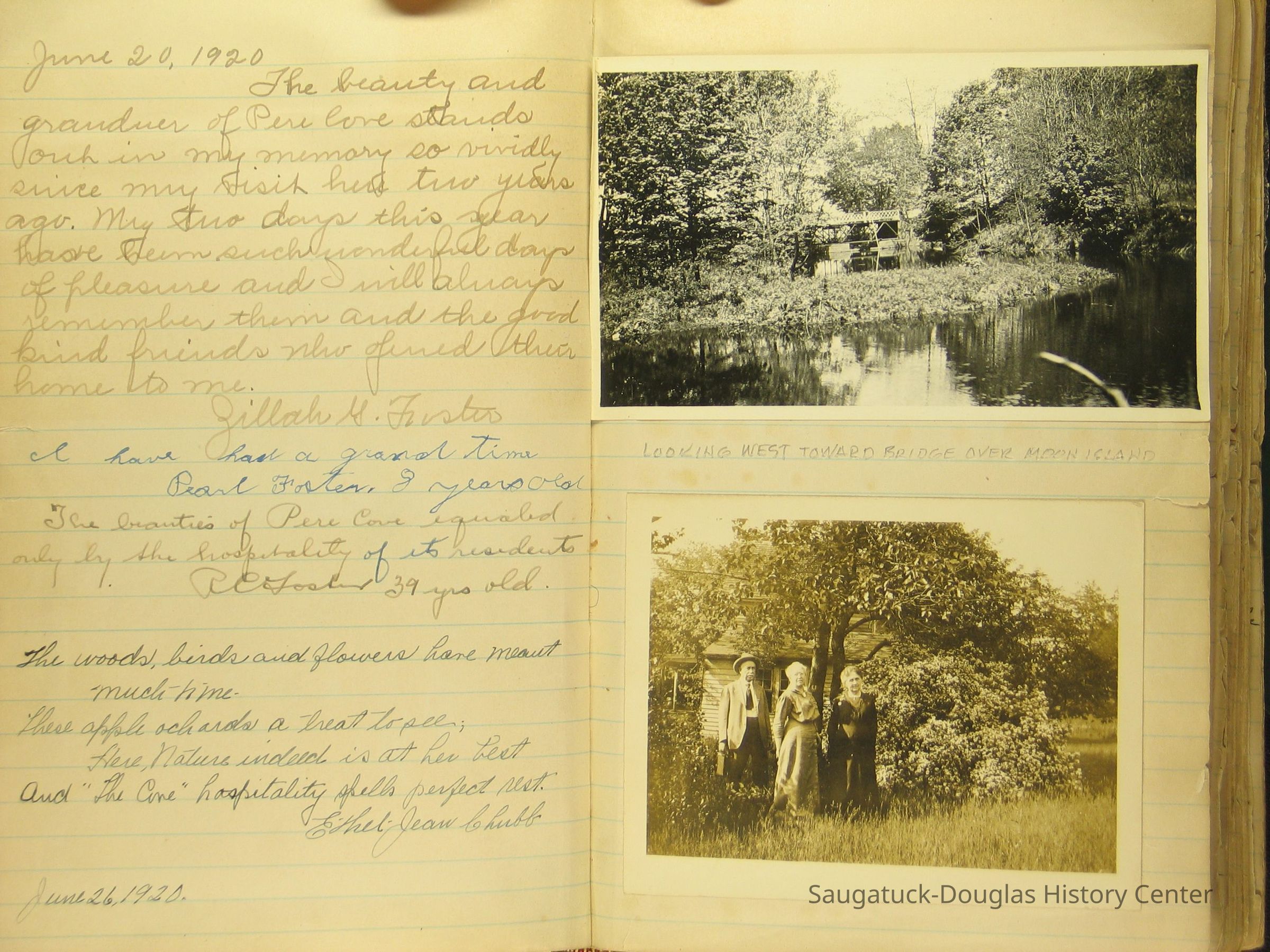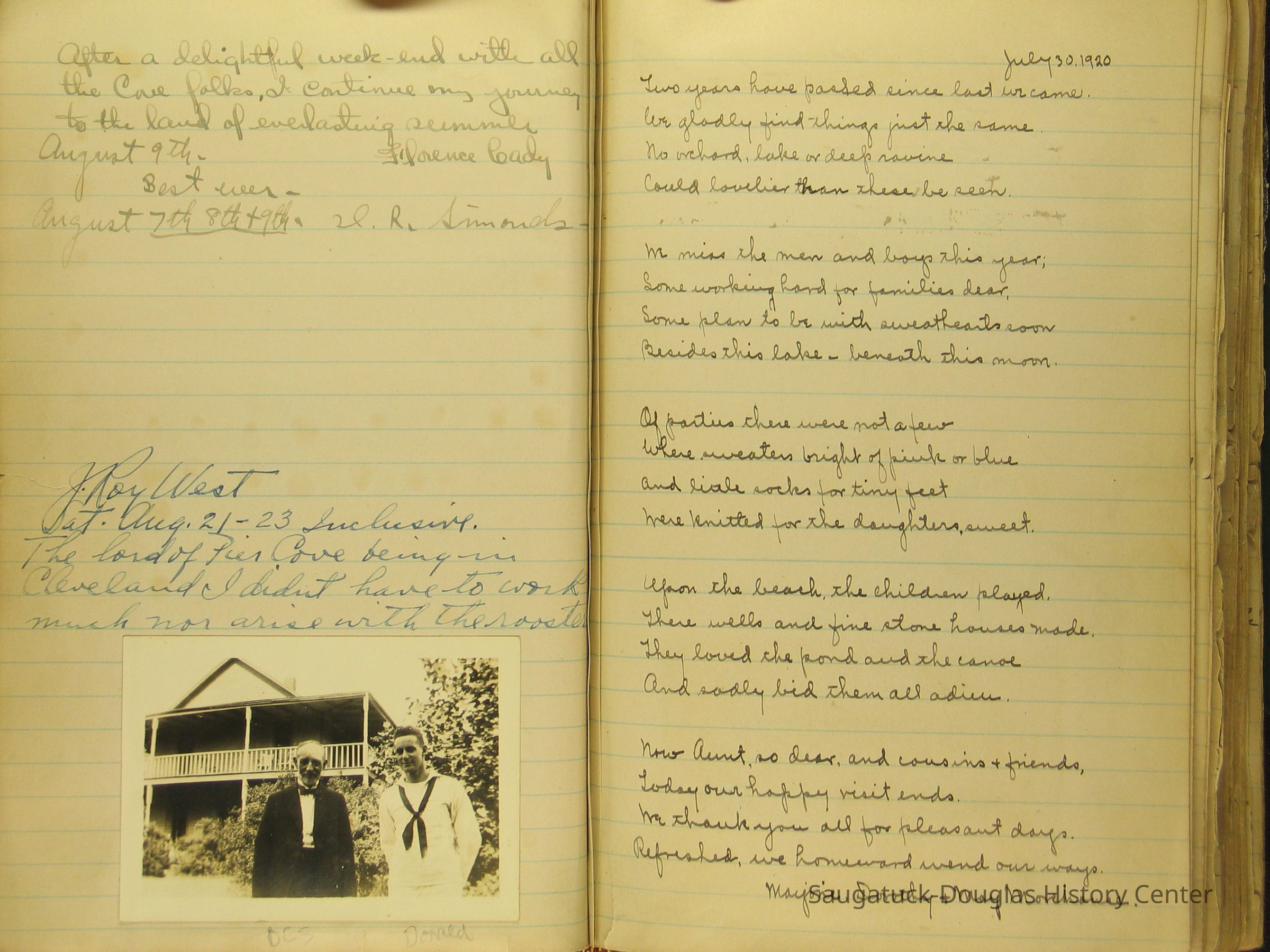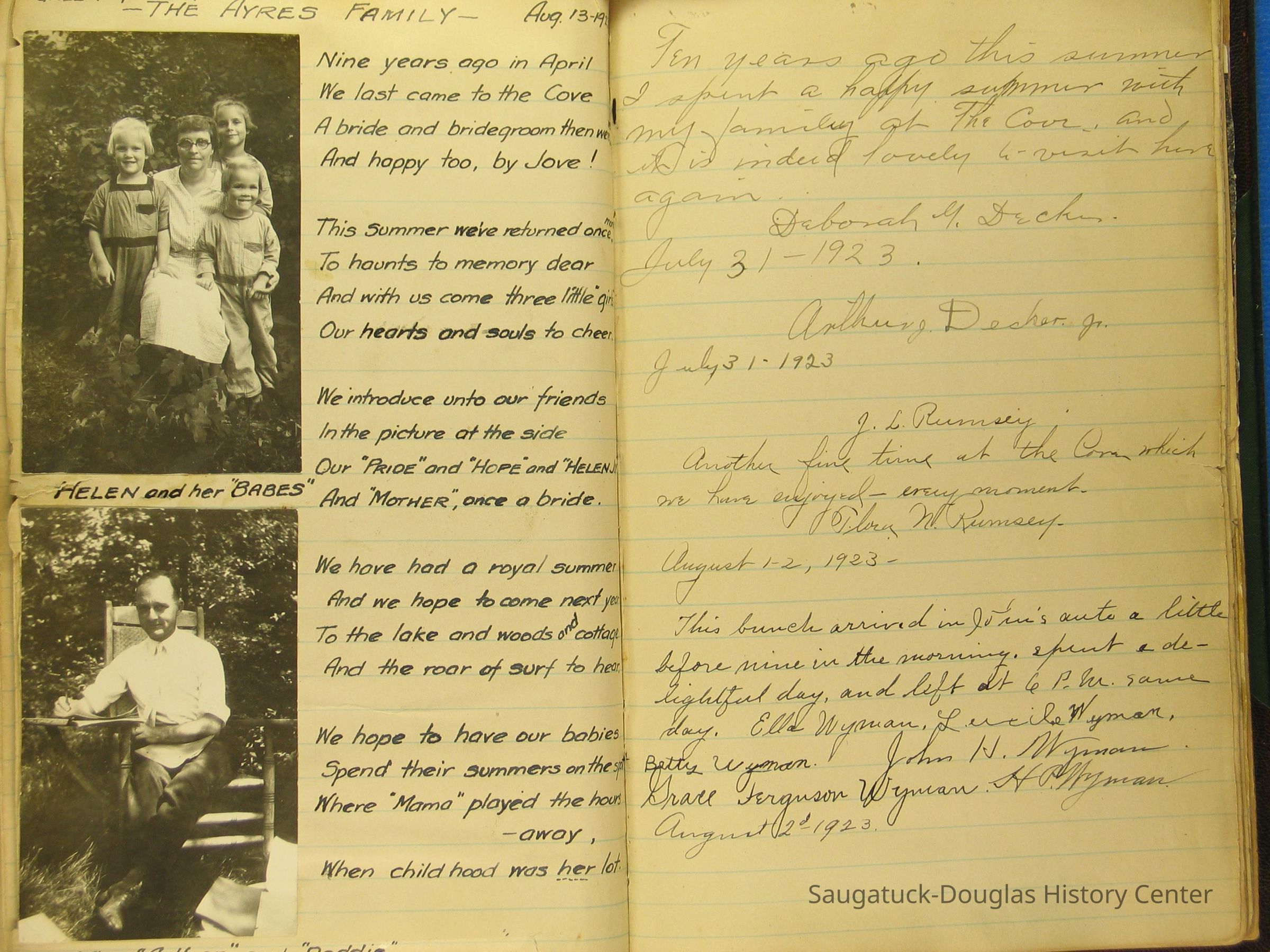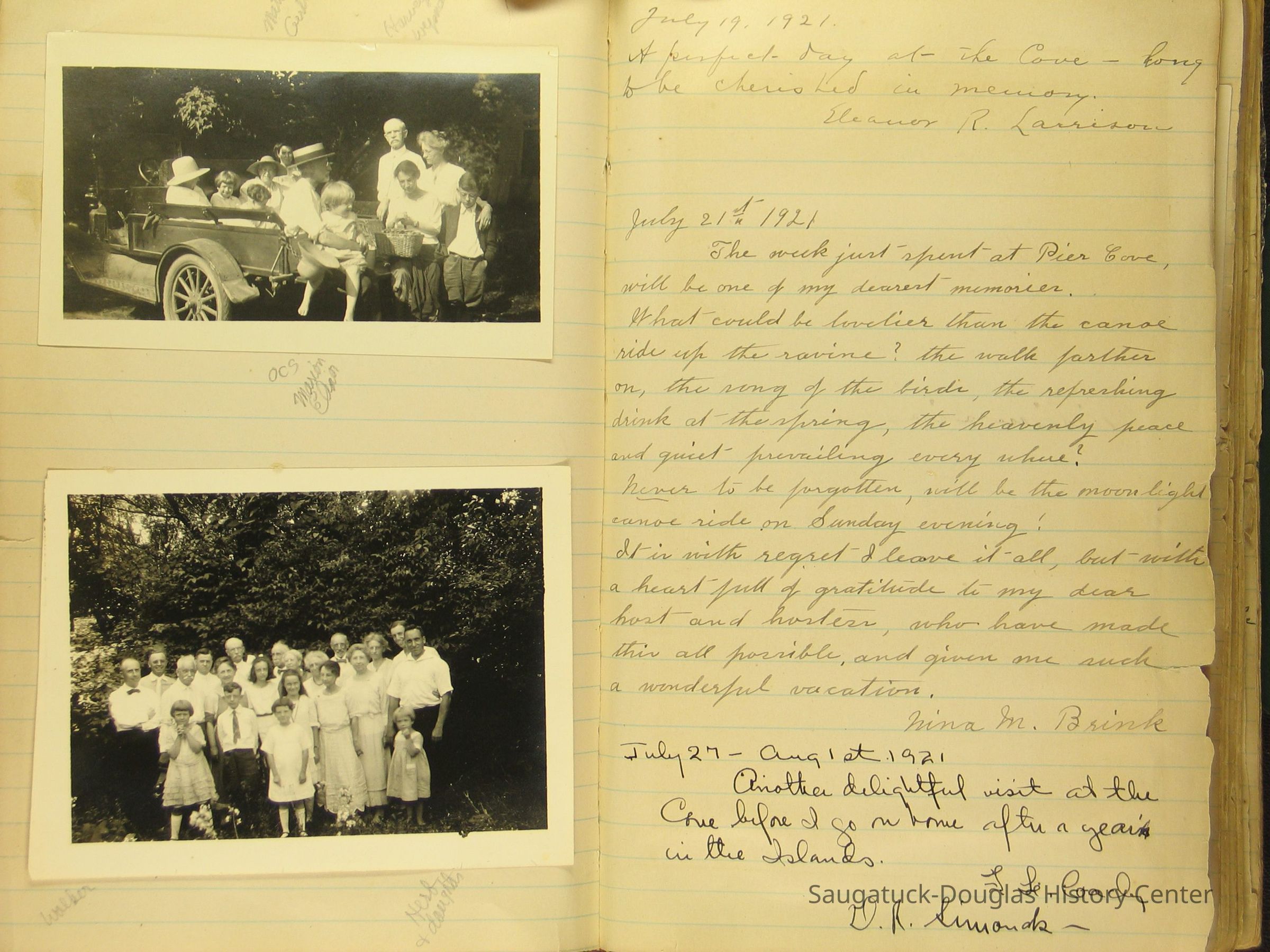 Photos of Pier Cove locations, cottagers and their activities plus notes, poems, newspaper clippings and sentiments written by guests, family and neighbors.