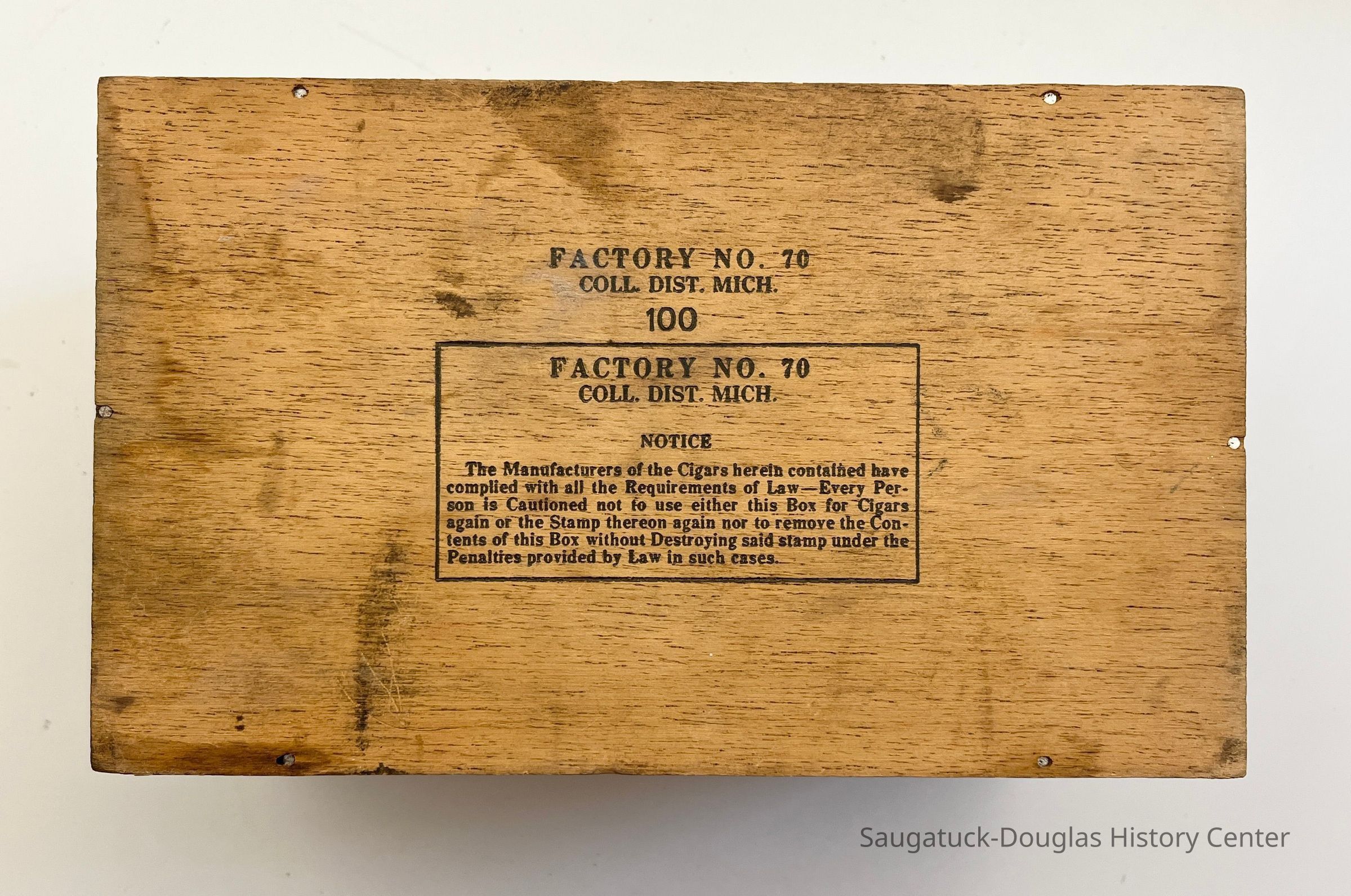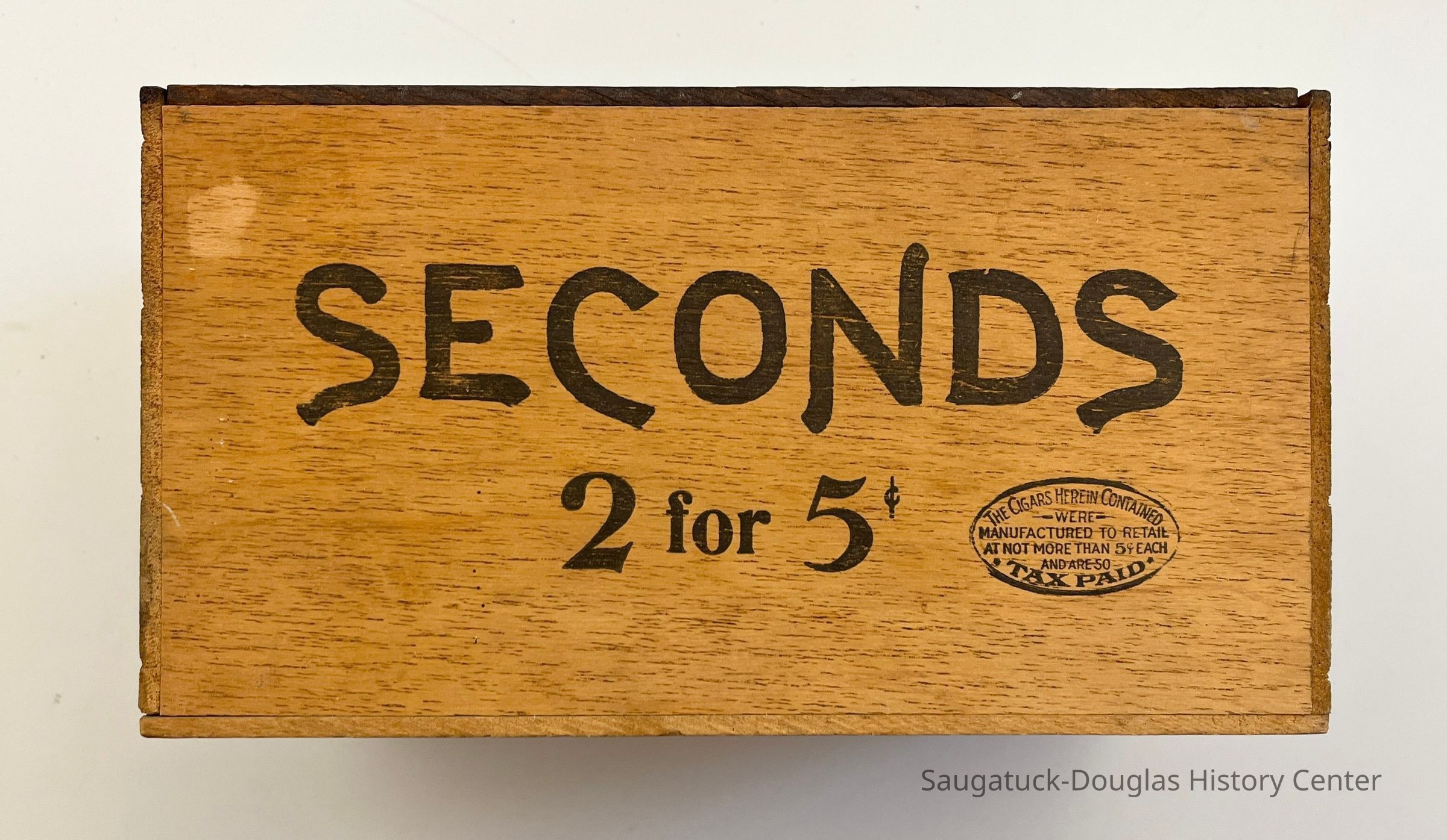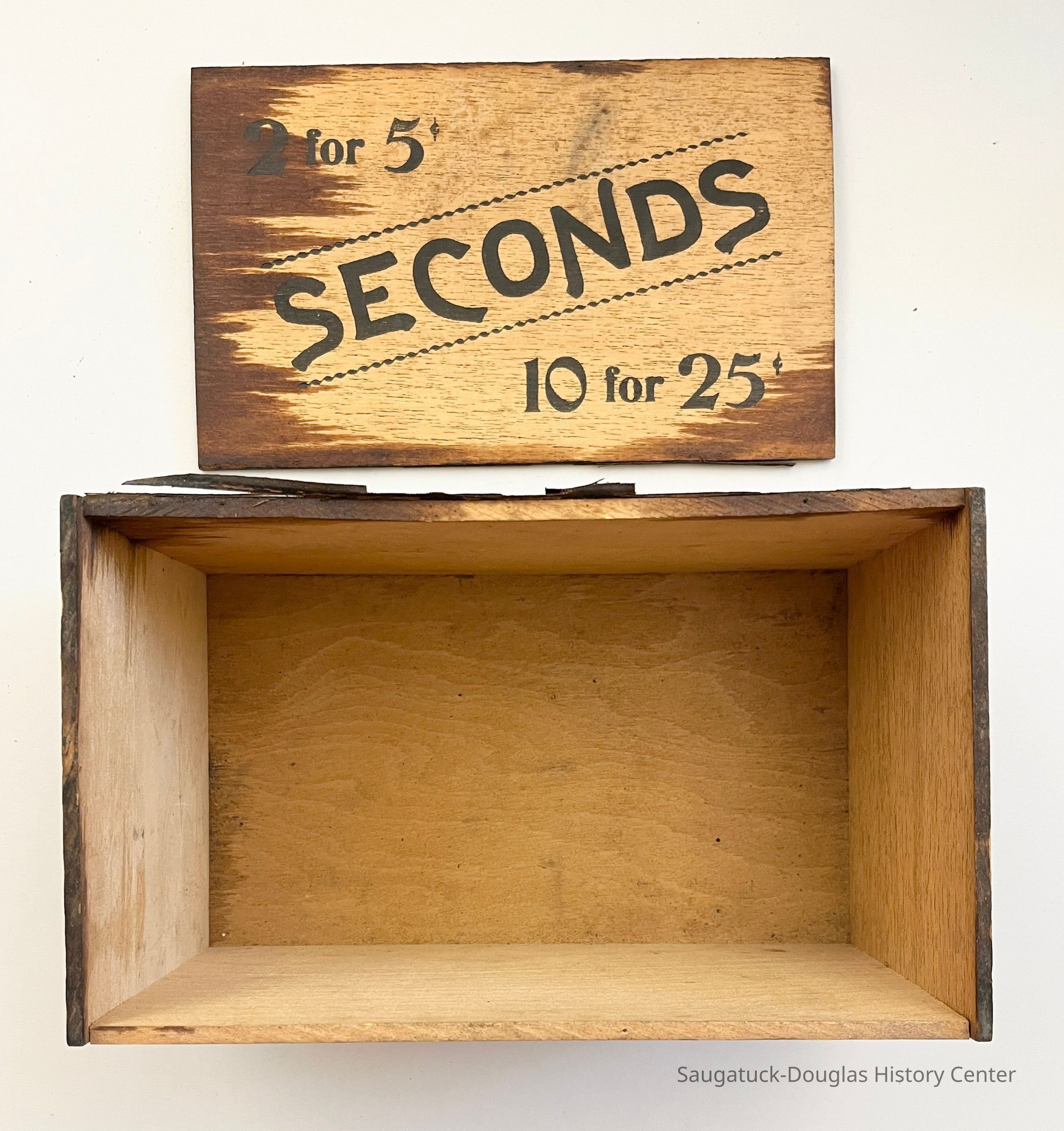 Box B. Seconds 2 for 5 cents 9 x 5 x 5.5 inches. Lid detached. Stamped on bottom of box "Factory No. 70, Coll. Dist. Mich. 100"