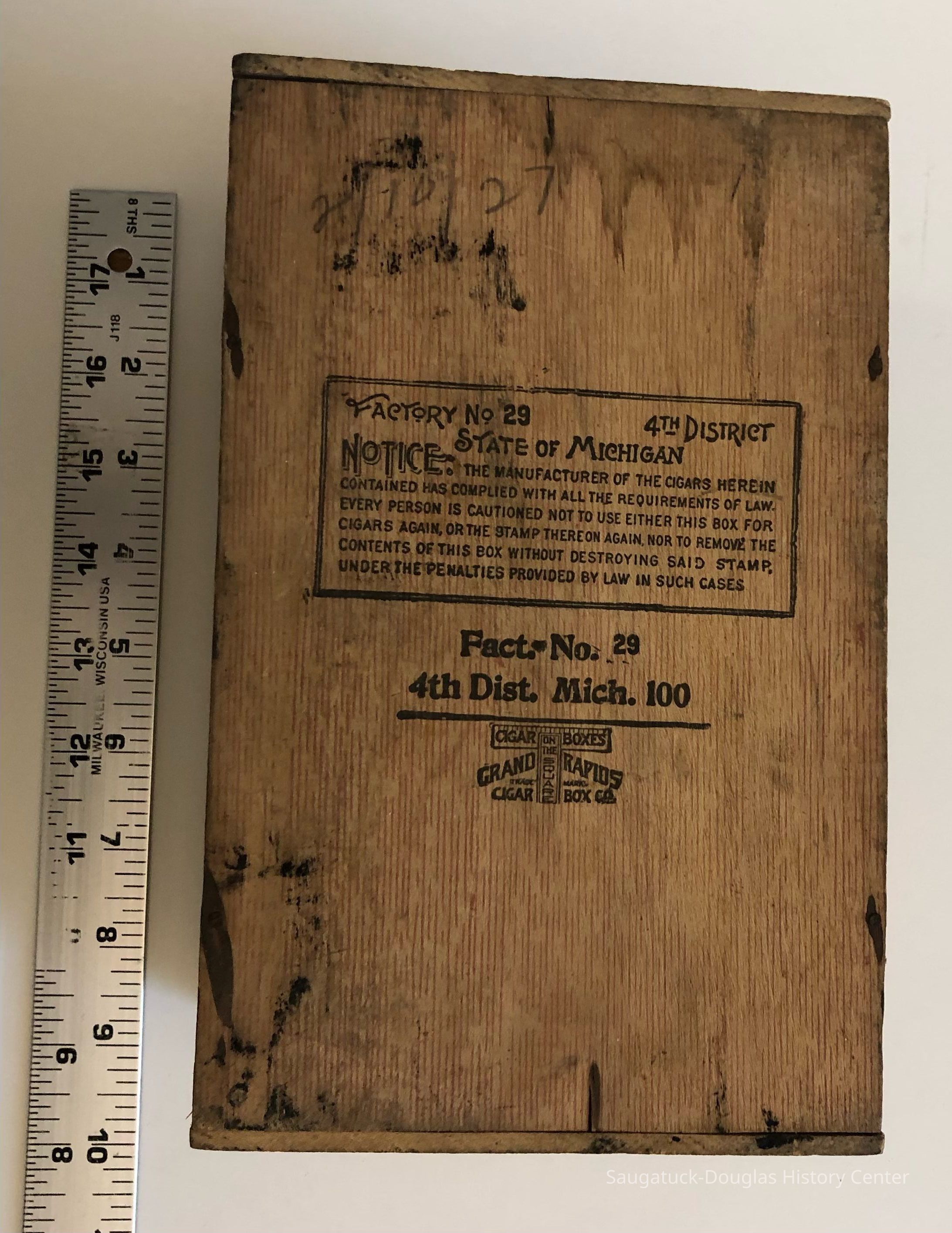 Two wooden cigar boxes with stamps and marking indicating a Michigan connection.