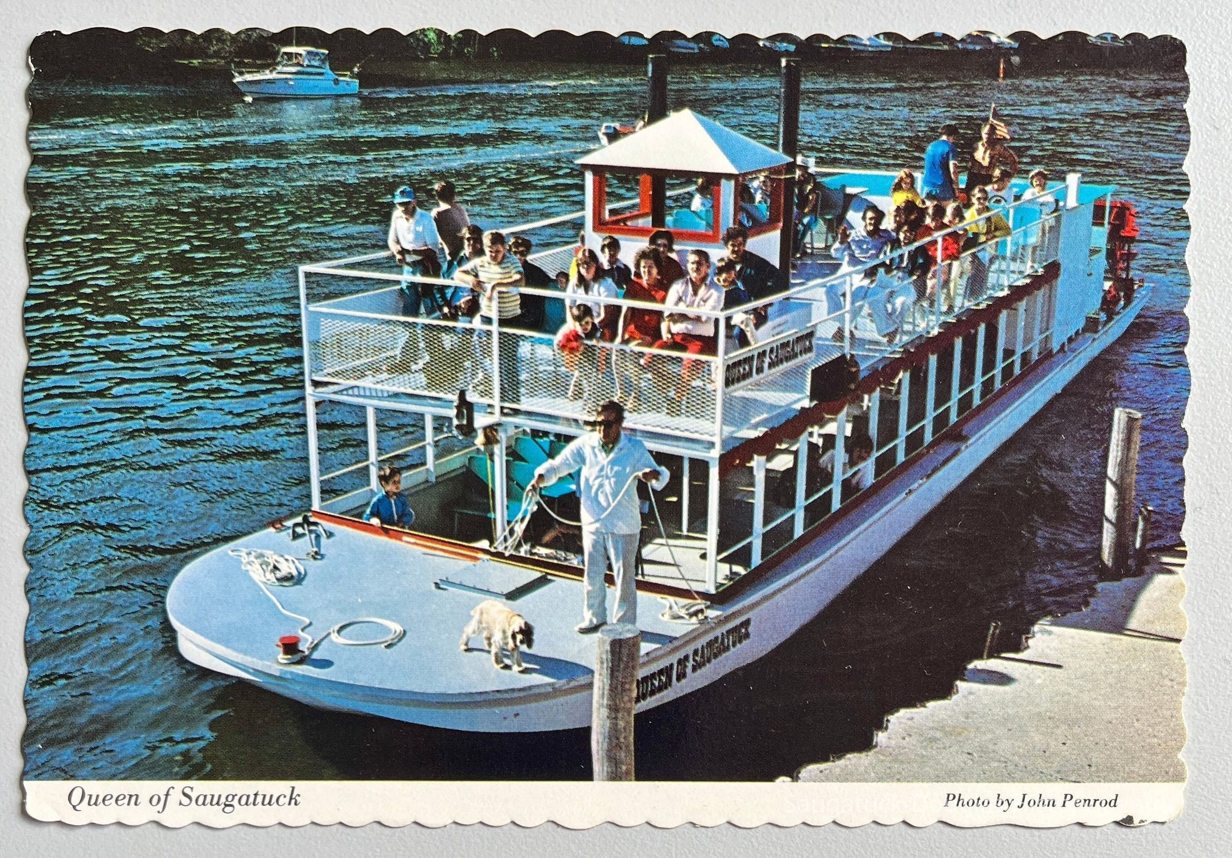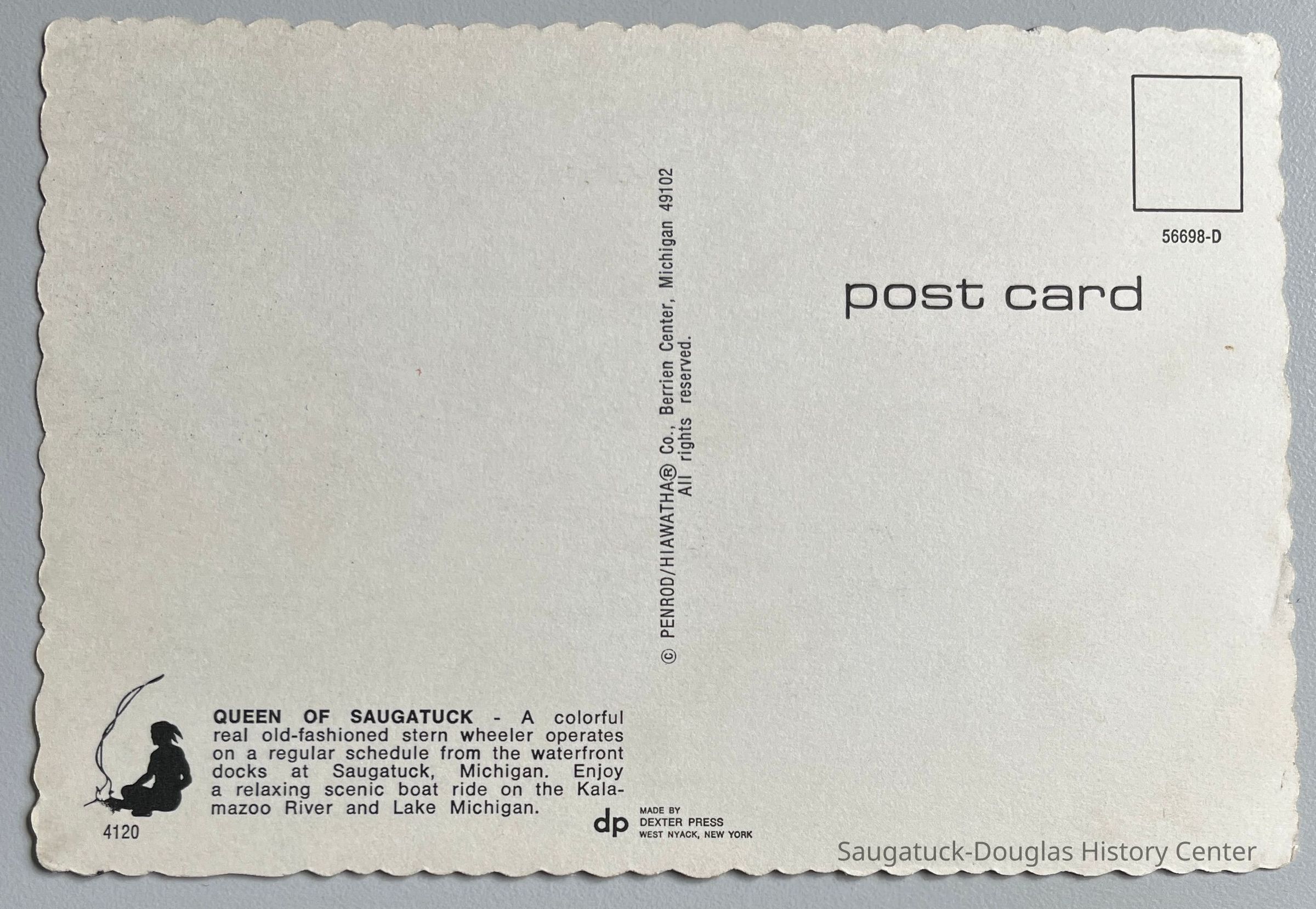 Scalloped-edge color postcard with photo of a rear-mounted paddle-wheel excursion boat loaded with visitors. A man dressed in white holds the ropes on the bow along with a Gleason or Starring-family spaniel dog. Un-mailed card with photo caption "A colorful real old-fashioned stern wheeler operates on a regular schedule from the waterfront docks at Saugatuck, Michigan. Enjoy a relaxing scenic boat ride on the Kalamazoo River and Lake Michigan."