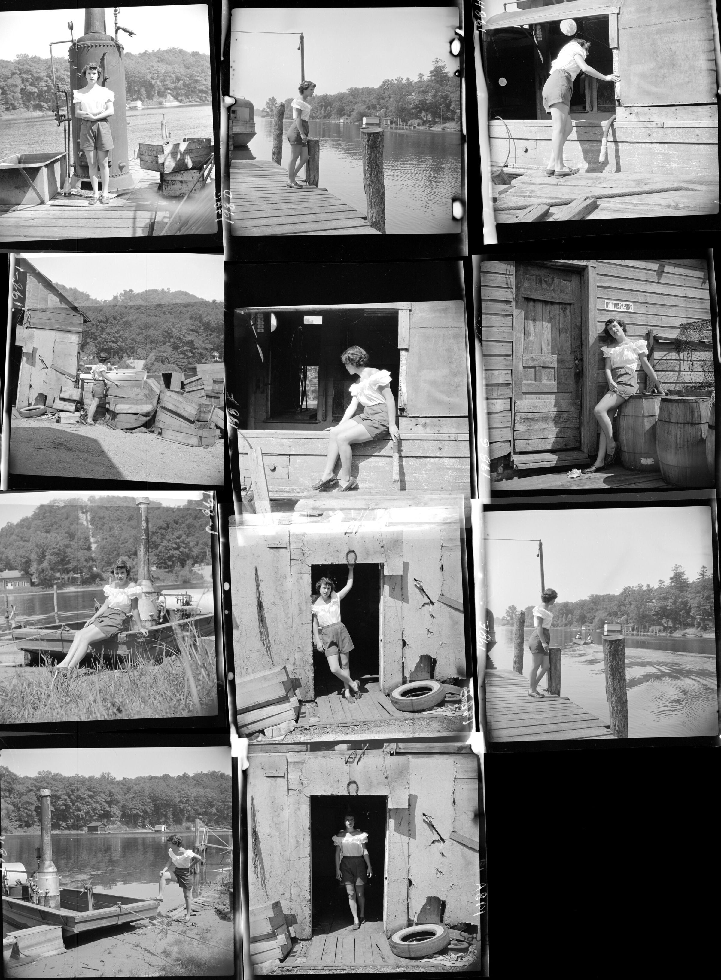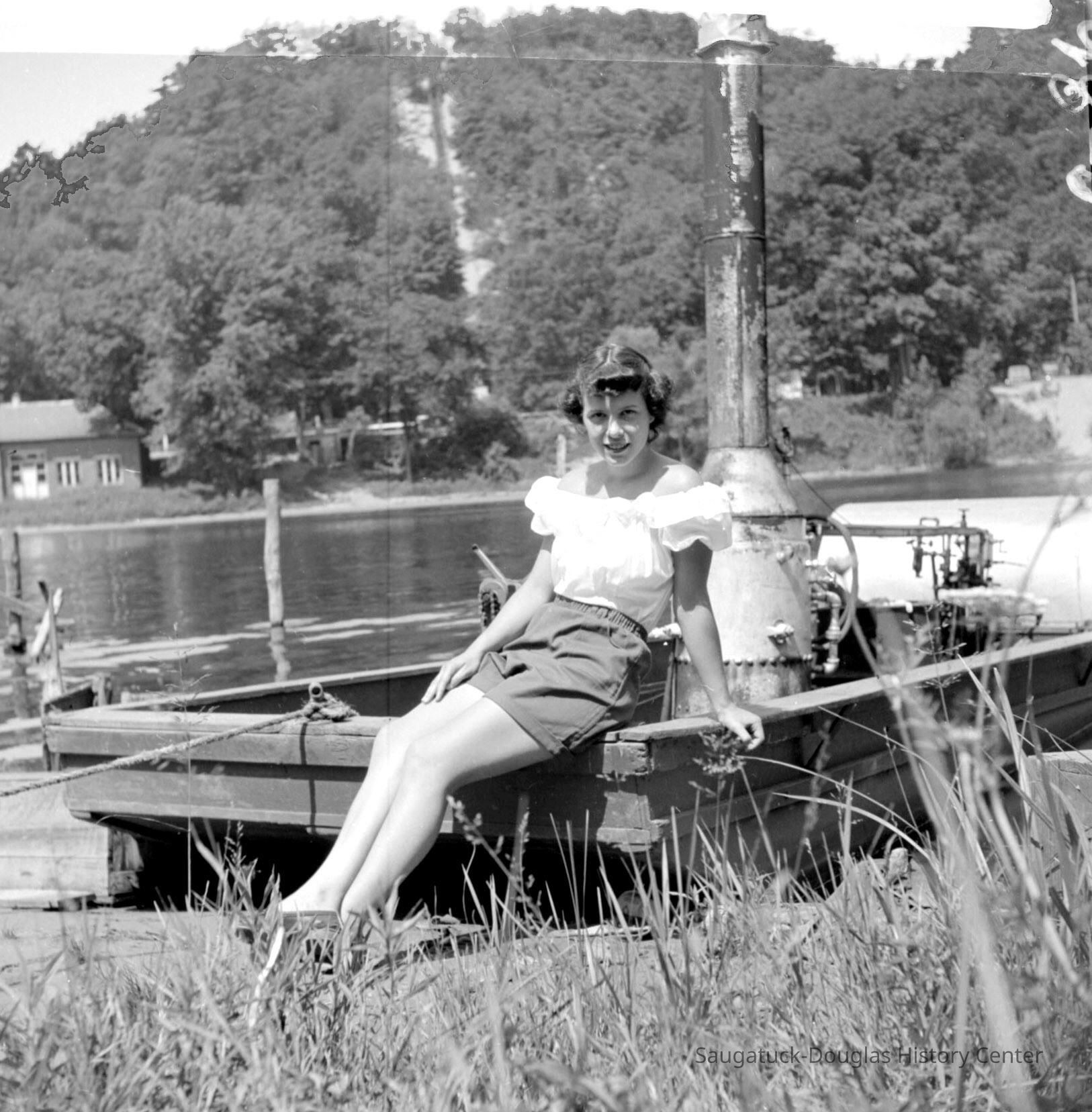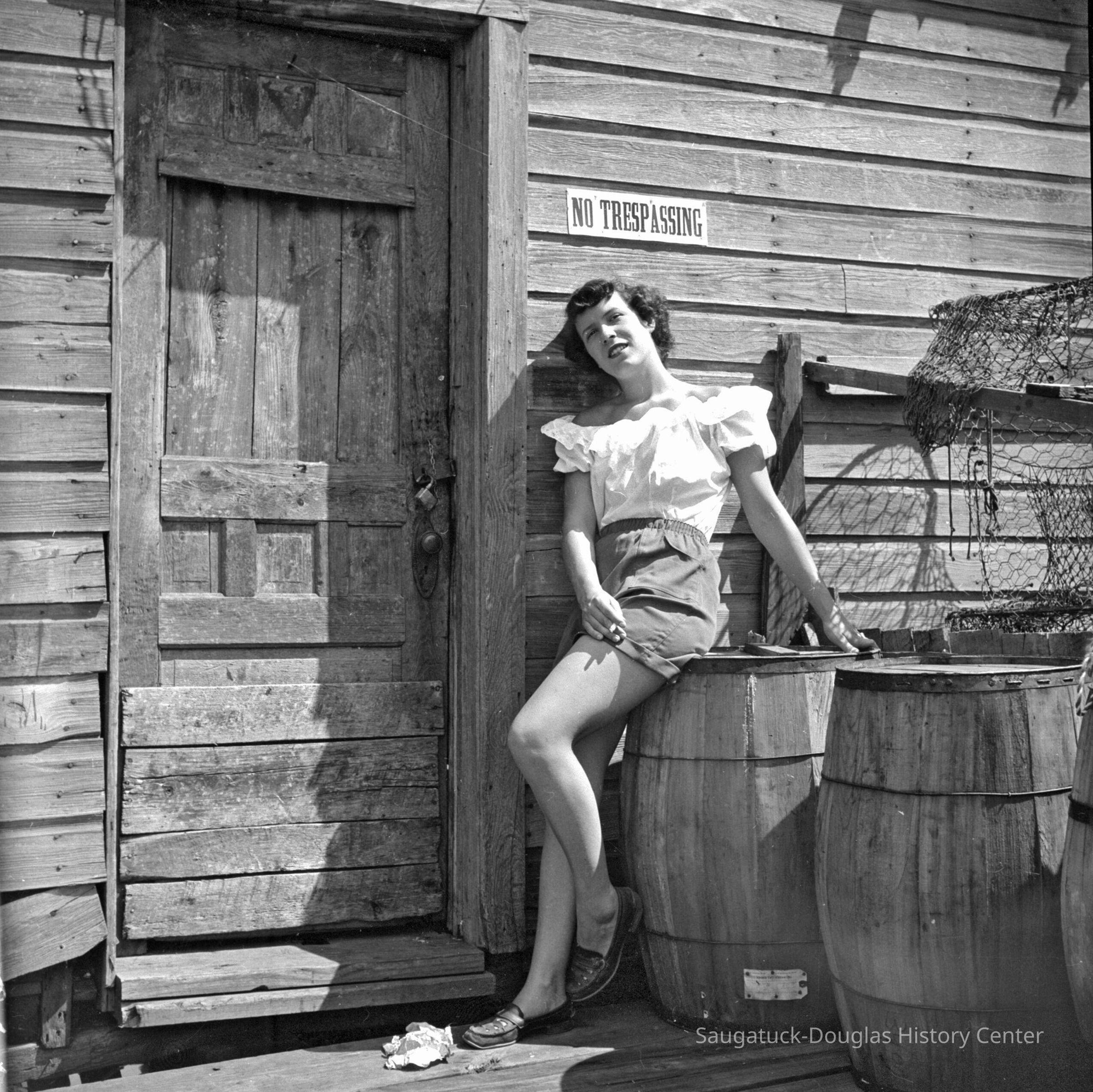 A young lady, possibly named Marged, in shorts and an off-the-shoulder frilly top, poses at the Sewer's docks and tugs.