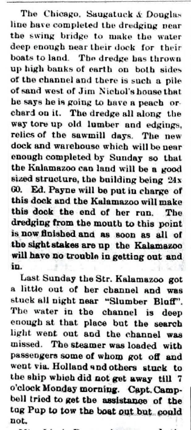 This image was featured as History Mystery #115 with the text: The steamer Kalamazoo was stuck near here in August 1906 Commercial Record. Slumber Bluff was located on Riverside Drive. Today it is the site of the Pine Trails Camp.