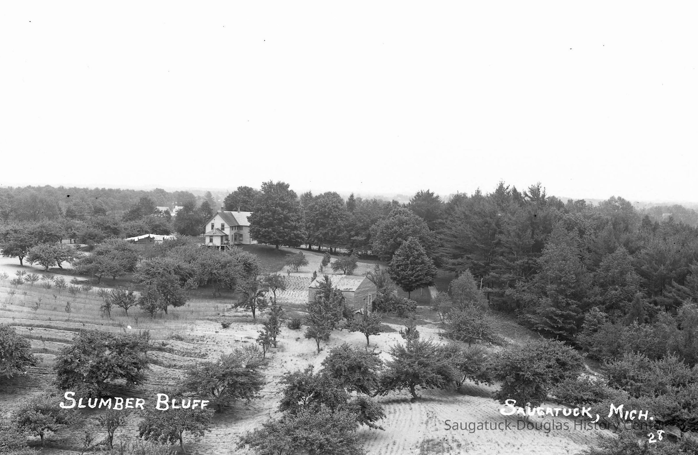 A 2-story farmhouse sits on rolling, sandy land that has been cultivated and is dotted with orchard trees. The photo, likely taken by Herman Simonson studio, is labeled "Slumber Bluff 28"
