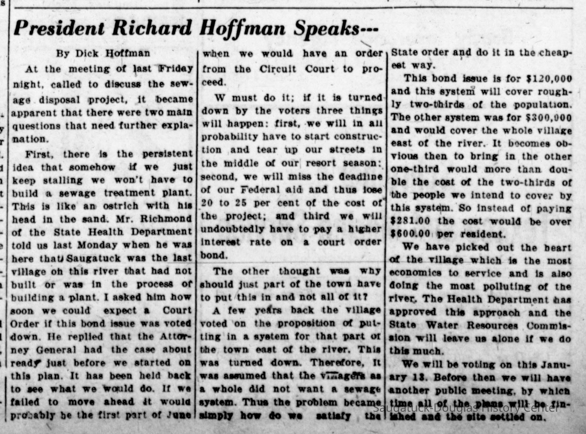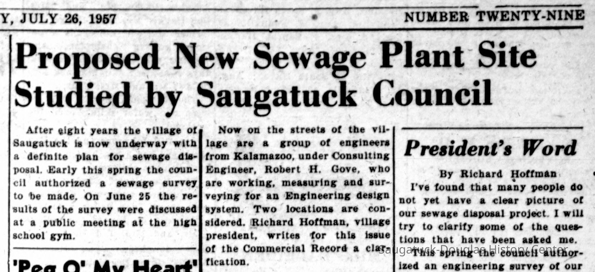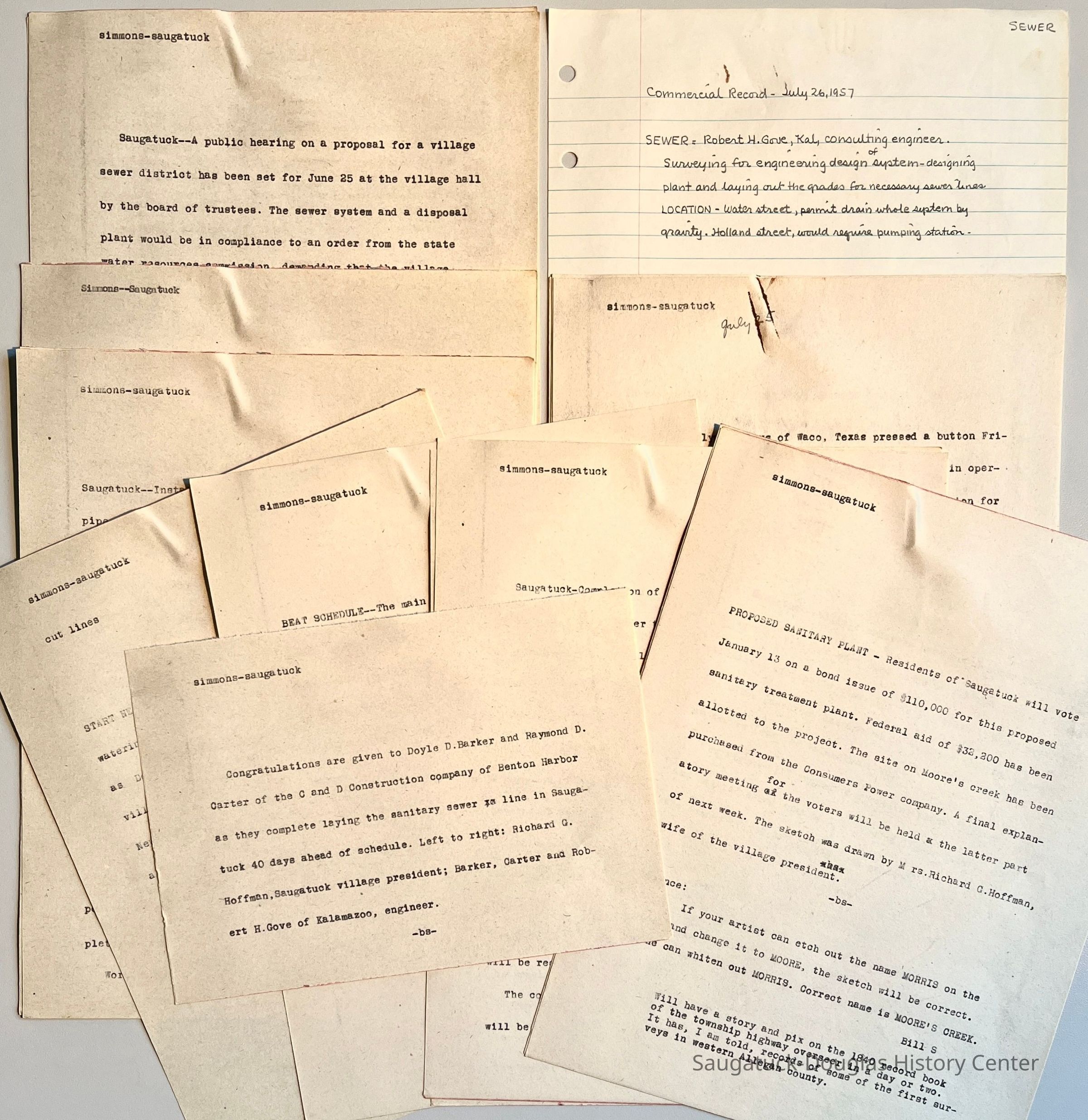 Ten news stories drafted by Bill Simmons, Commercial Record editor, tracking development of Saugatuck's municipal sewer system. The stories are undated but written prior to 1966. The text may or may not have appeared in the paper or were edited significantly before publication.