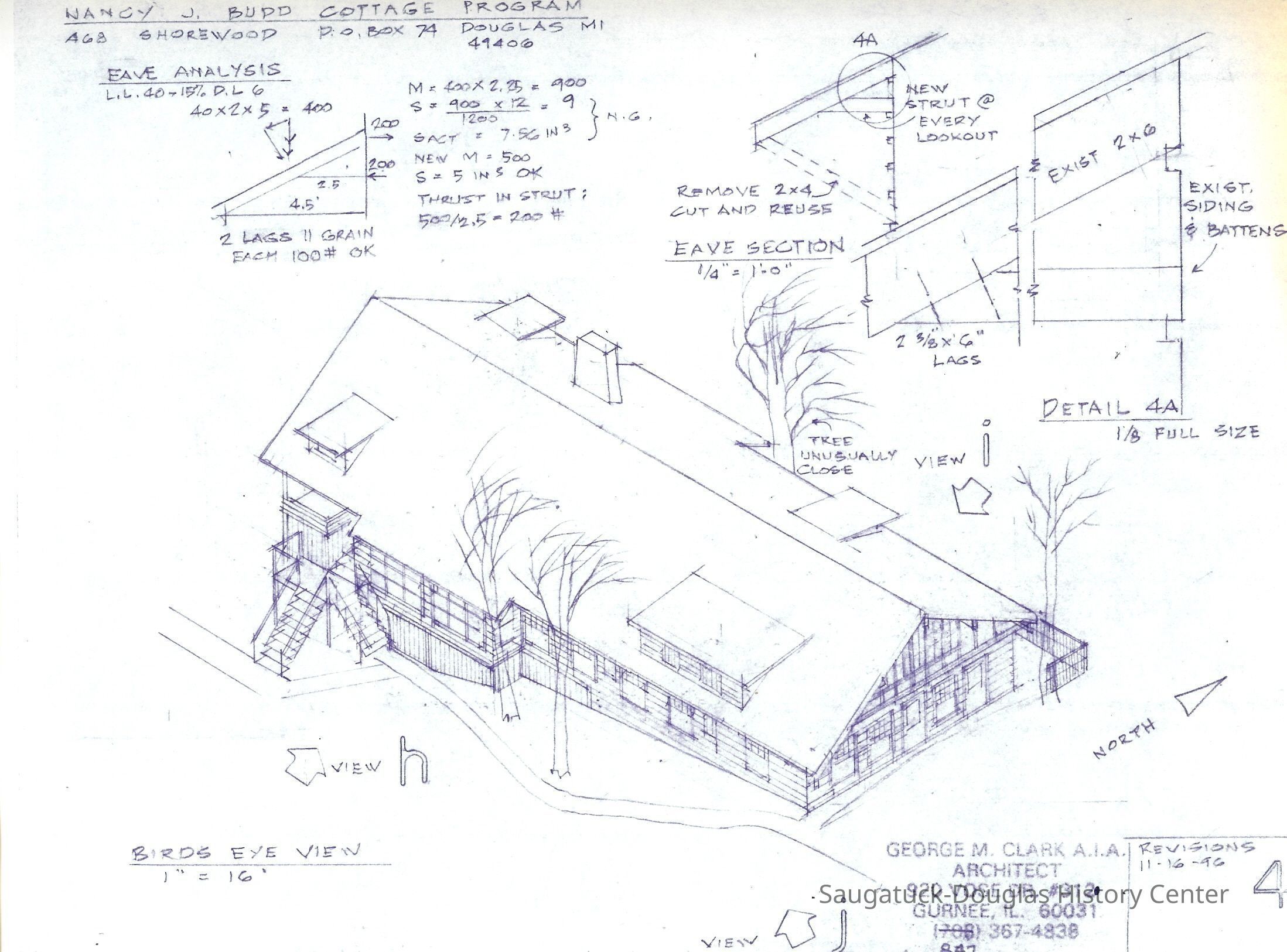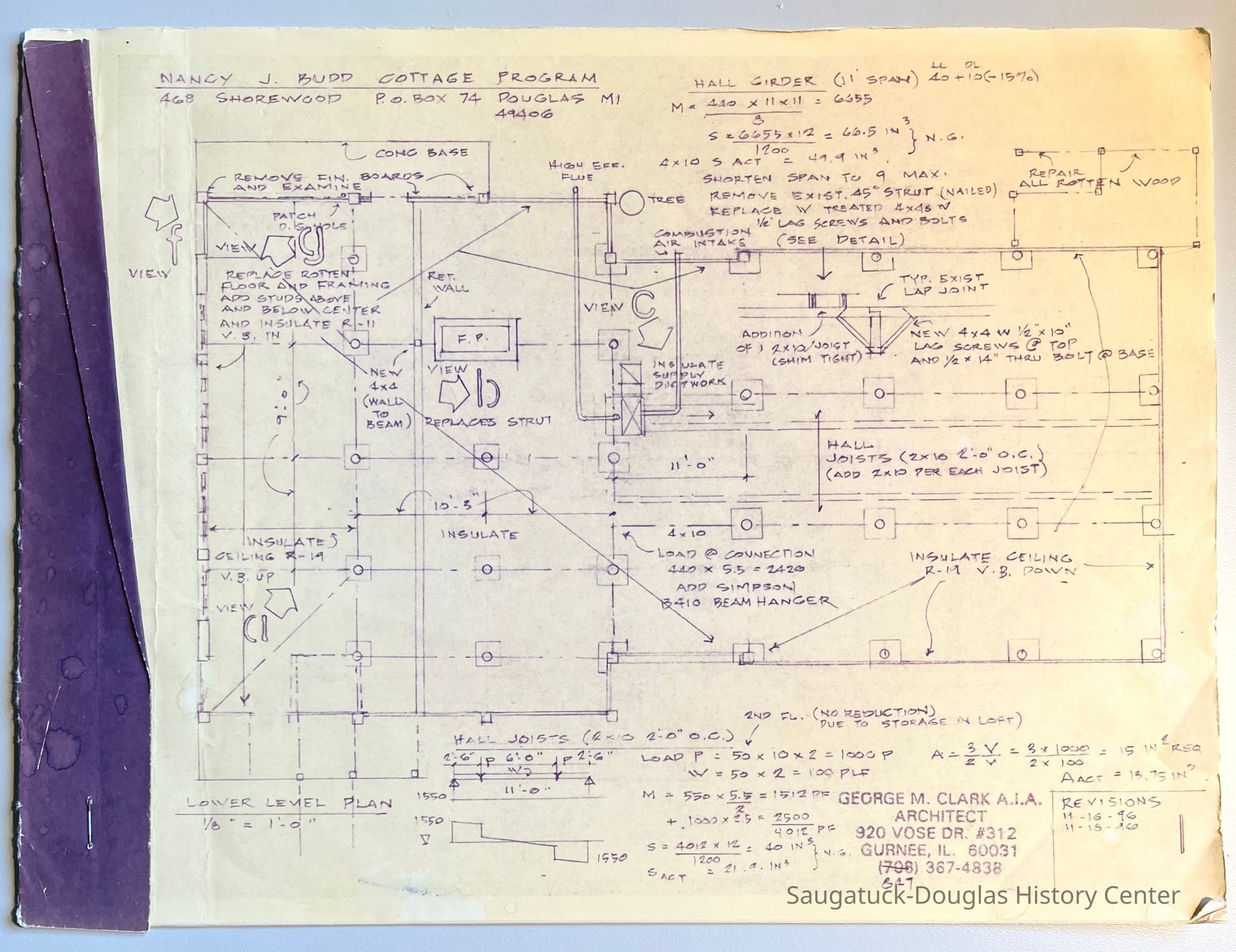 Architectural plan for the Nancy J. Budd Cottage at 468 Shorewood prepared by George M. Clark. The seven-page, purple-colored blueprint is staple bound and includes floor plans, projections and photographs.