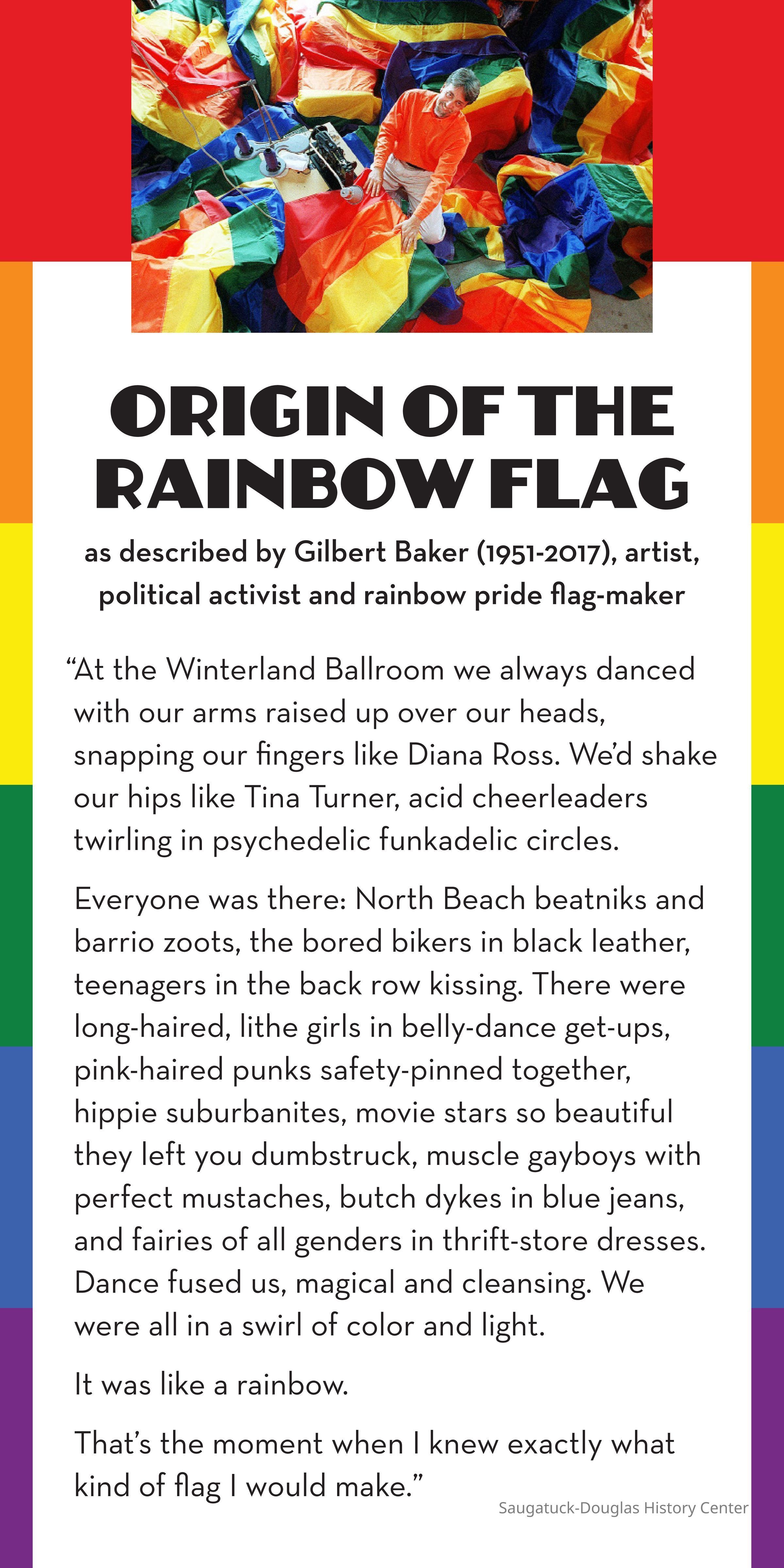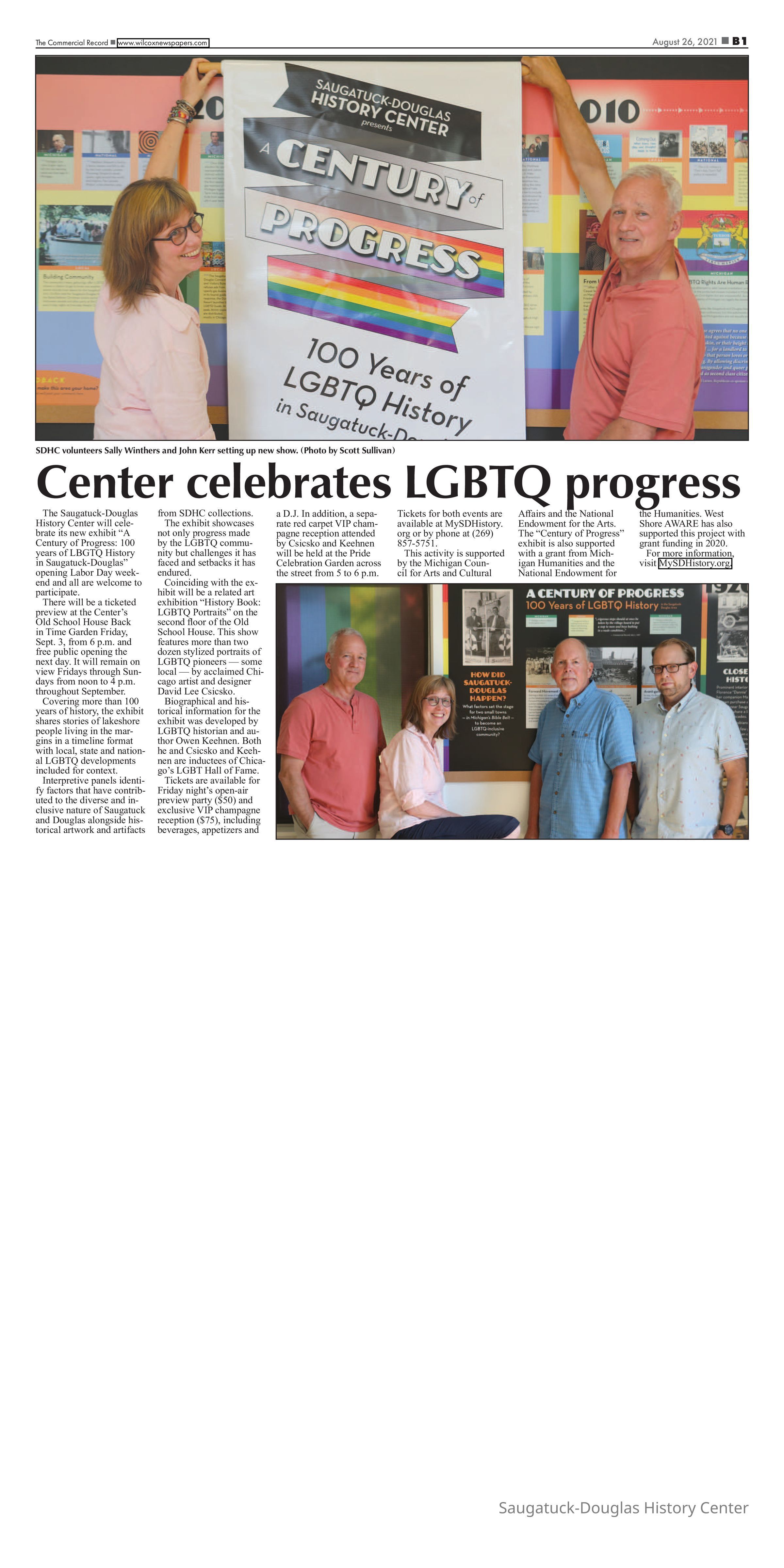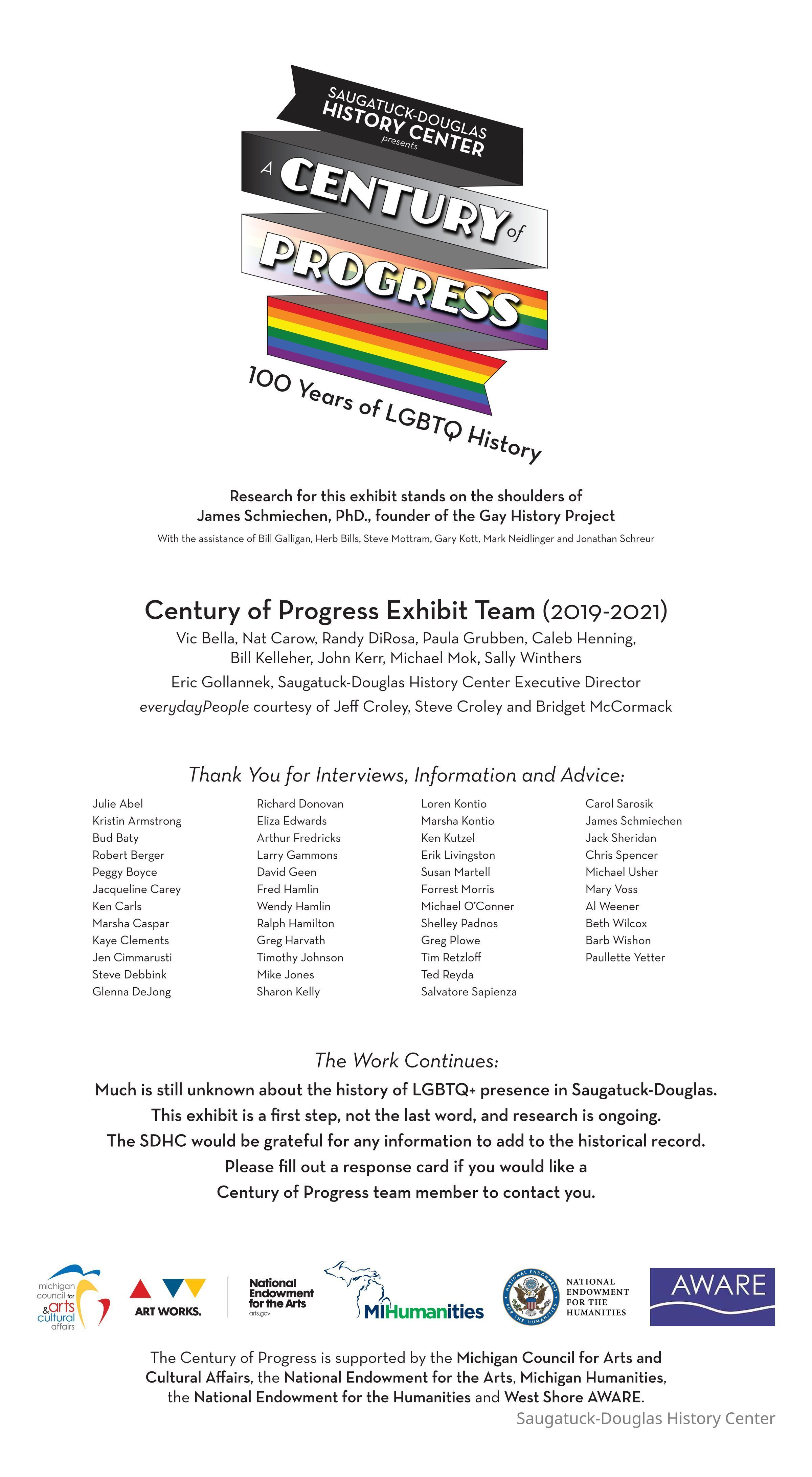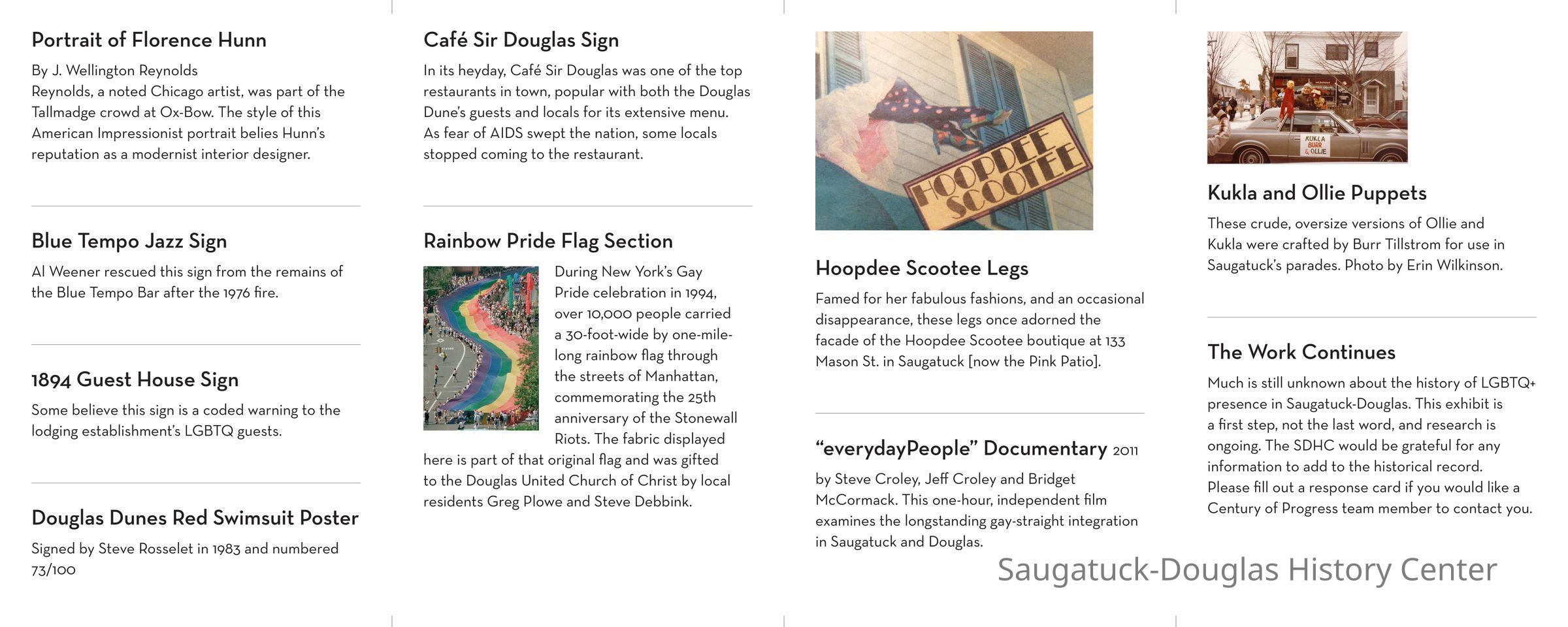 From the SDHC website: Covering over 100 years of history, the exhibit shares the stories of people living in the margins at the Lakeshore in a timeline format with local, state, and national LGBTQ developments included for context. Interpretive panels identify factors that have contributed to the diverse and inclusive nature of these two small Lake Michigan coastal villages alongside historical artwork and artifacts from SDHC collections. The exhibit showcases not only the progress made by the LGBTQ community, but also the challenges it has faced and the setbacks it has endured.