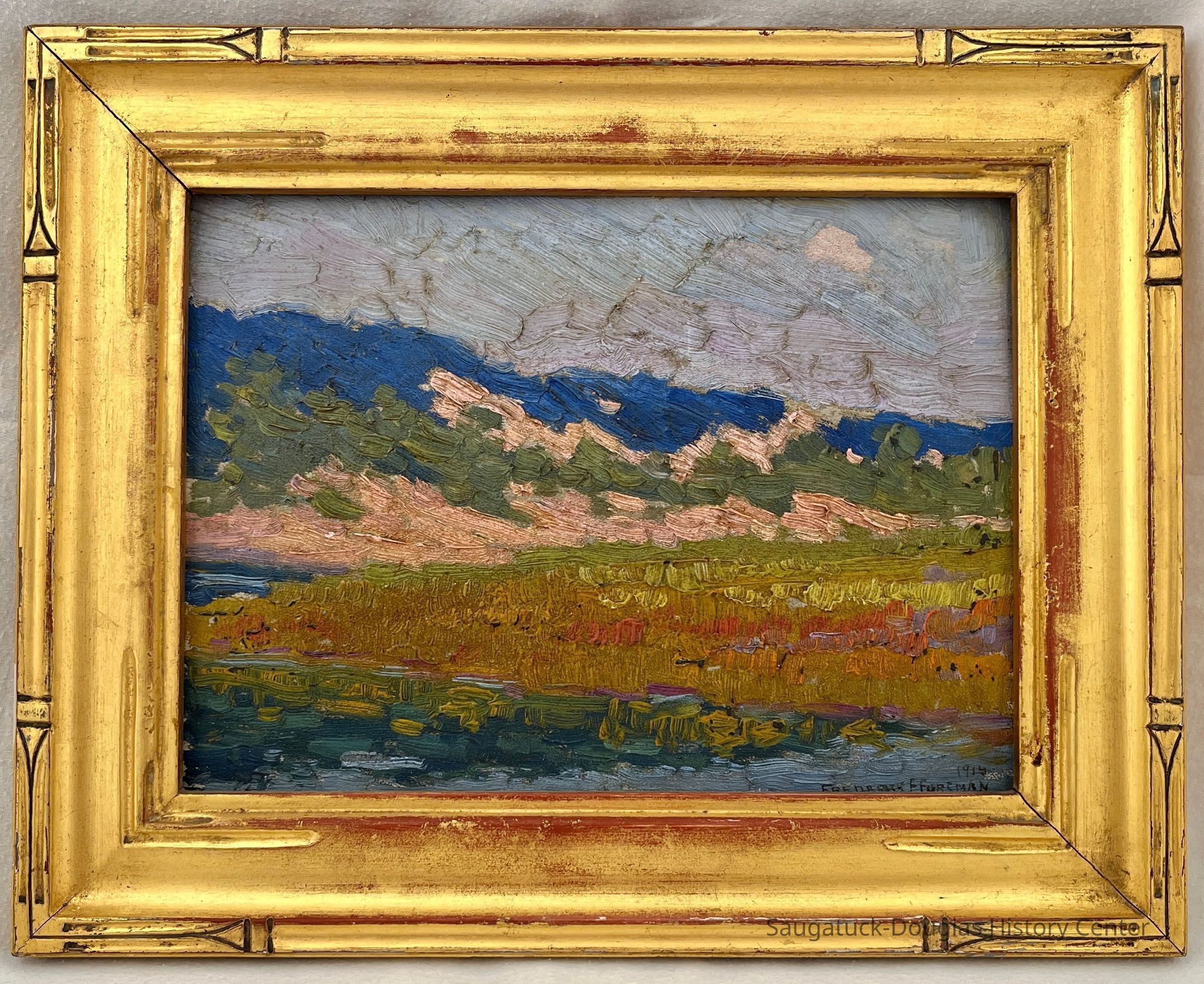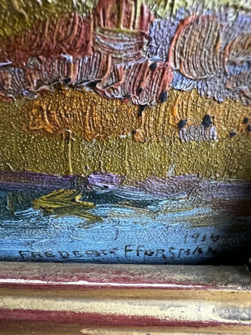 2023 auction description: 1914 Untitled oil painting on board by Frederick Frary Fursman (1874-1943). Signed Frederick F Fursman, dated. Approx. 9"x11" OA; 5.75"x8" SS. Back matting shows wear. Piece has not been removed from frame for examination. Part of a Saugatuck/Douglas Art Collection.