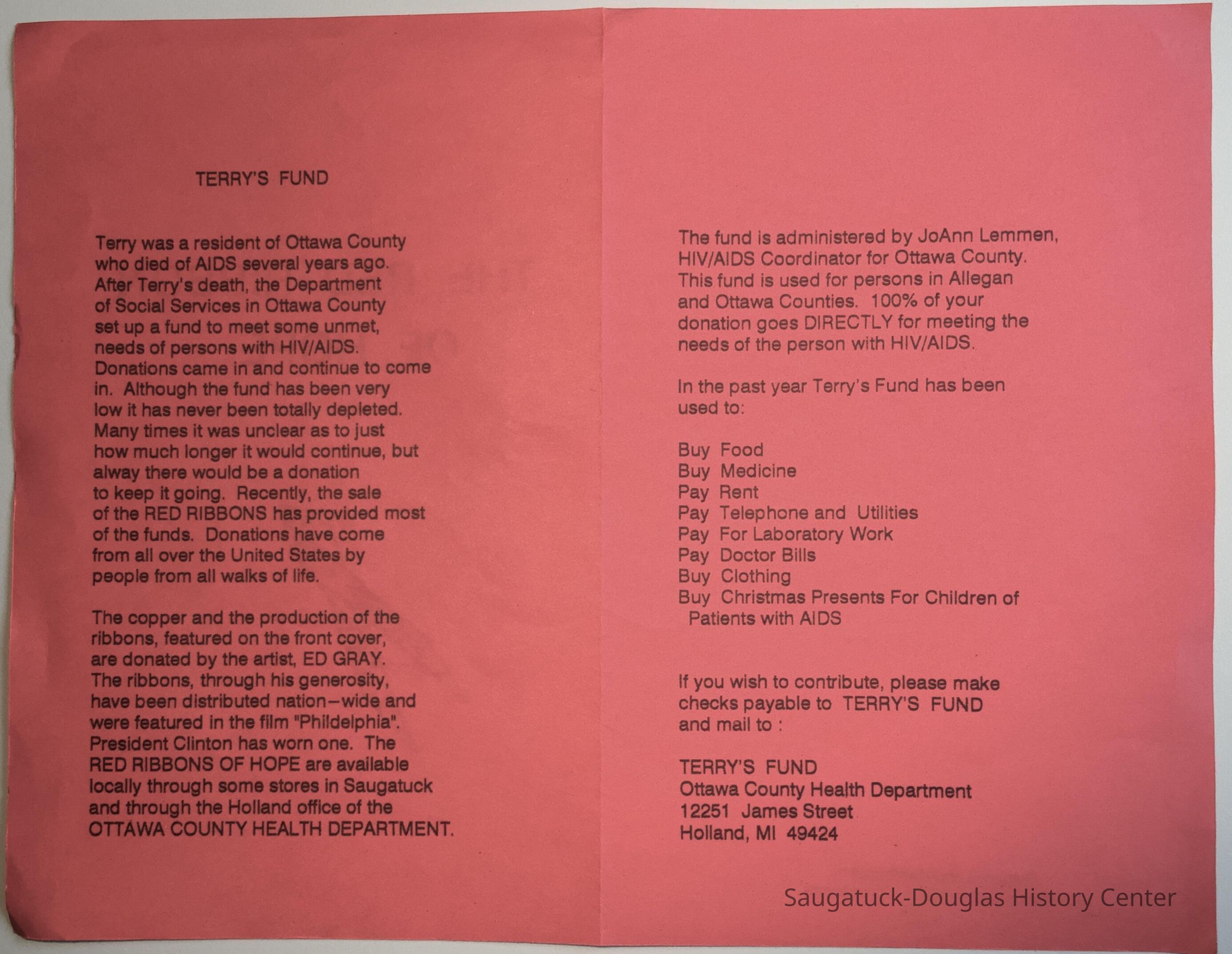 Appeal from the Ottawa County Health Department for donations to "Terry's Fund" to meet the needs of persons with HIV/AIDS. The text mentions the artist Ed Gray, the film "Philadelphia," and that the fund was administered by JoAnn Lemmen.