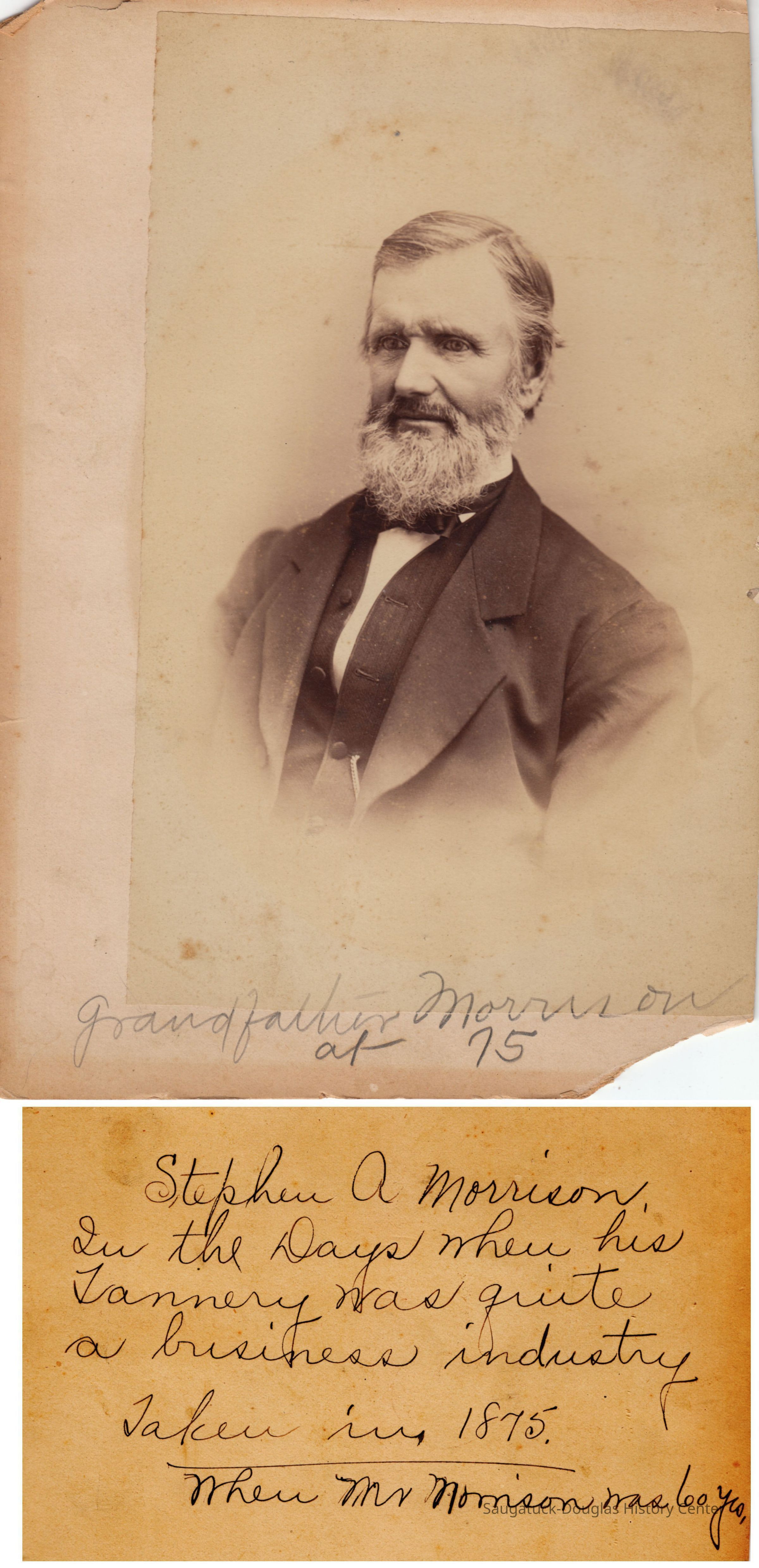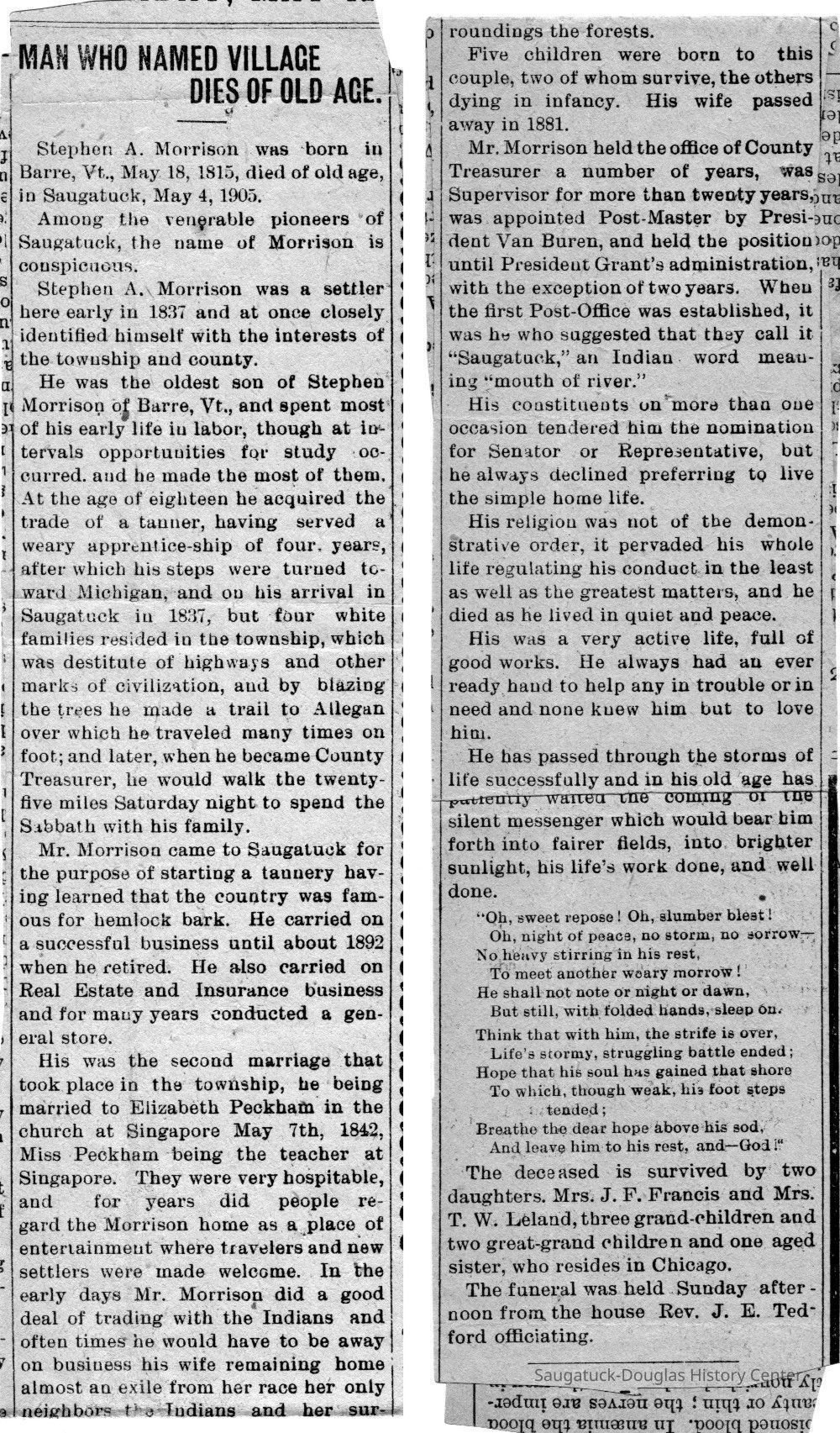 Mr. Morrison, the third non-indigenous person to settle in the place that would come to be known as Saugatuck, was a major force in the development of the town. See "Early Memories of Saugatuck" by Mr. Morrison's grand daughter May (Francis) Heath for a lionizing account.