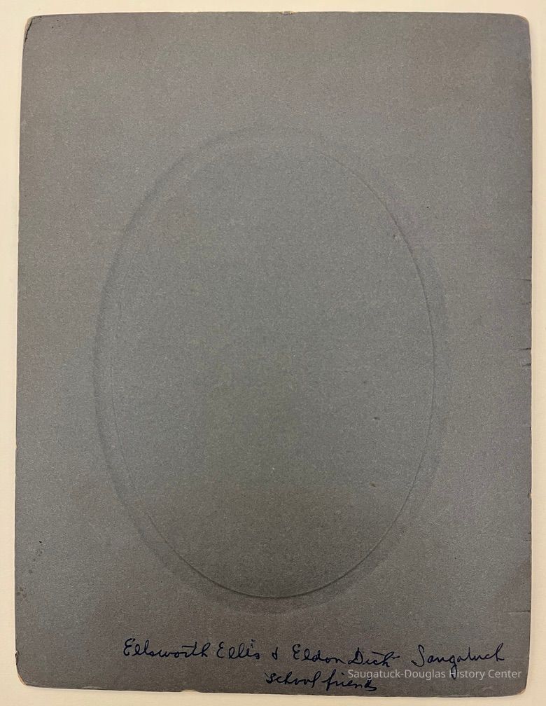 Oval-shaped photographic print mounted on black card with embossed frame. The portrait depicts two young men wearing suit jackets with carnations in their lapel buttonholes. A note on the back of the card identifies the sitters as Ellsworth Ellis and Eldon Dick of Saugautck, school friends.