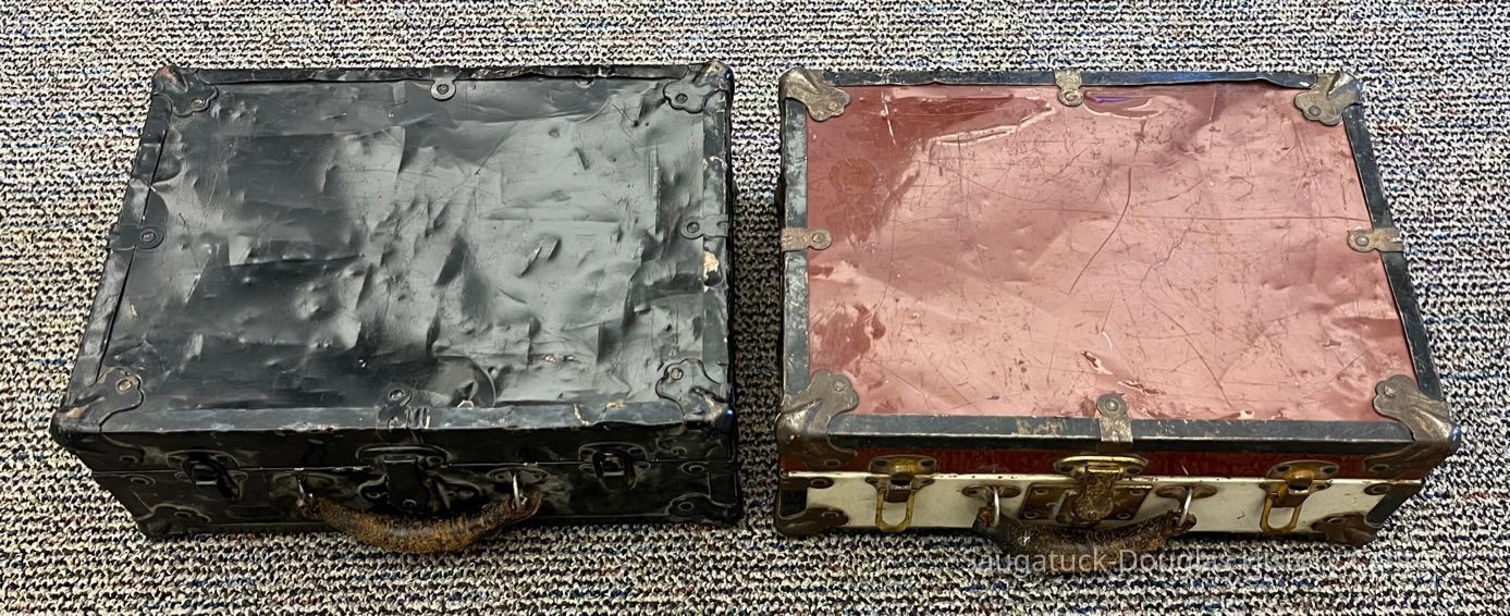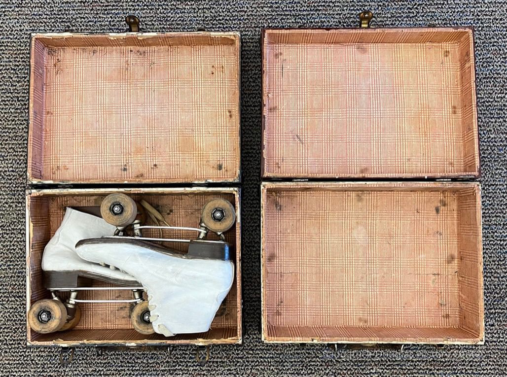 Two metal, hinged carrying cases for roller skates. The both cases have reinforced edges and corners, a pair of latch closures, a keyed lock and leather handle. Both case have a red-and-white striped paper lining.
