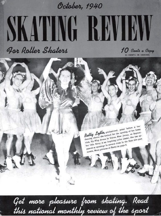 The all-black case includes a pair of "The Betty Lytle Model A 10" white skates with wooden wheels. A brand imprint on the lock flap identifies the manufacturer as the Eagle Lock Company of Terryville, Connecticut. The skates are a pair of ankle-high, white leather "Betty Lytle Model A / 10 / Roloway-Cleve 9 / T223295" Each skate has four wooden wheels branded "Ware Bros Chicago"