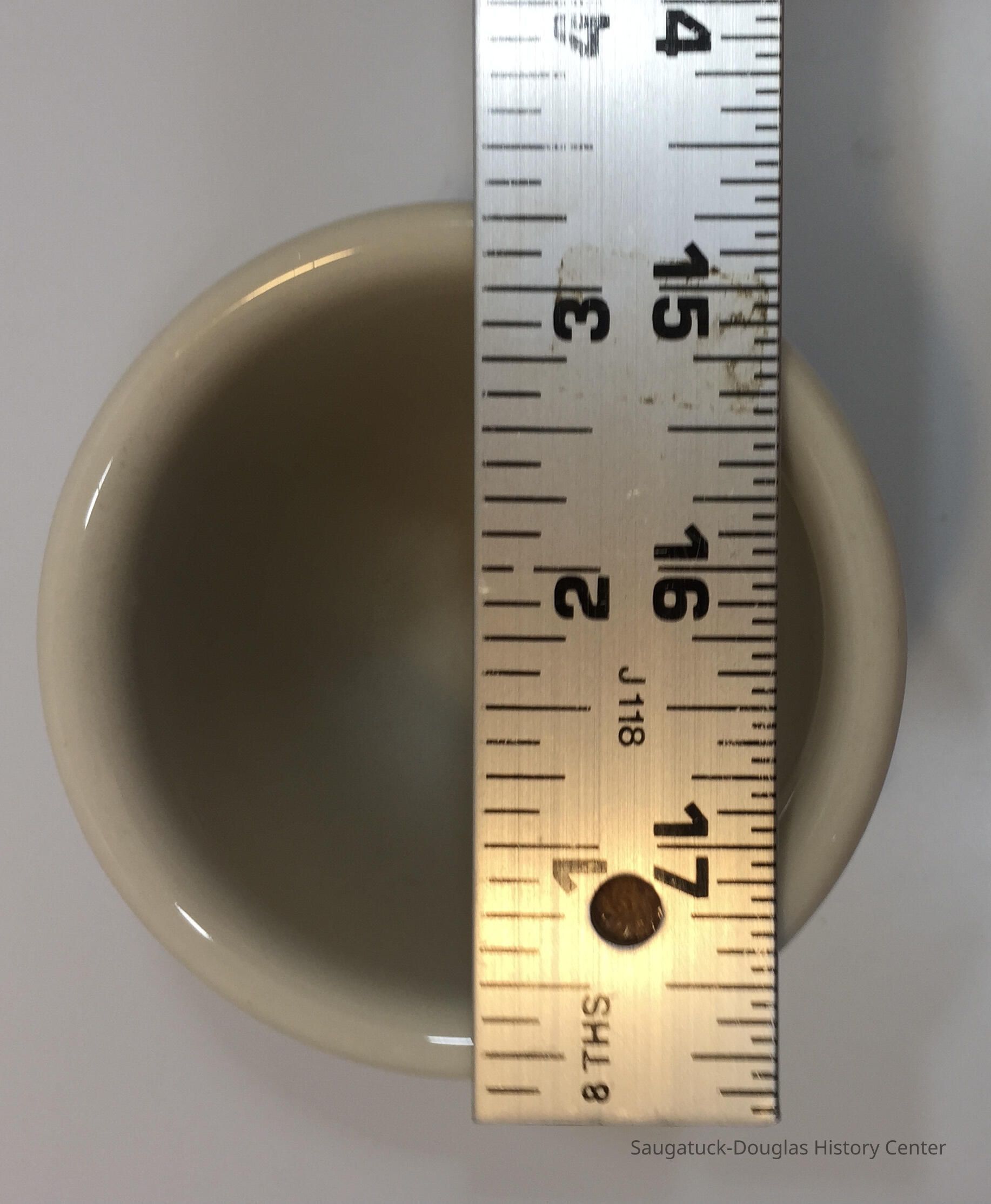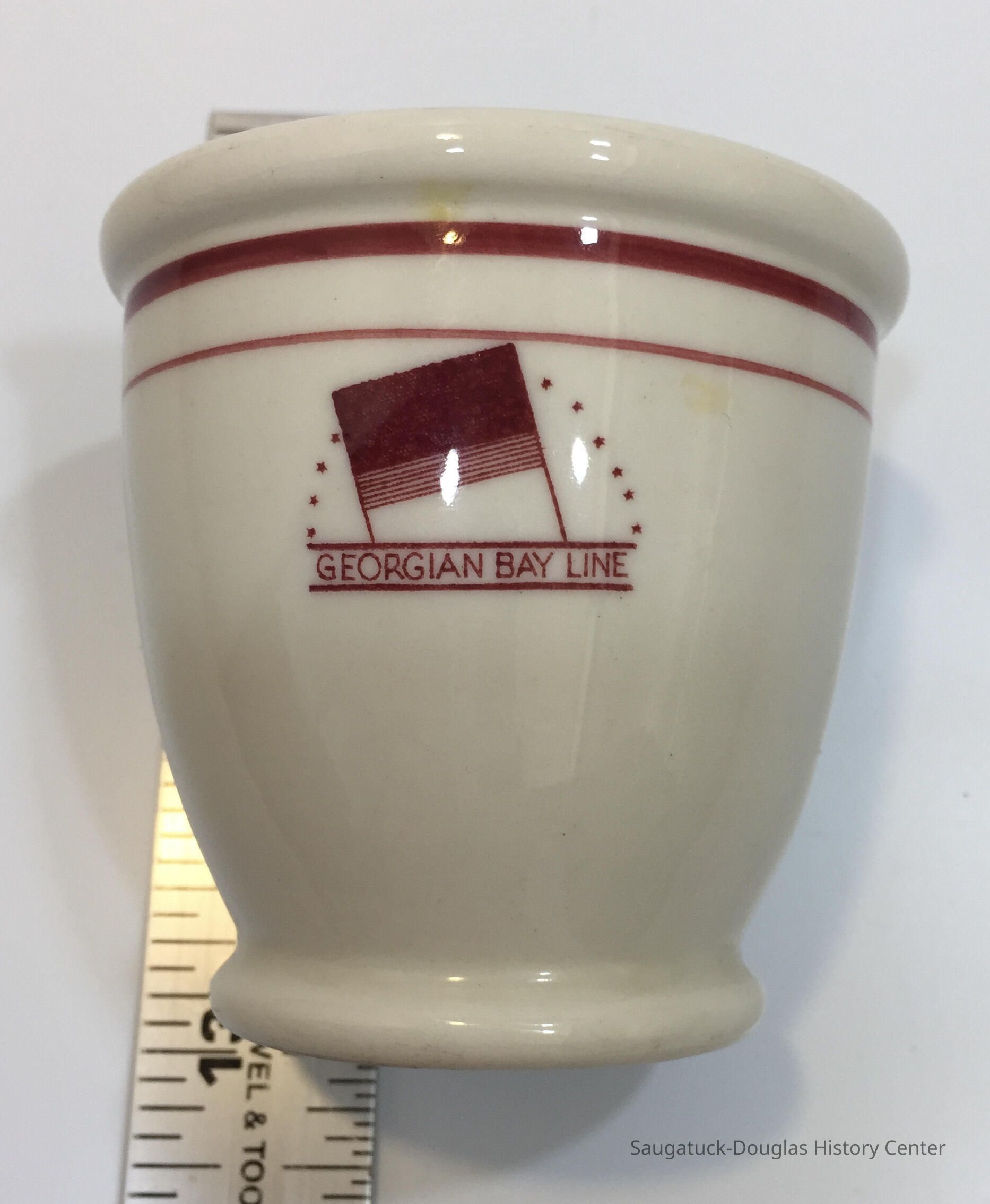 Ceramic cup with no handle marked with the Georgian Bay Line insignia which was a ship's funnel (chimney) and stars.