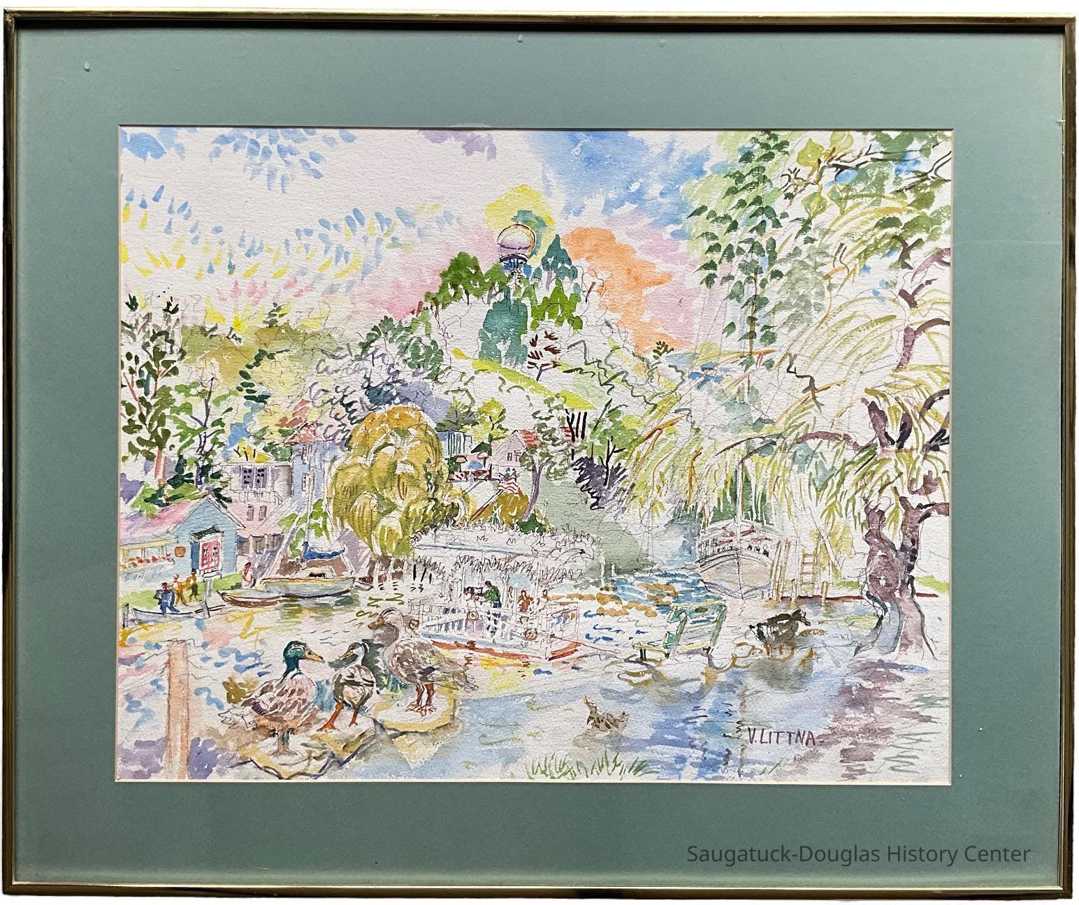 Victoria Marshall Littna 1885-1955 River Fantasy 1980 watercolor on paper Victoria Littna (1921-1991) was born in Argentina of British parents and studied at the Academia Superior de Bellas Artes in Buenos Aires and Goldsmiths College in London with surrealist painter Graham Sutherland. She moved to the United States in 1965 with her husband, Czech émigré lawyer and painter Francis Littna (1903- 1973). Living in Kalamazoo, she taught art at the Kalamazoo Institute of Arts. A 1983 Kalamazoo News profile described her as a "psychological painter" as seen in this landscape, "a patchwork-quilt of a landscape in the wild, bright colors typical of the Fauve tradition out of which her style has emerged." The scene on the Kalamazoo River in Saugatuck depicts recognizable features including the Chain Ferry "Diane" and radome atop Mt Baldhead. A trio of mallard ducks in the foreground engage us, blending realism and fantasy in this summertime watercolor. Saugatuck-Douglas History Center Lane Art Collection