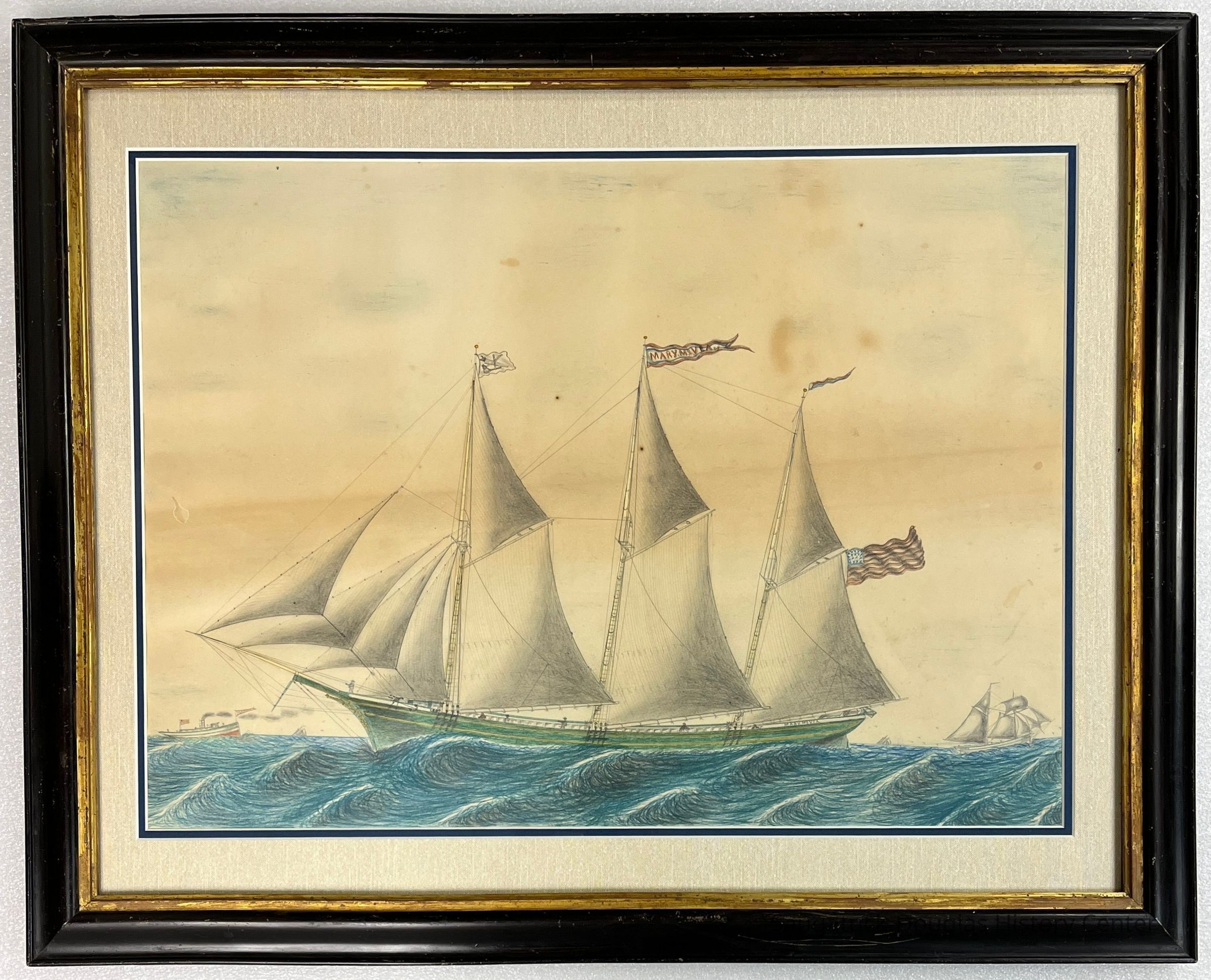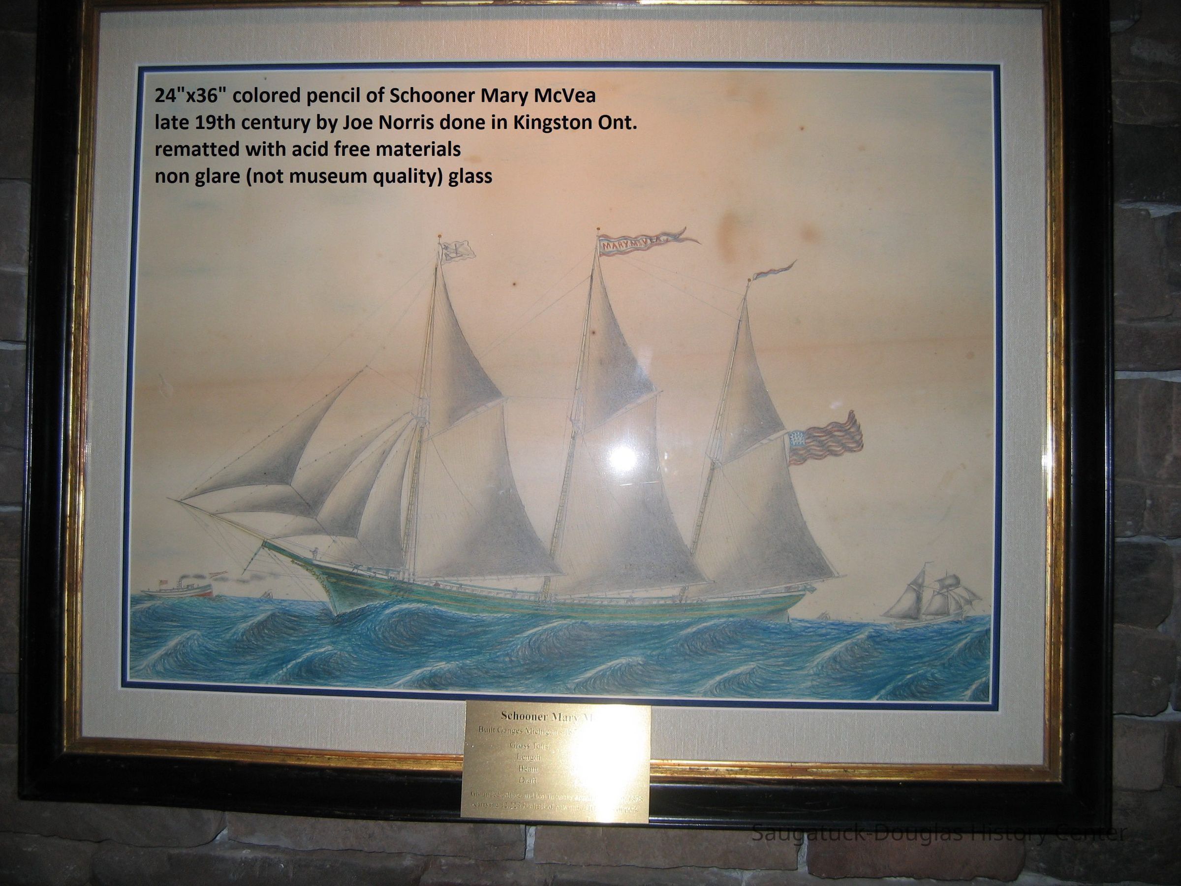 A. Colored pencil rendering of the Mary McVea, a three-masted schooner, sailing over tidy waves with a steamship and another sailboat in the distance. According to the donor, the drawing was done by Joe Norris of Kingston Ontario in the late 19th century.