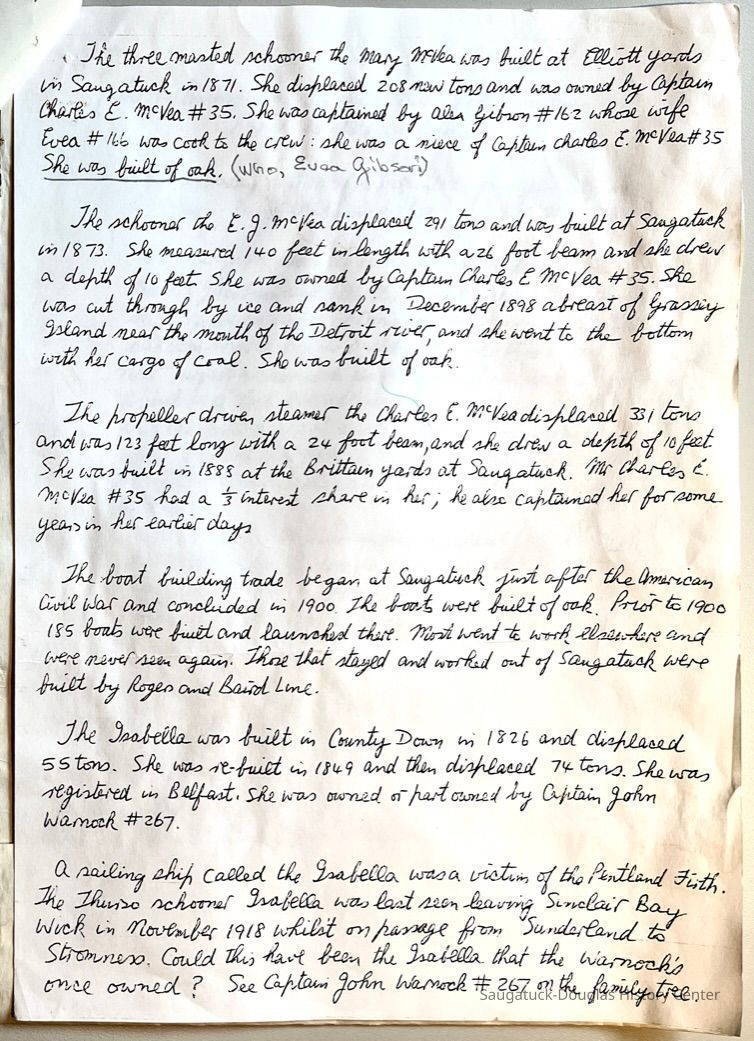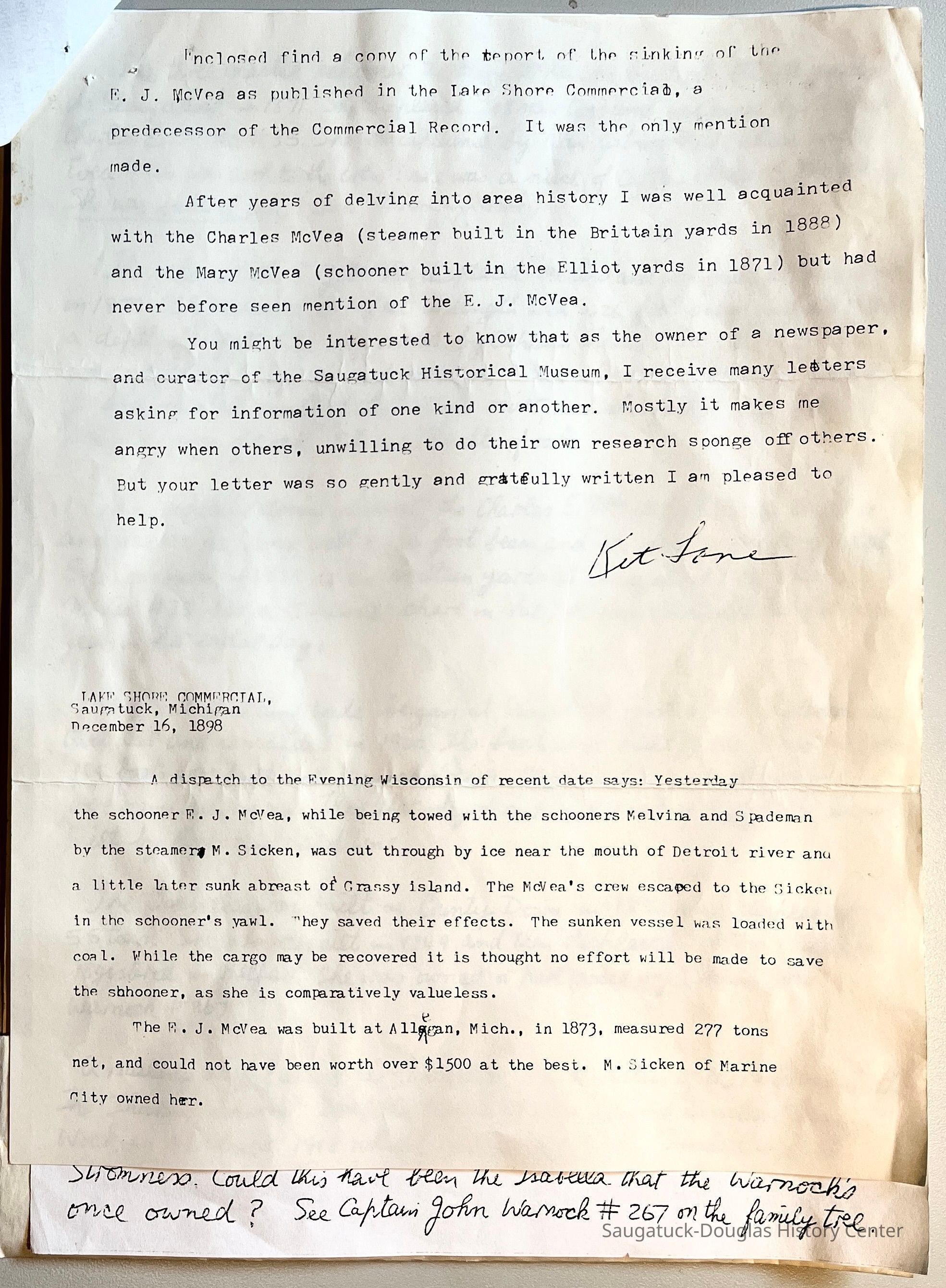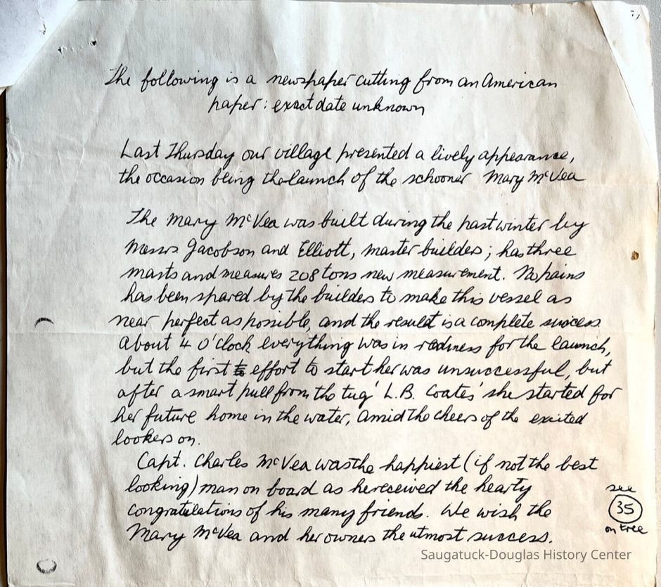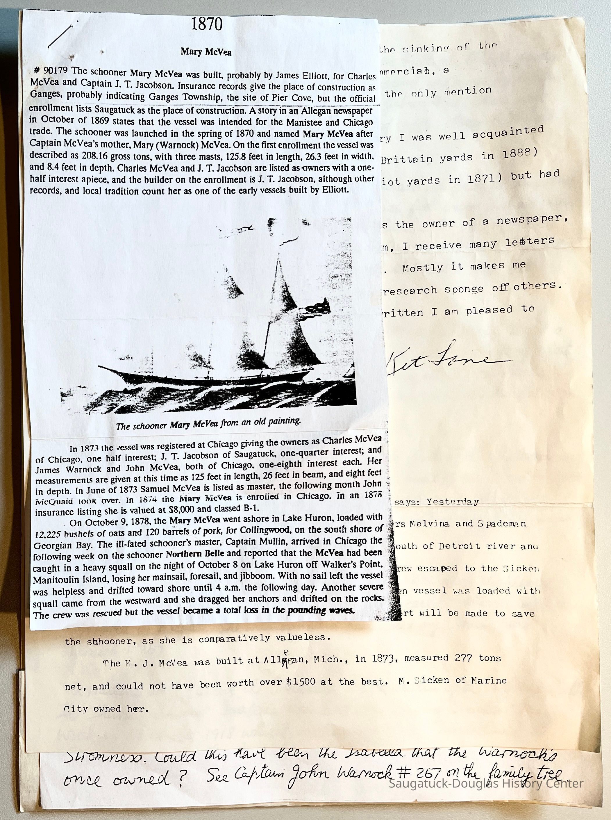 B. Stapled stack of four documents about the Mary McVea. The first page is a photocopy of pages 45-46 from Kit Lane's "Built on the Banks of the Kalamazoo" 1993.
