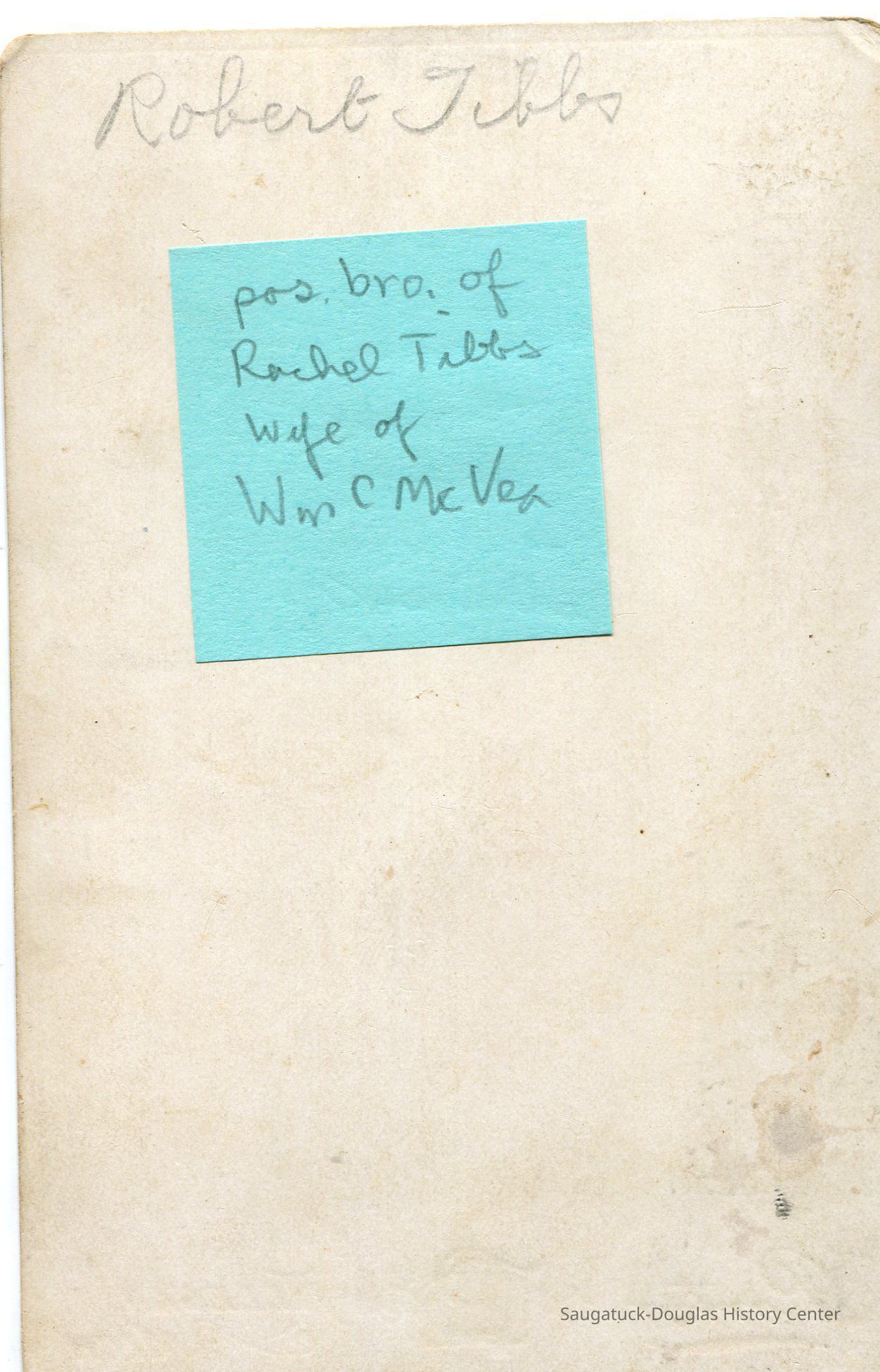 Robert Tibbs is written in pencil on the back along with a green post-it noting the following in cursive: Pos. Bro. of Rachel Tibbs, wife of William C. McVea