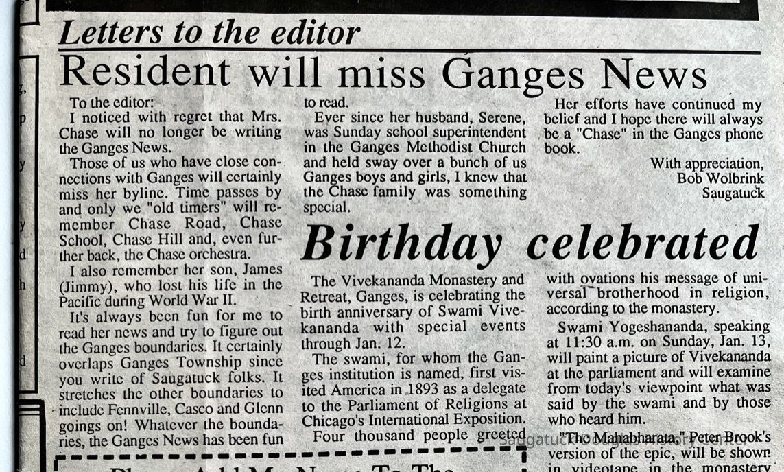 Photocopy of a 10 Jan 1991 letter to the editor of the Commerical Record by Robert Wolbrink thanking Mrs. Chase for her Ganges News articles that mentioned "Chase Road, Chase School, Chase Hill and, even further back, the Chase orchestra", James (Jimmy) Chase who lost his life in the Pacific in World War II and Mr. Serene Chase who was Ganges Methodist Church Sunday school superintendent.