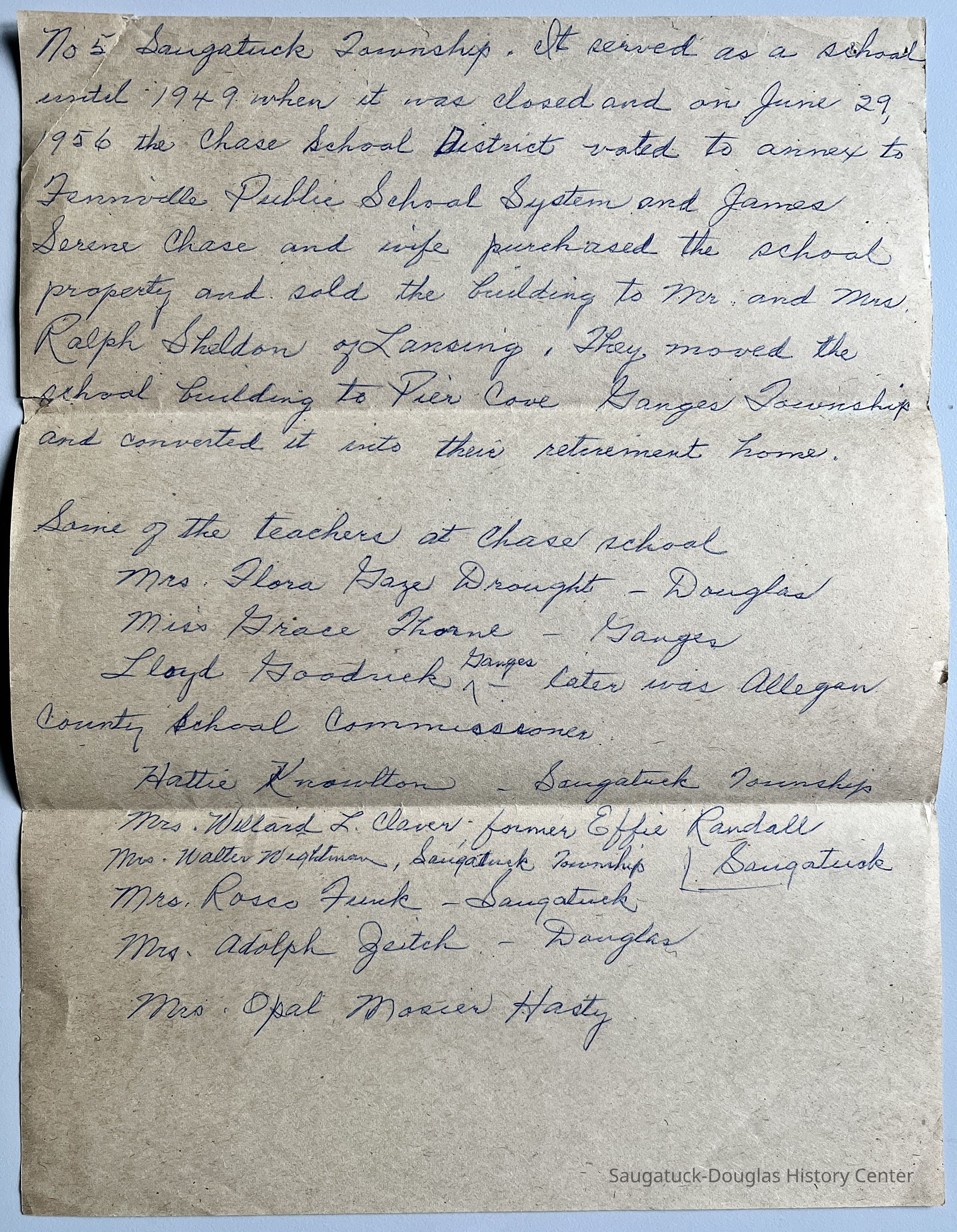 1976 letter referencing J Serene Chase, the land sold in 1883 for the Chase School District #5 that was located at the Blue Star Highway and 126th Ave. The school was closed in 1949 and annexed to the Fennville Public School system in 1956. James Serene Chase purchased the land and sold the building to Ralph Sheldon who moved it to Pier Cove for use as a home. [The "Old Chase School/Joseph Robbins Home" is listed as at 2351 Lakeshore Dr. in the 1999 historic structure survey.]