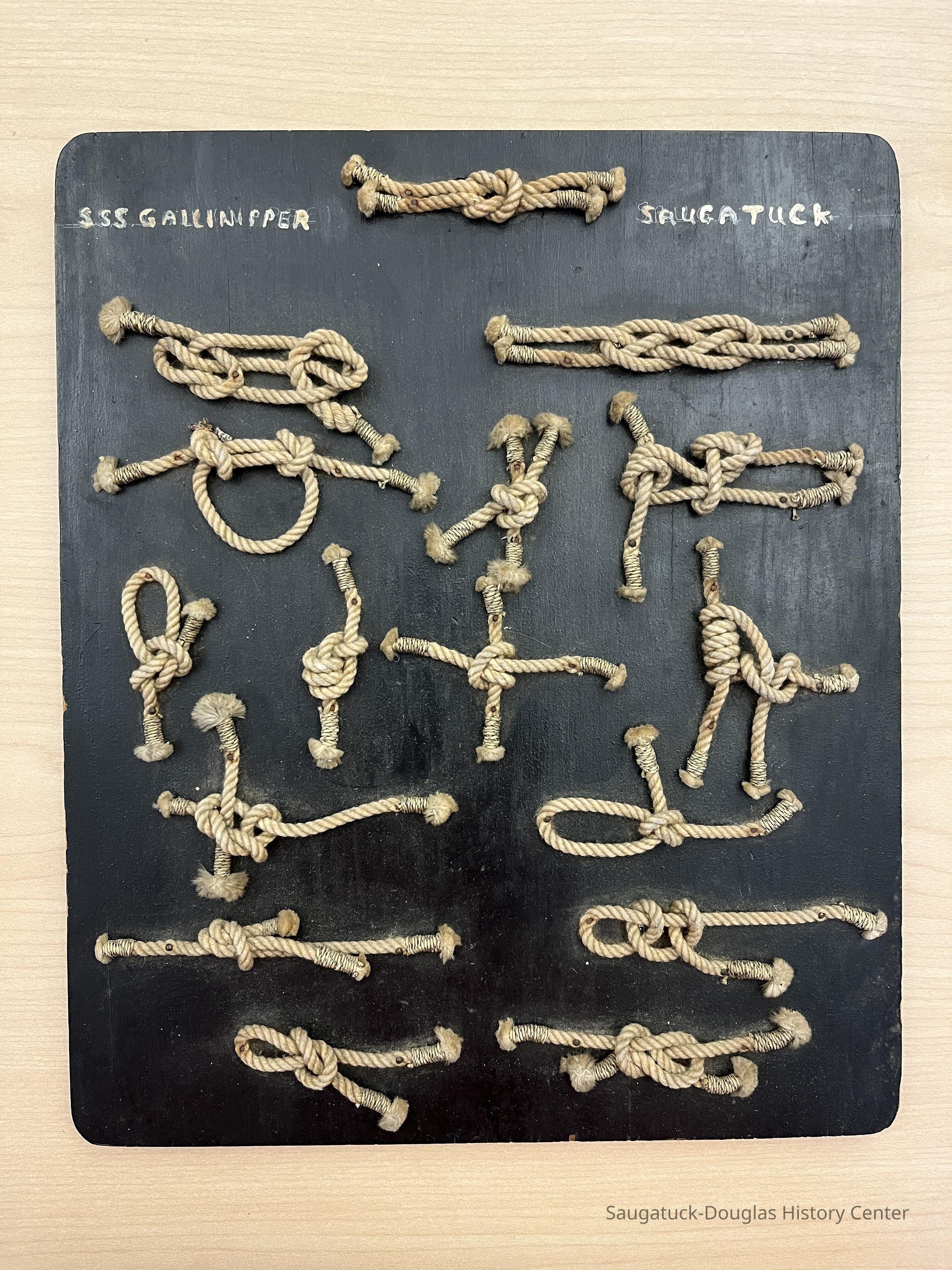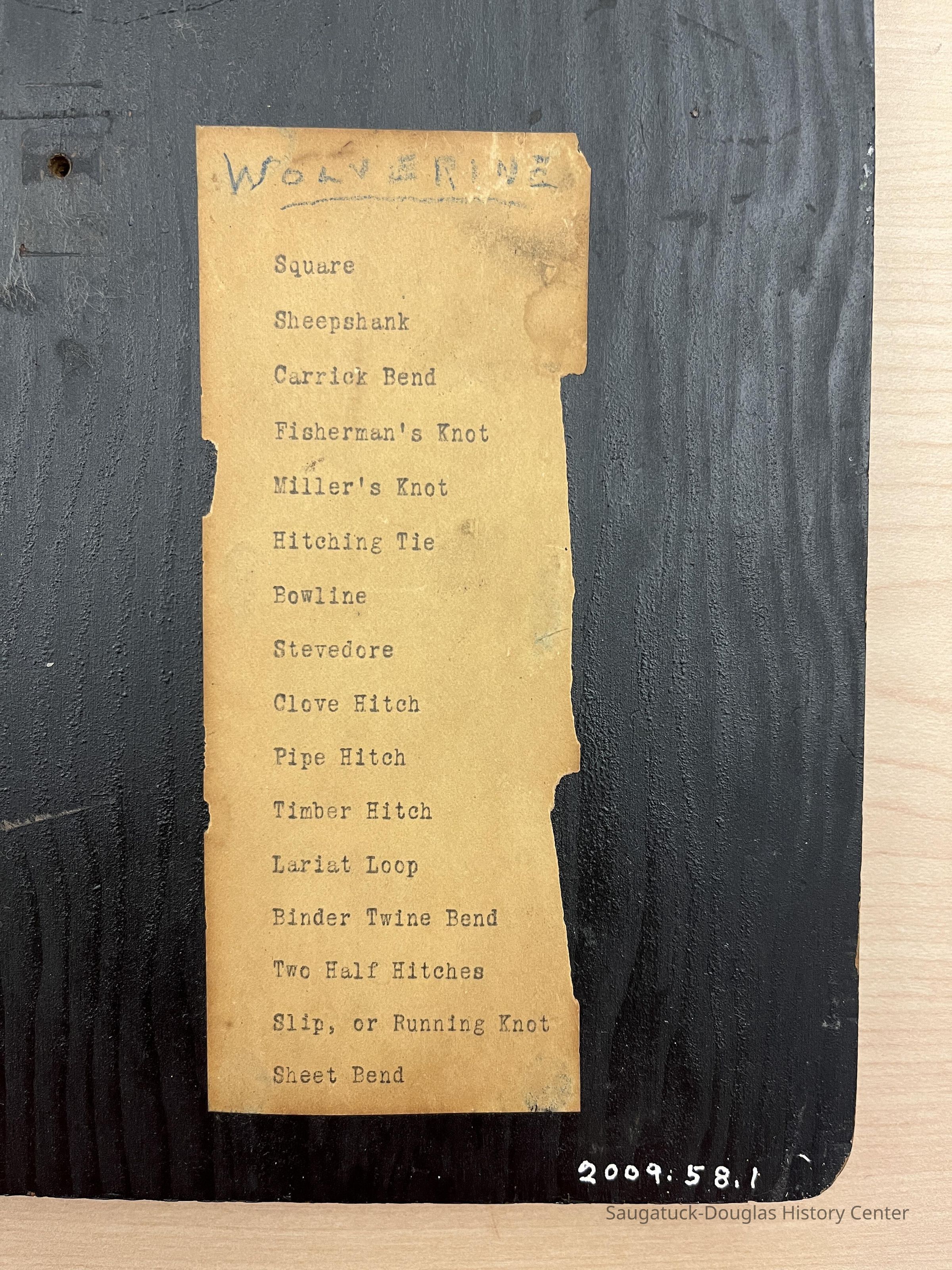 10" x 12" black wooden board with 16 rope ties - identification of all knot types on back side