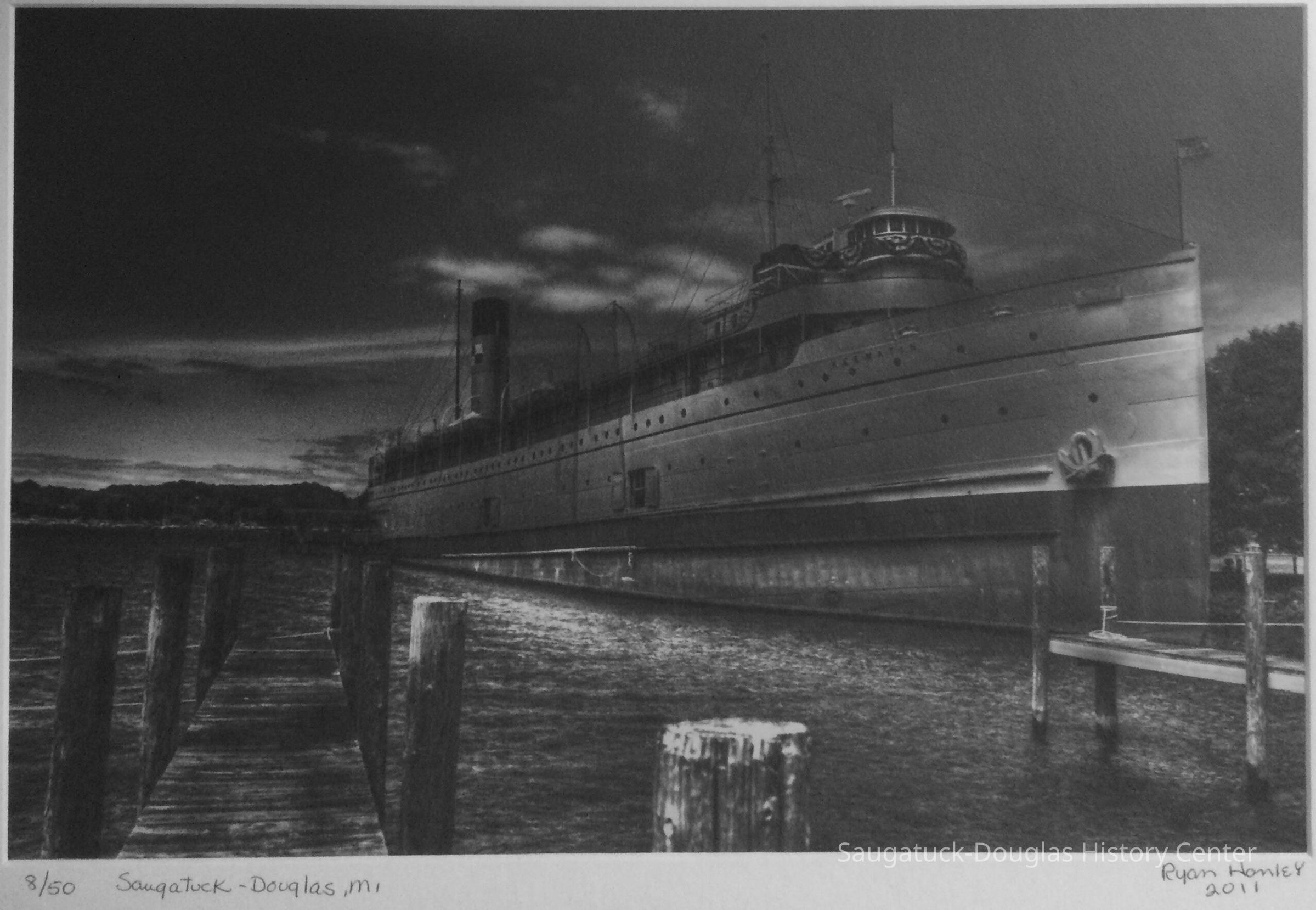 Moody black and white photo of Keewatin ship docked in Saugatuck by Ryan Hanley. Dated 2011, the photo has a white mat and thick black frame. Numbered 8/50 and marked "Saugatuck-Douglas, MI"