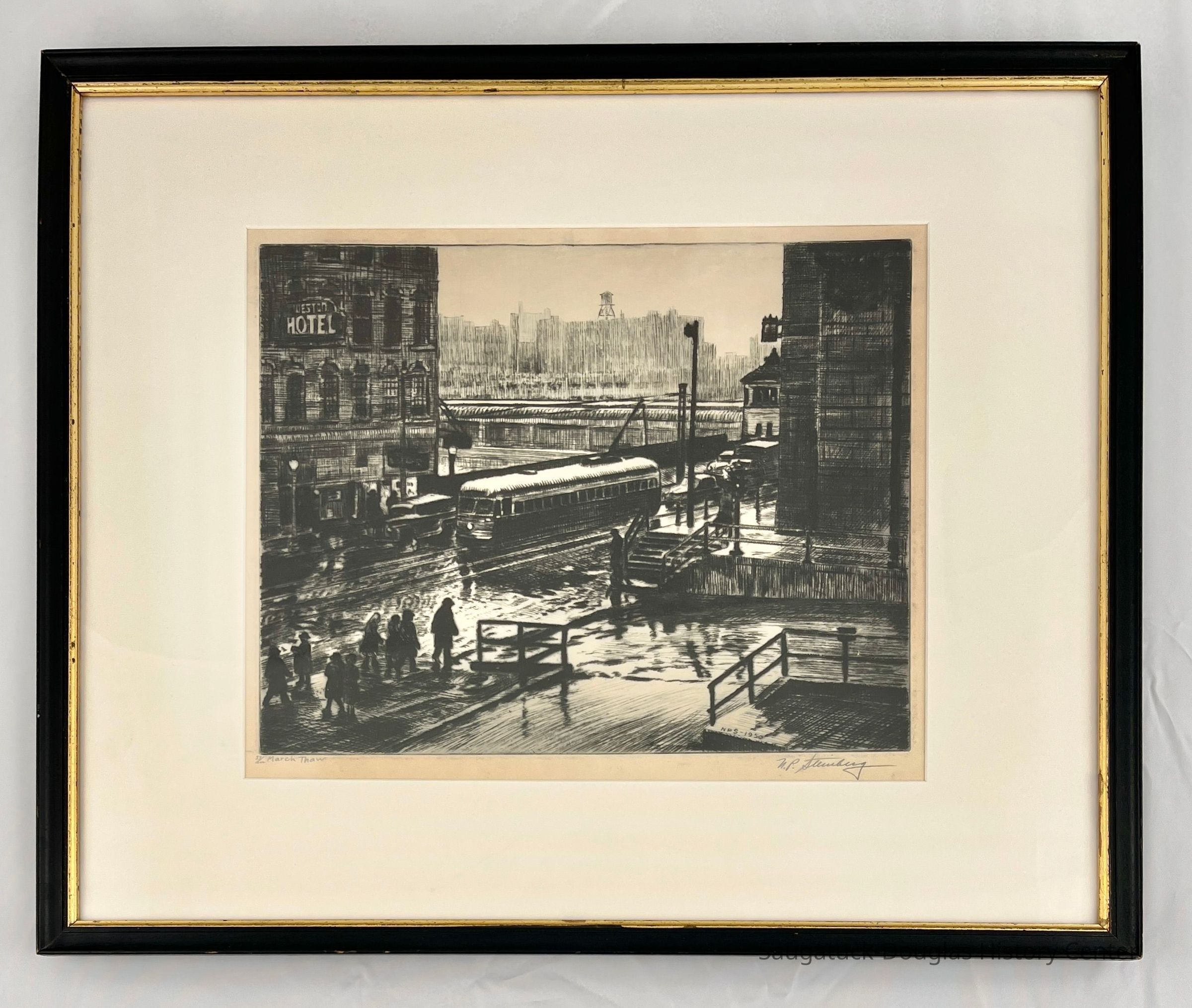 Etching by Nat Steinberg behind glass with 3/4-inch black frame with gold insert and beige mat.