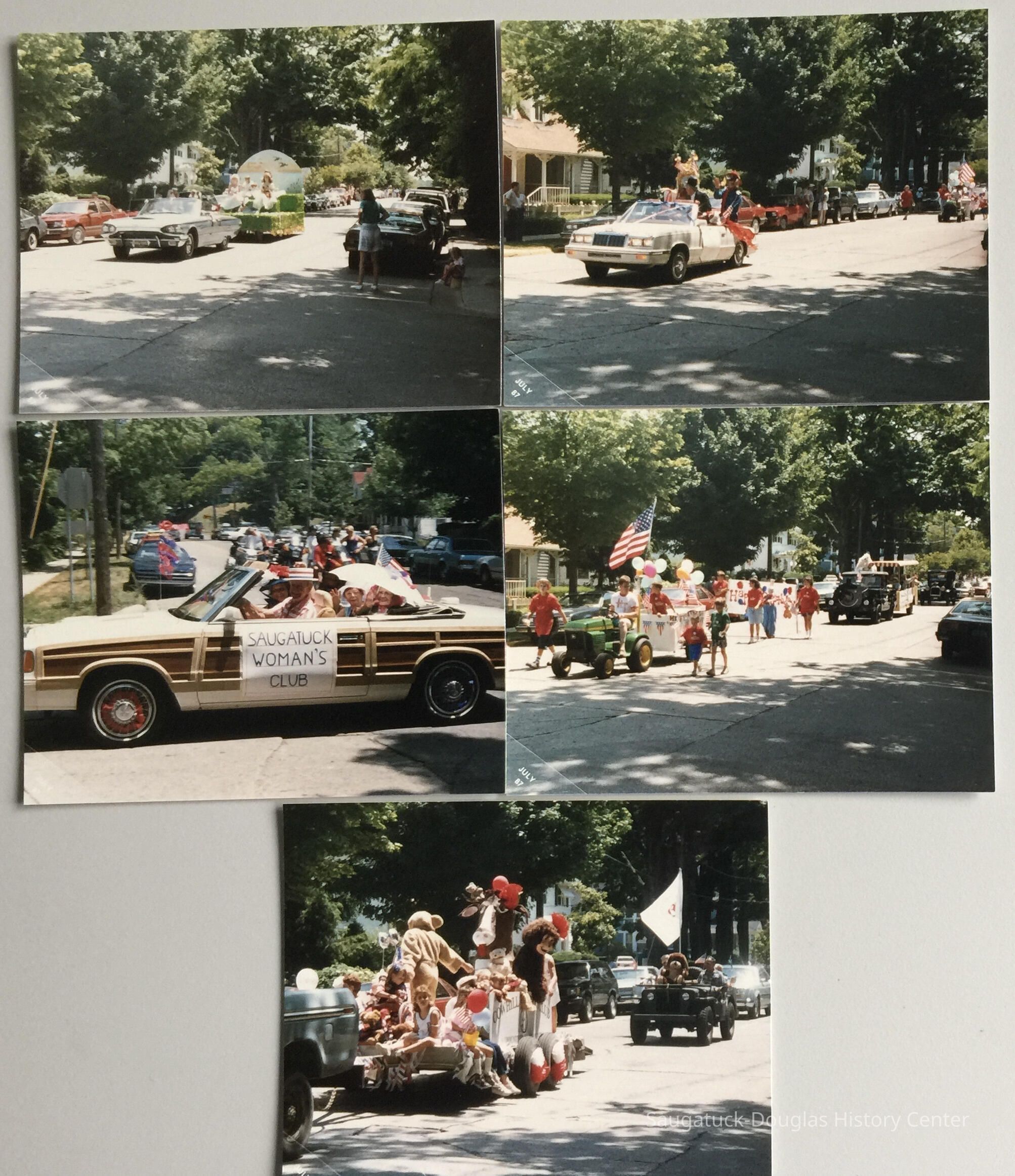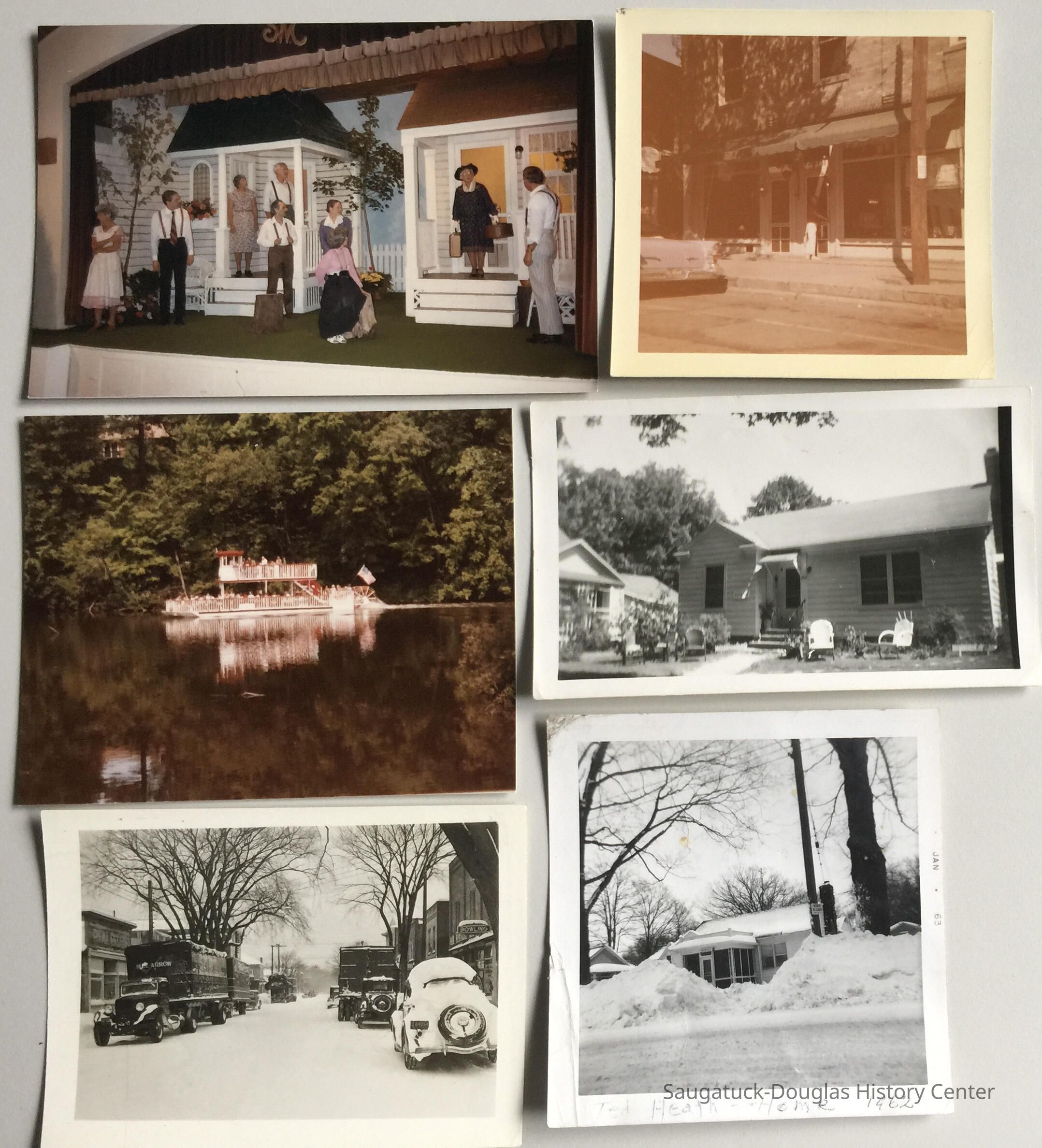Snowy winter Butler Street 1937, Ted Heath home 1962, paddlewheeler boat that is not the Star or Queen of Saugatuck (as per Marilyn Starring), Aug. 1983, Mildred Parrott in a play at the Women's Club.