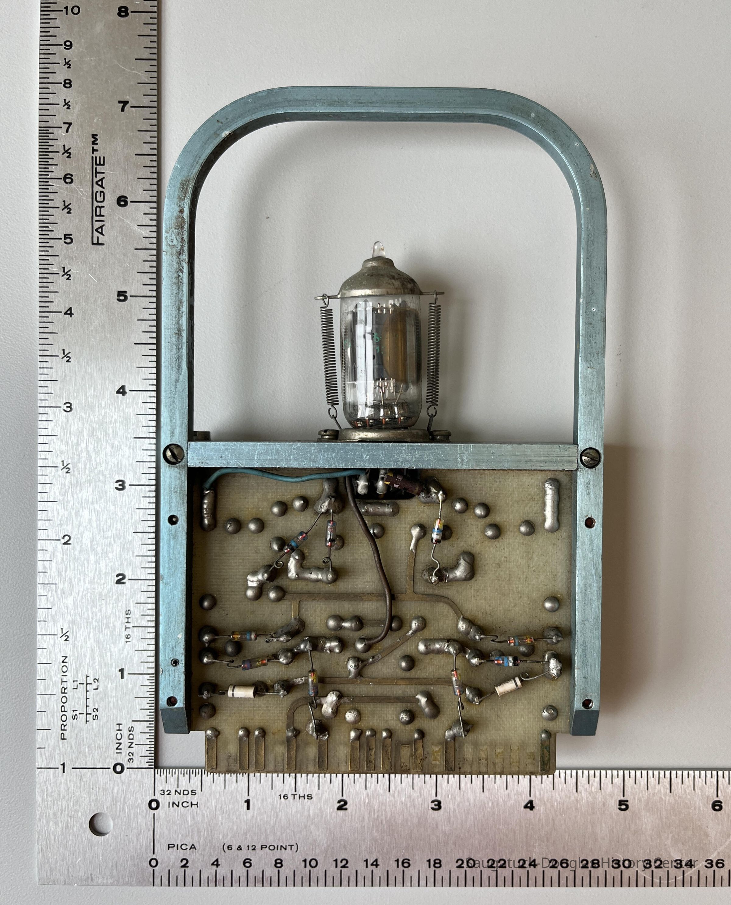 The module is a part of the FST-1 Coordinate Data Transmitter that sent the radar data from the Mt. Baldhead Gap Filler Radar Station down phone lines to the Fort Custer Direction Center in Battle Creek. The module was part of the first radar digital signal processing unit and first modem used in an actual application. From the radar cabinet panel from the SDHC Cold War/Hot Towns exhibit (2017-18): "This FST-1 power supply cabinet was removed from the Mt. Baldhead Gap Filler Radar Annex in the 1980s. It includes components from the AN/FST-1 Coordinate Data Transmitter. The FST-1 sorted radar data to distinguish legitimate targets and transmitted the radar data down telephone lines in the first-ever use of a modem outside a research environment. The heart of the AN/FST-1 was a RCA 6499 Radechon barrier grid tube, a state-of-the-art memory device which, like the modem, was made available mere months before deployment in the FST-1."