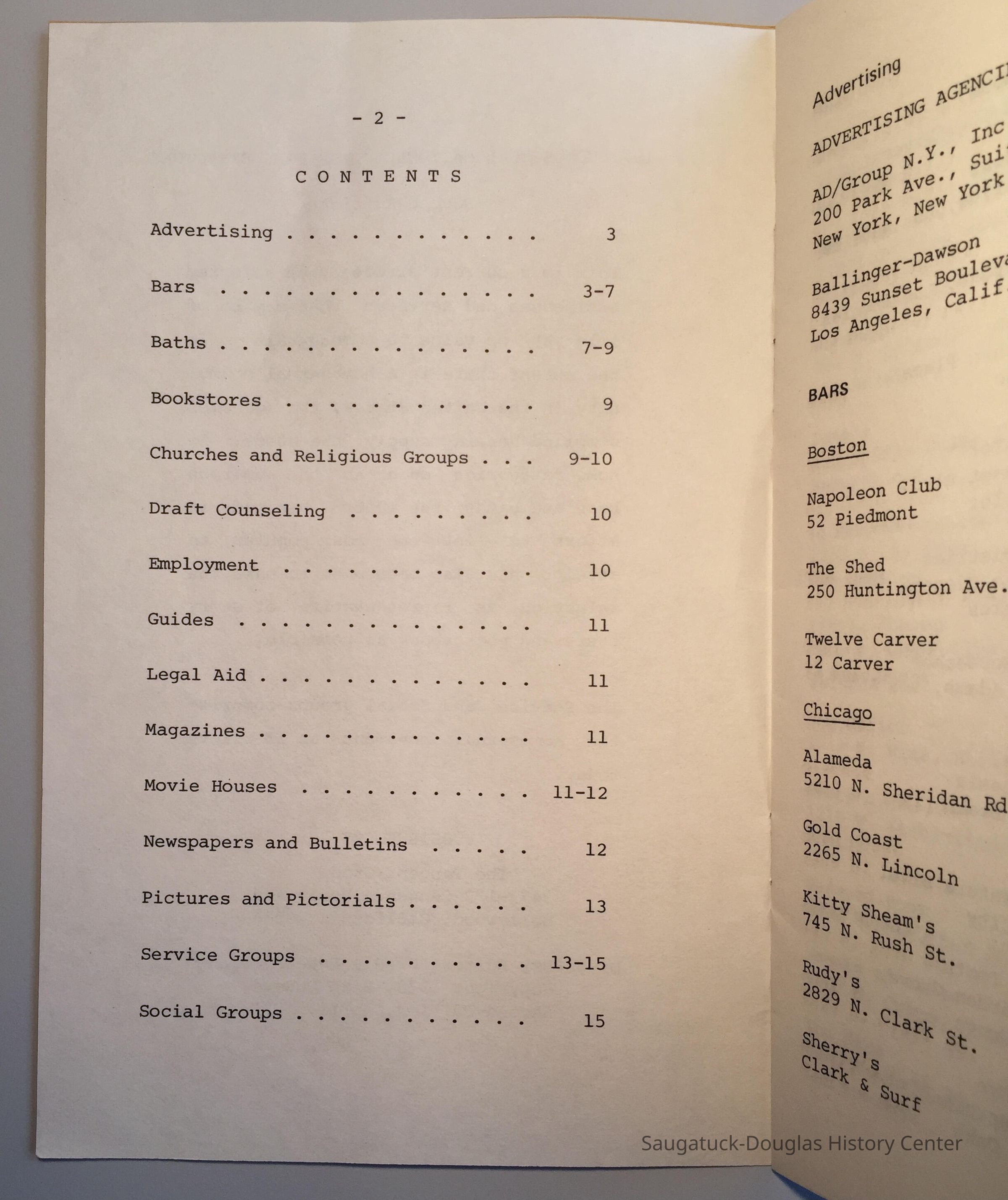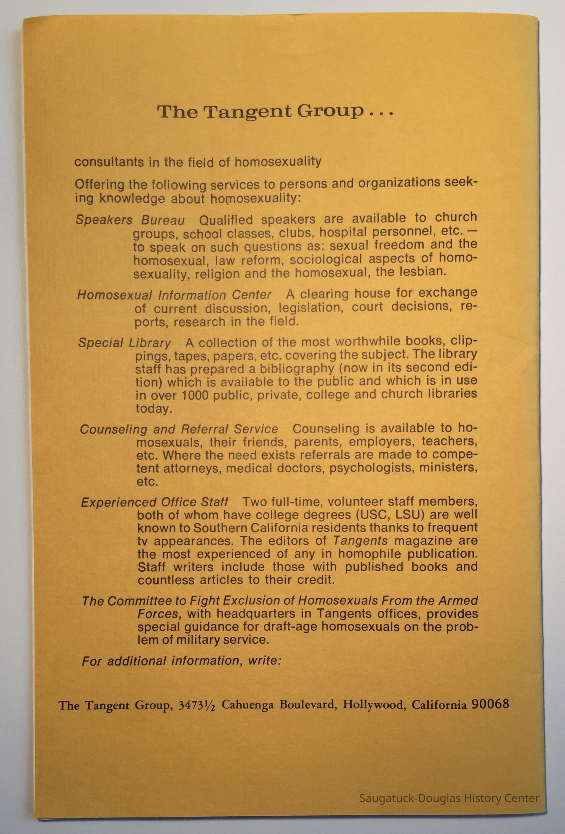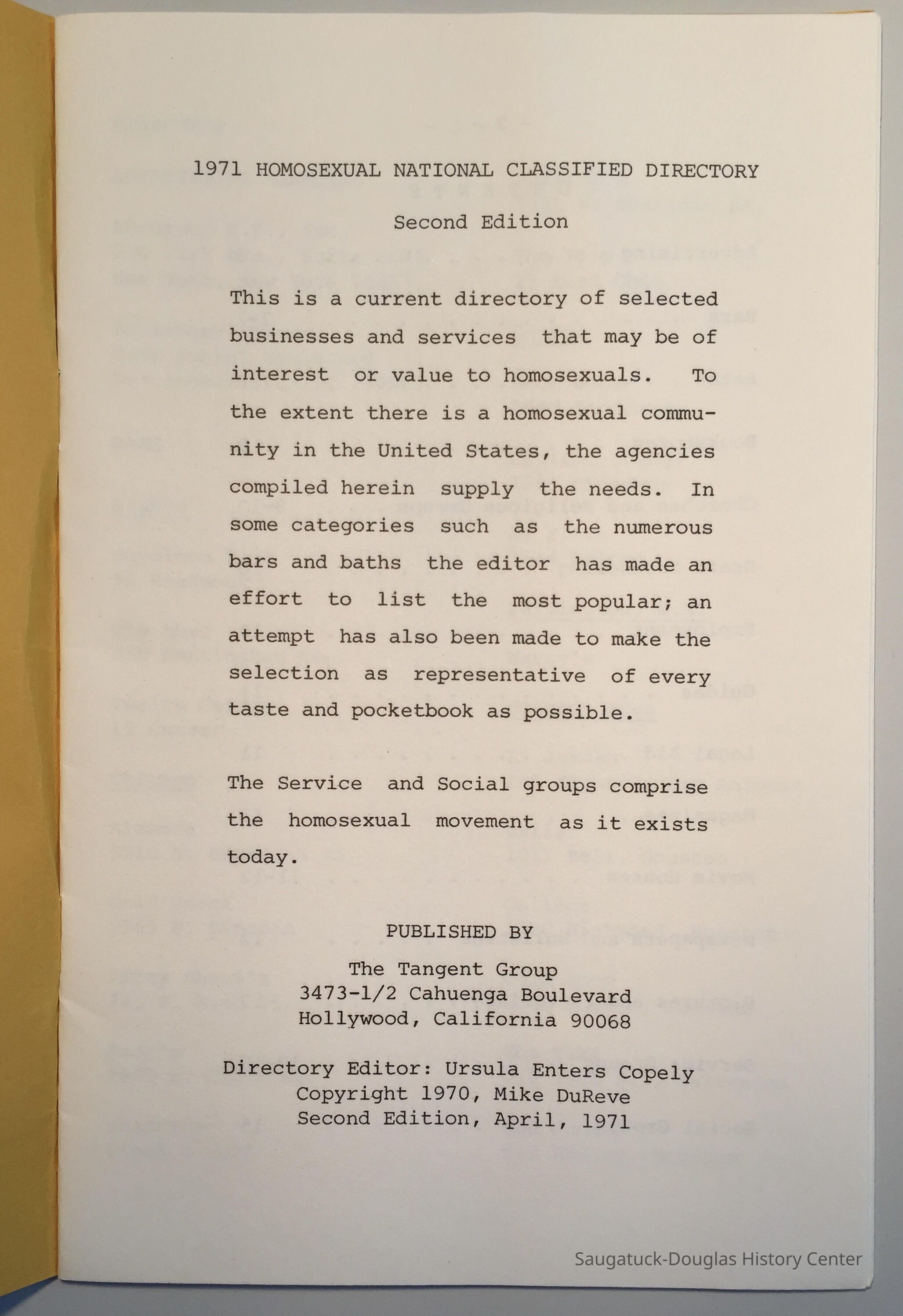 Text from title page, OCR scanned: 1971 HOMOSEXUAL NATIONAL CLASSIFIED DIRECTORY Second Edition This is a current directory of selected businesses and services that may be of interest or value to homosexuals. To the extent there is a homosexual community in the United States, the agencies compiled herein supply the needs. In some categories such as the numerous bars and baths the editor has made an effort to list the most popular; an attempt has also been made to make the selection as representative of every taste and pocketbook as possible. The Service and Social groups comprise the homosexual movement as it exists today. PUBLISHED BY The Tangent Group 3473-1/2 Cahuenga Boulevard Hollywood, California 90068 Directory Editor: Ursula Enters Copely Copyright 1970, Mike DuReve Second Edition, April, 1971 Table of contents, OCR scanned: Advertising ............................ 3 Bars.................................. 3-7 Baths................................. 7-9 Bookstores ............................ 9 Churches and Religious Groups . . . 9-10 Draft Counseling...................... 10 Employment............................ 10 Guides................................ 11 Legal Aid............................. 11 Magazines.............................. 11 Movie Houses.........................11-12 Newspapers and Bulletins .............. 12 Pictures and Pictorials ............... 13 Service Groups ..................... 13-15 Social Groups ......................... 15