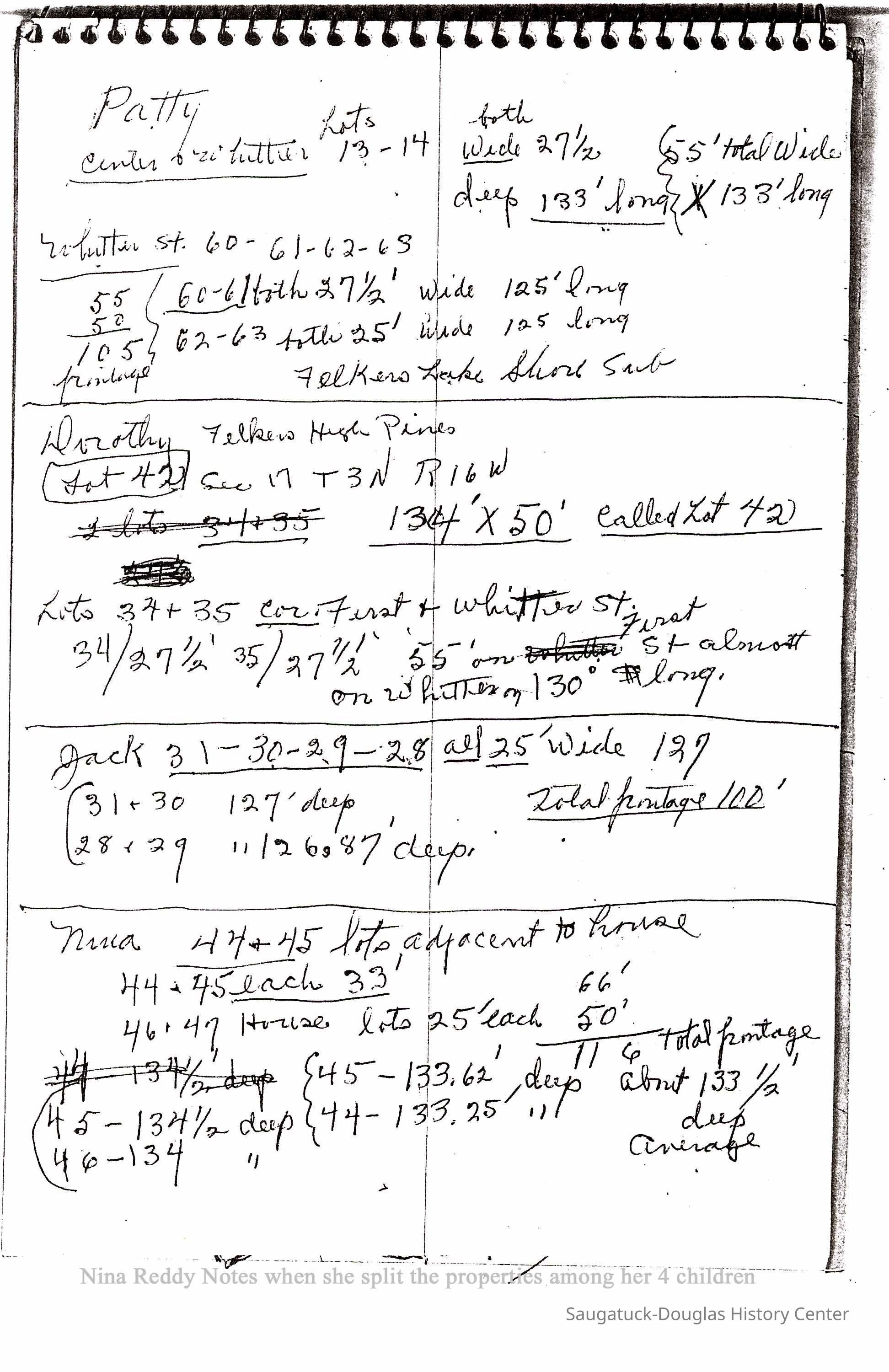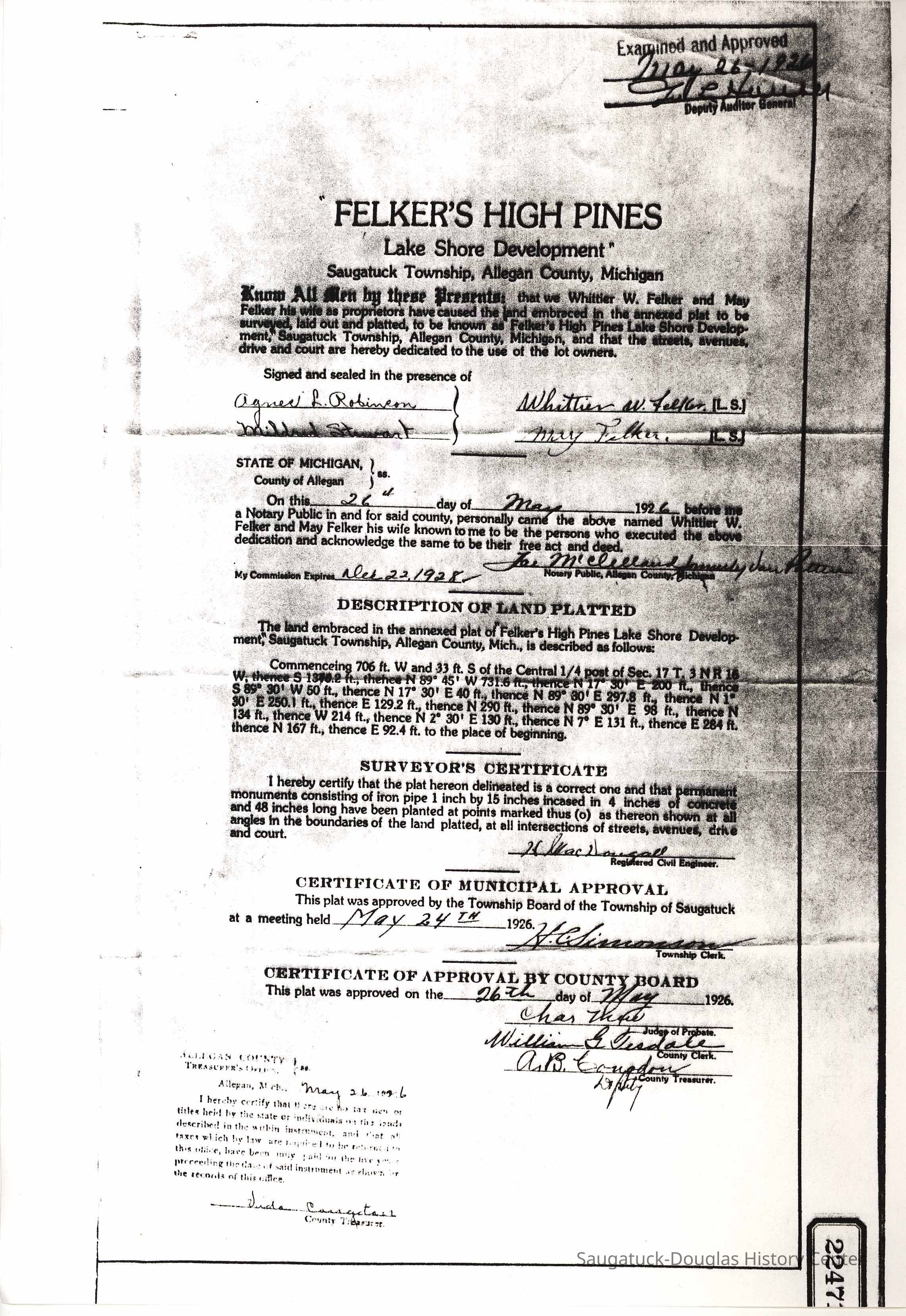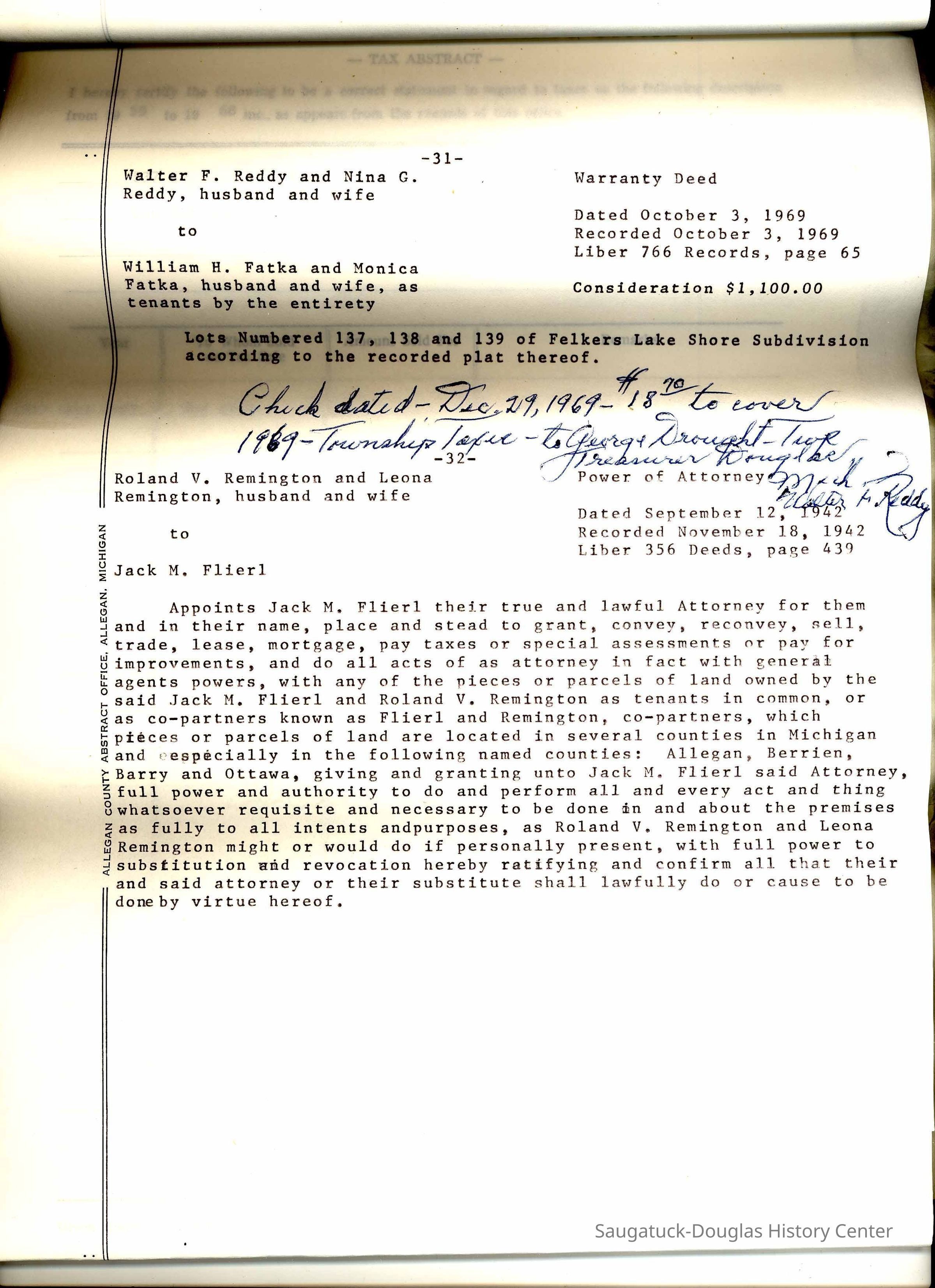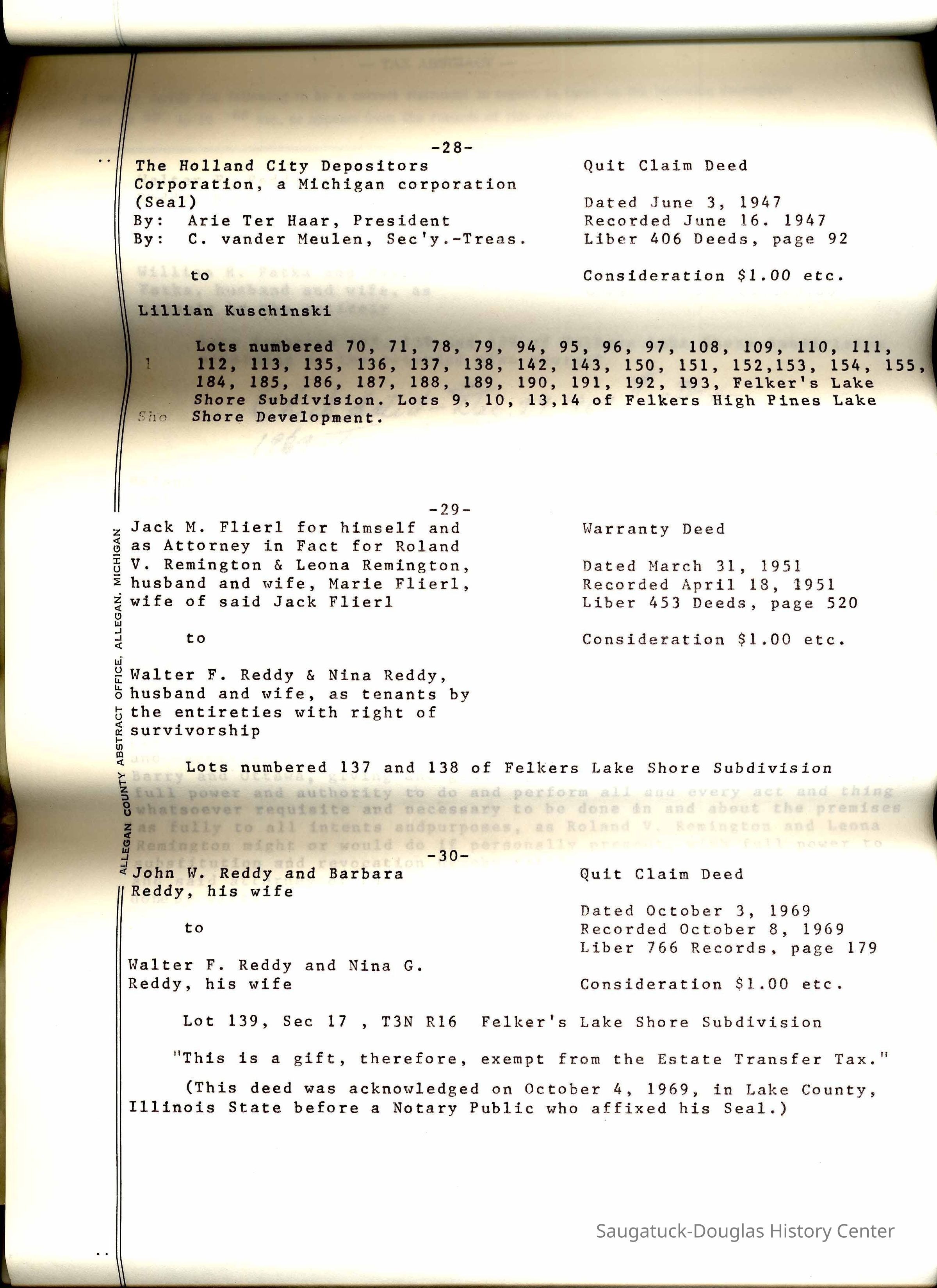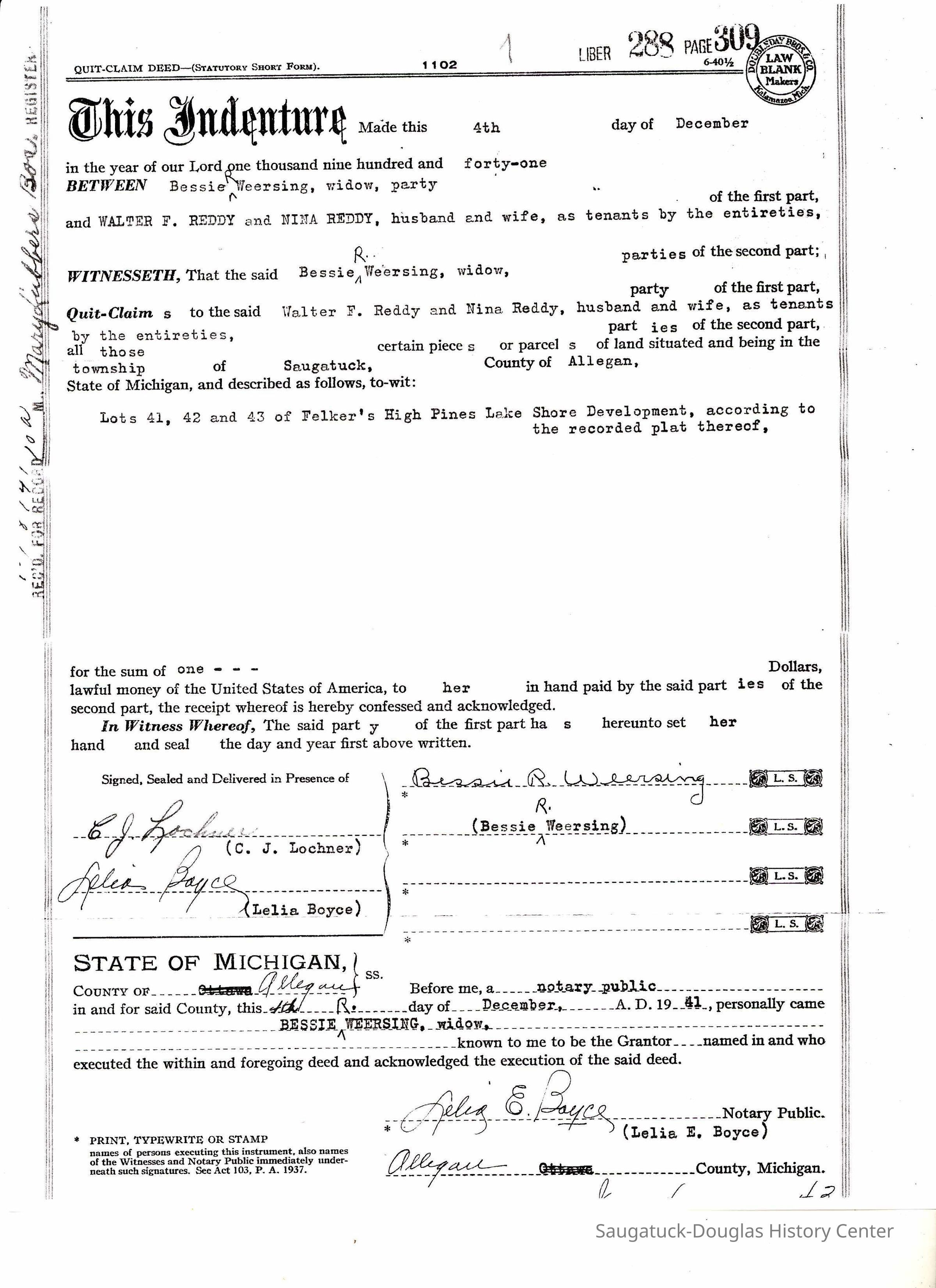 Walter and Nina Reddy of East Lansing, Michigan, purchased several lots in the Felker's Lake Shore Development in 1942 by Quit Claim from two colleagues for "one dollar & other good and valuable considerations". Walter subsequently built the first Felker's Subdivision cottage and took an active part in its development. Walter and Nina are Dorothy Otto's parents. Dorothy, with her husband Tom, continues to live in the second Felker's home built by Walter and Nina.