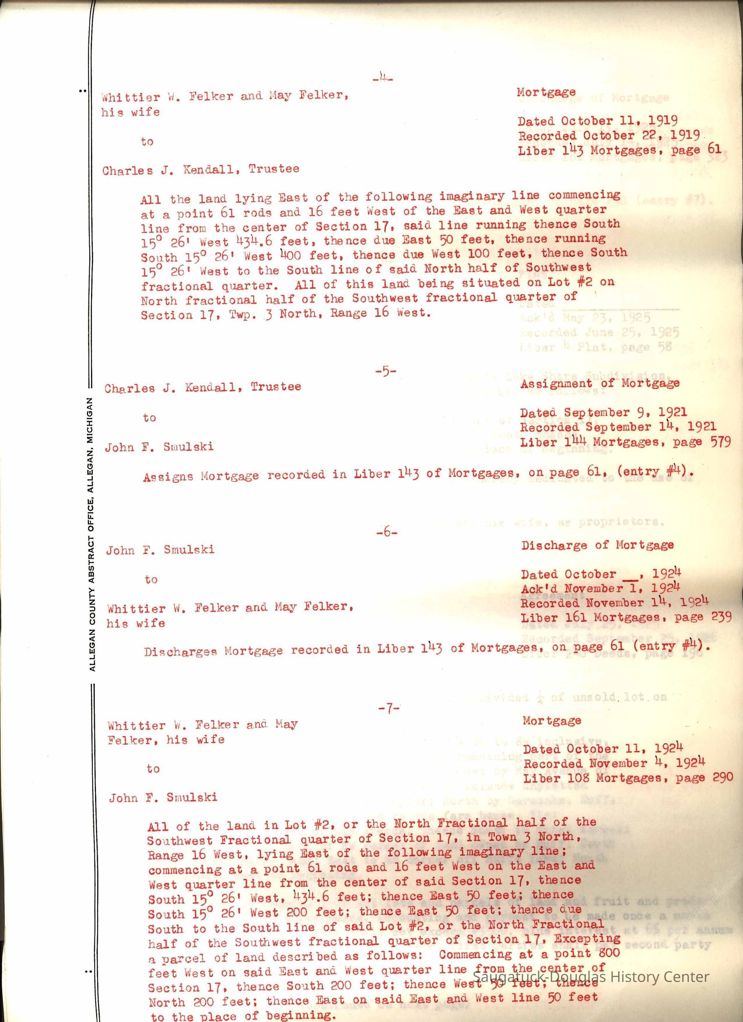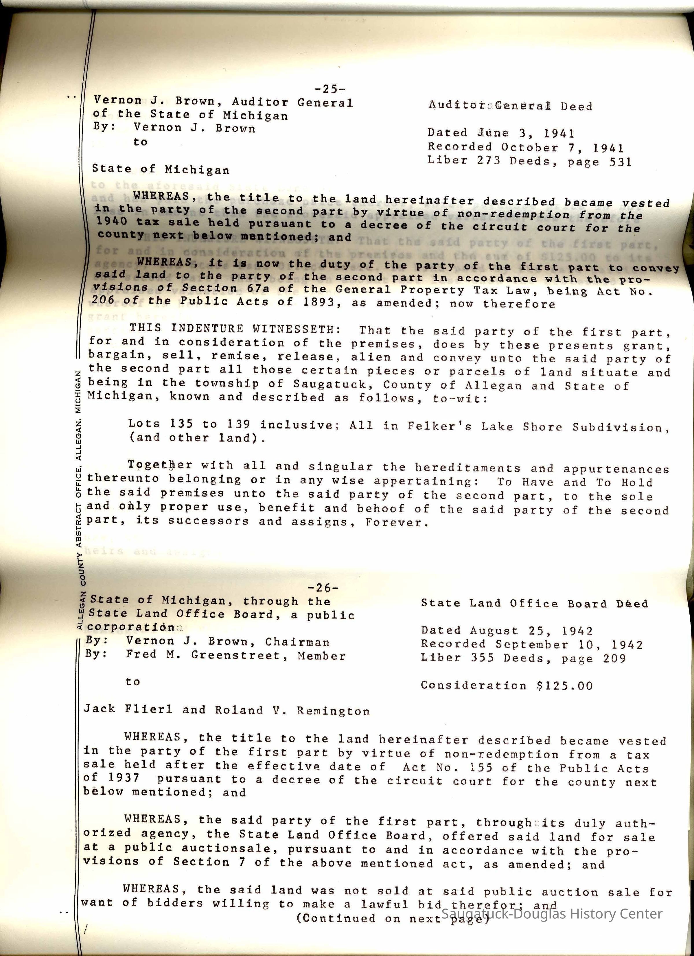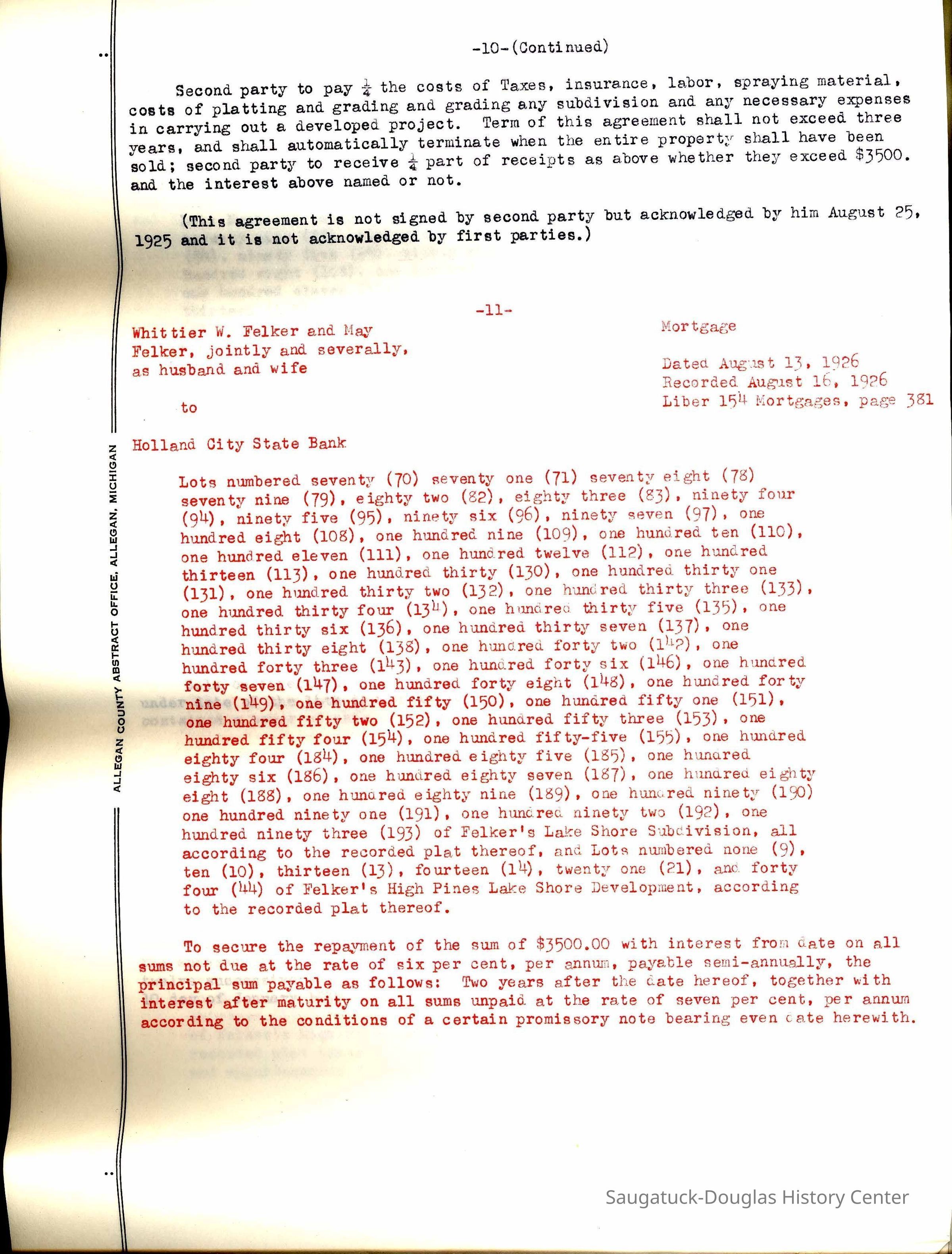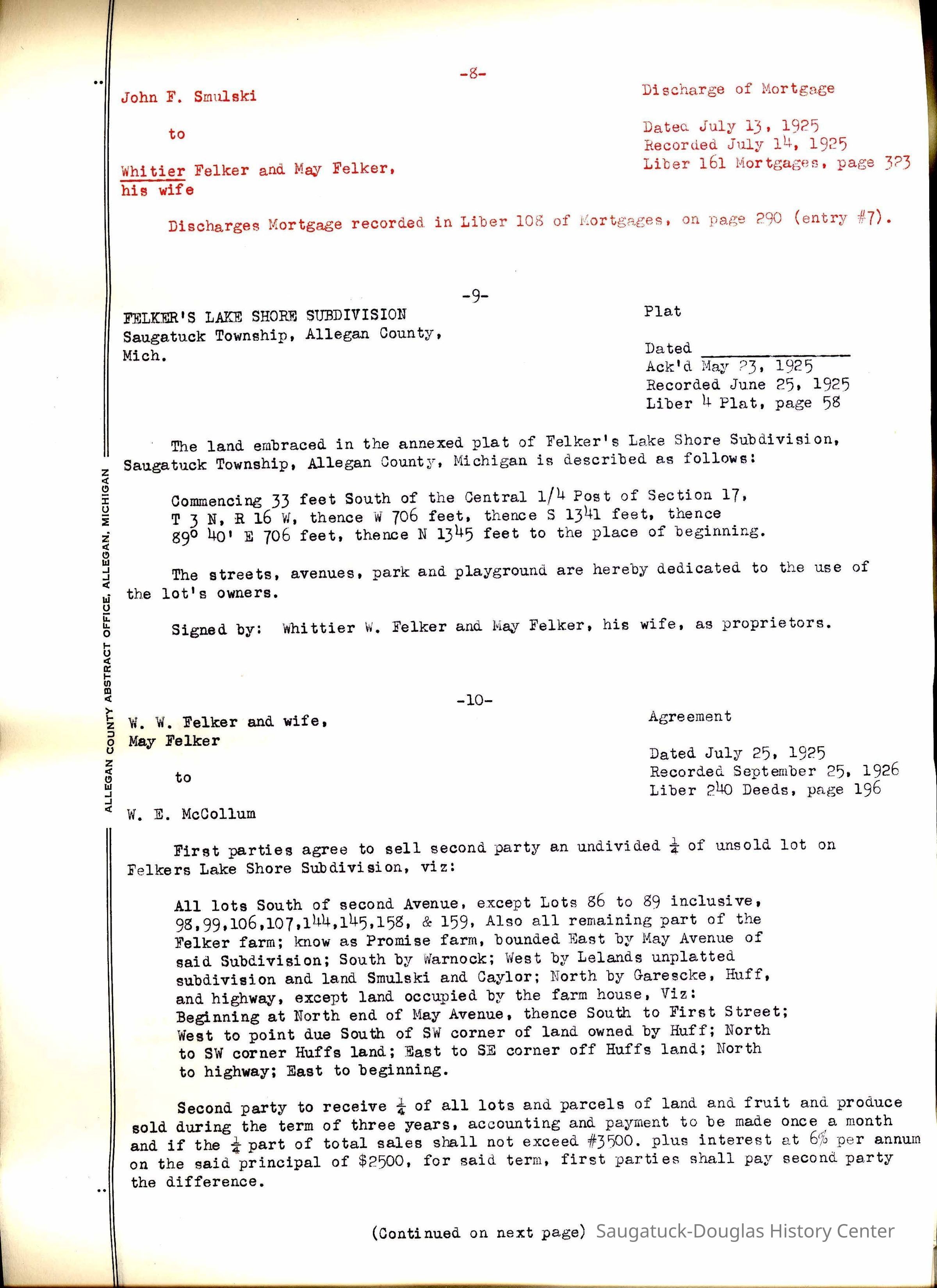 Walter and Nina Reddy of East Lansing, Michigan, purchased several lots in the Felker's Lake Shore Development in 1942 by Quit Claim from two colleagues for "one dollar & other good and valuable considerations". Walter subsequently built the first Felker's Subdivision cottage and took an active part in its development. Walter and Nina are Dorothy Otto's parents. Dorothy, with her husband Tom, continues to live in the second Felker's home built by Walter and Nina.