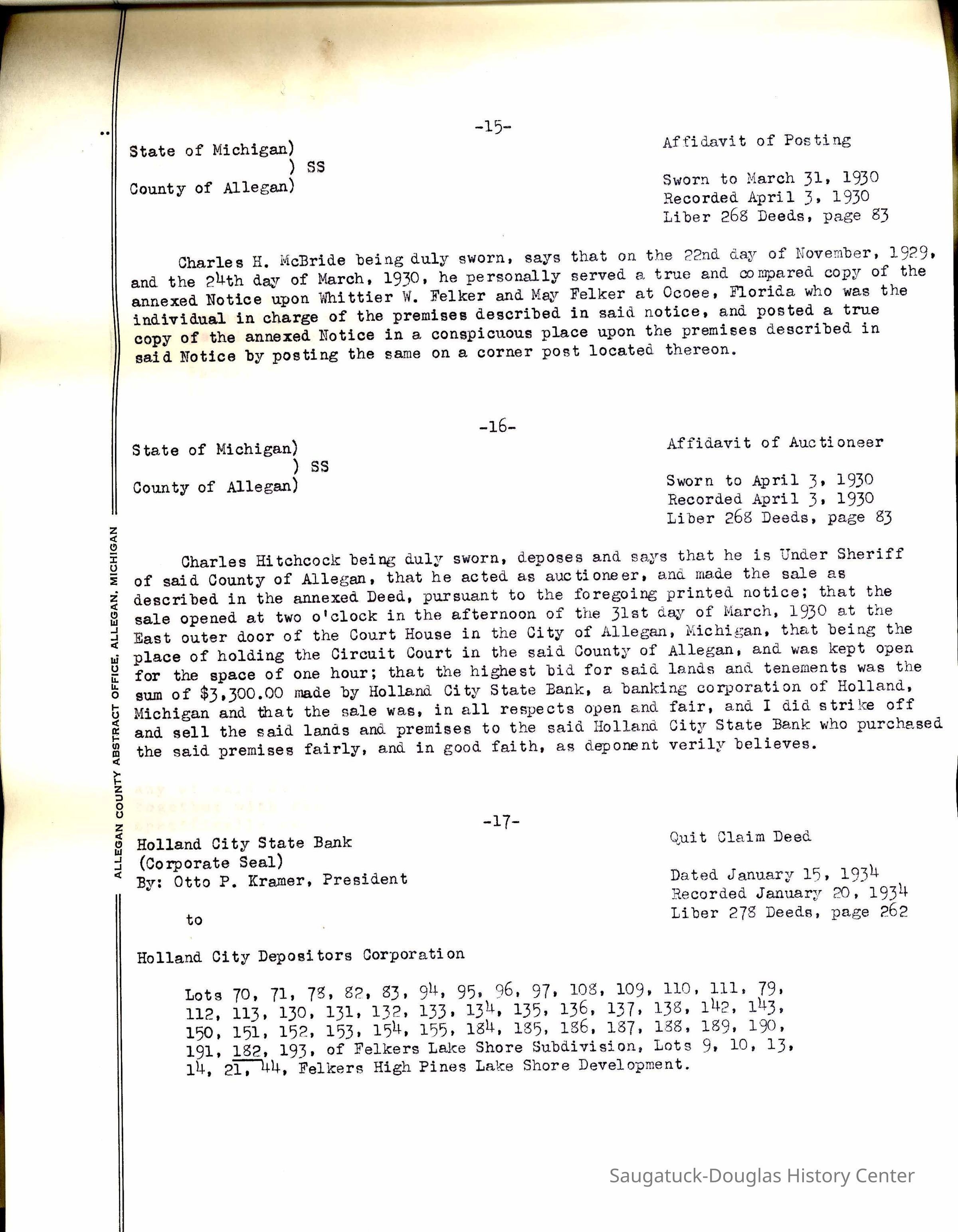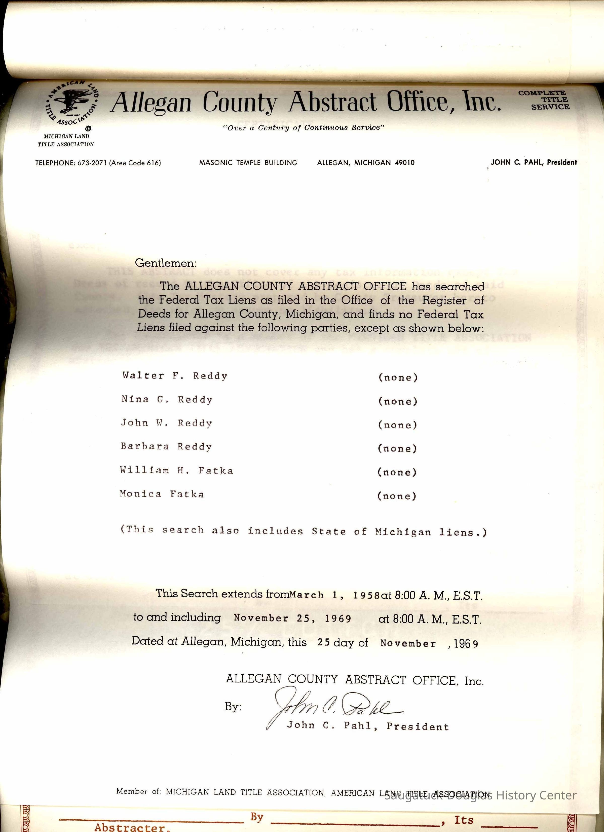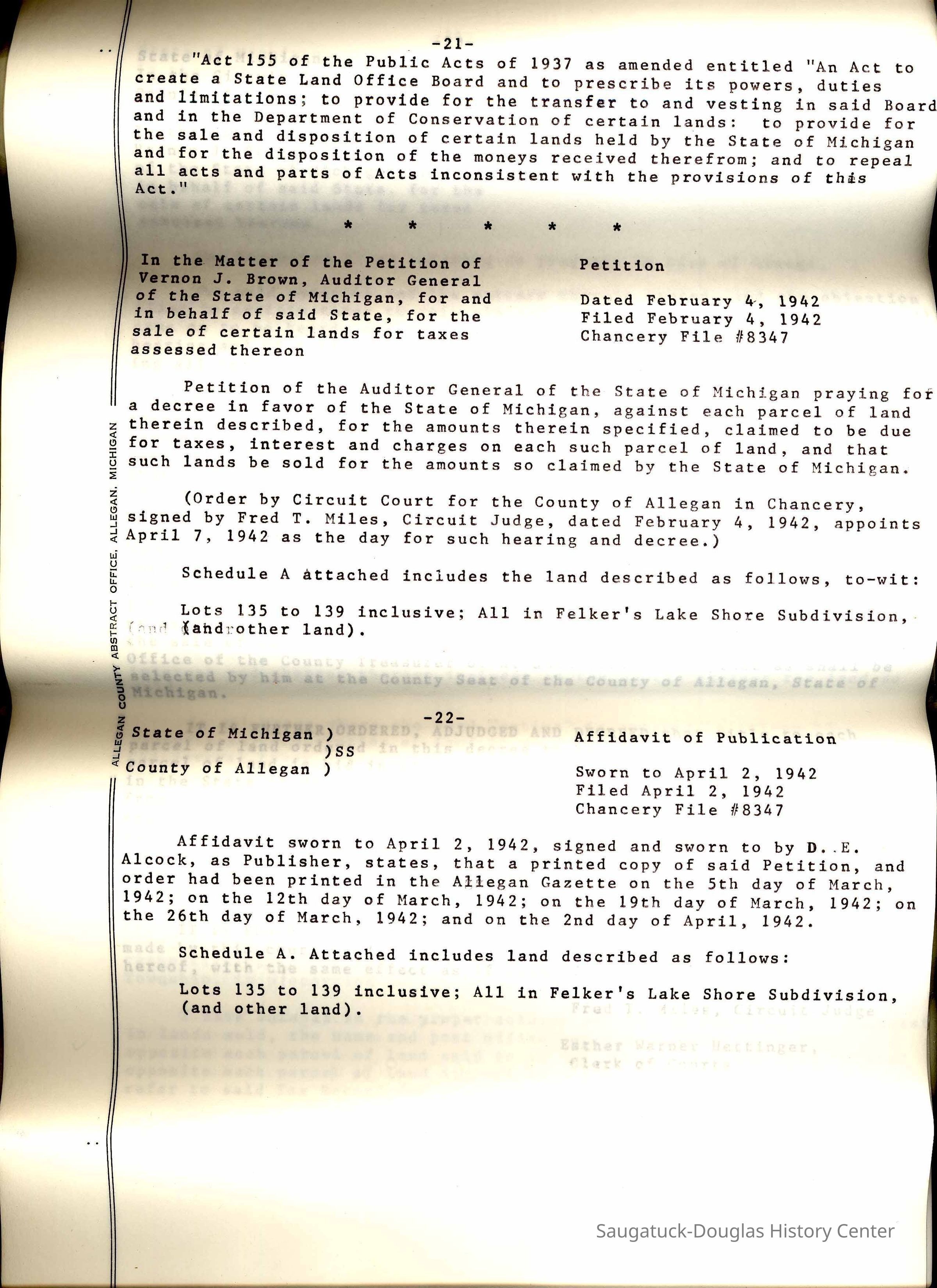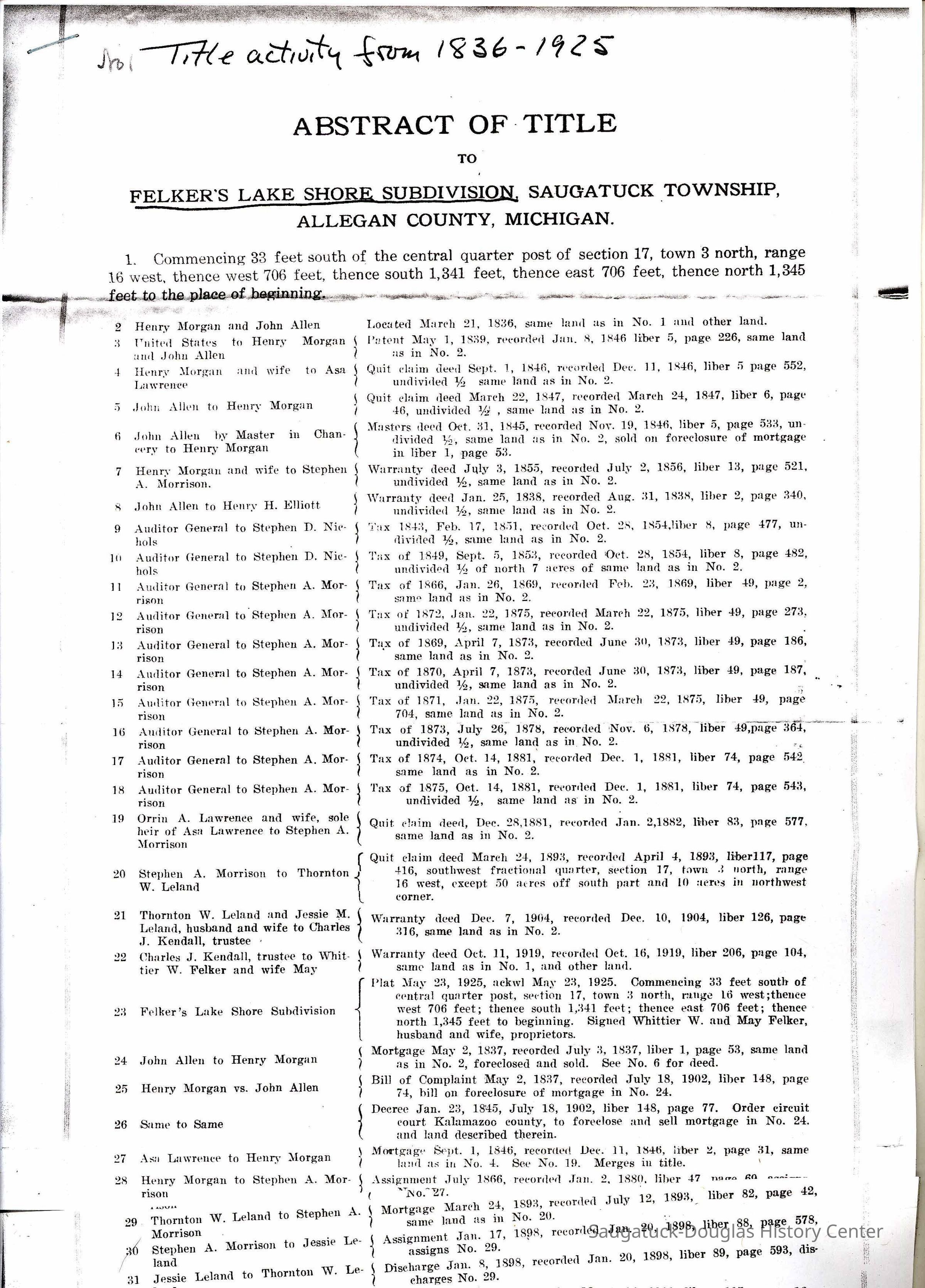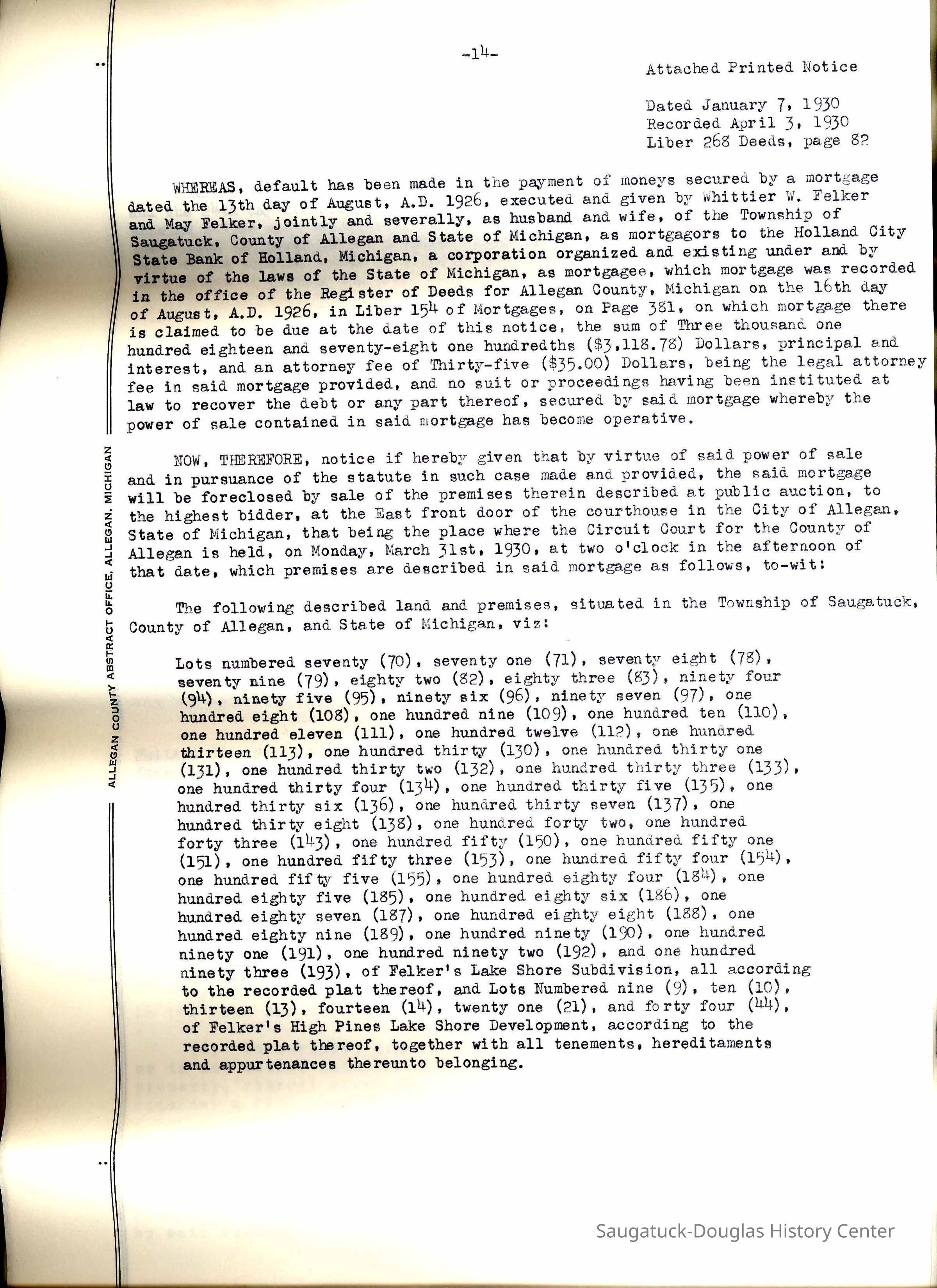 Walter and Nina Reddy of East Lansing, Michigan, purchased several lots in the Felker's Lake Shore Development in 1942 by Quit Claim from two colleagues for "one dollar & other good and valuable considerations". Walter subsequently built the first Felker's Subdivision cottage and took an active part in its development. Walter and Nina are Dorothy Otto's parents. Dorothy, with her husband Tom, continues to live in the second Felker's home built by Walter and Nina.