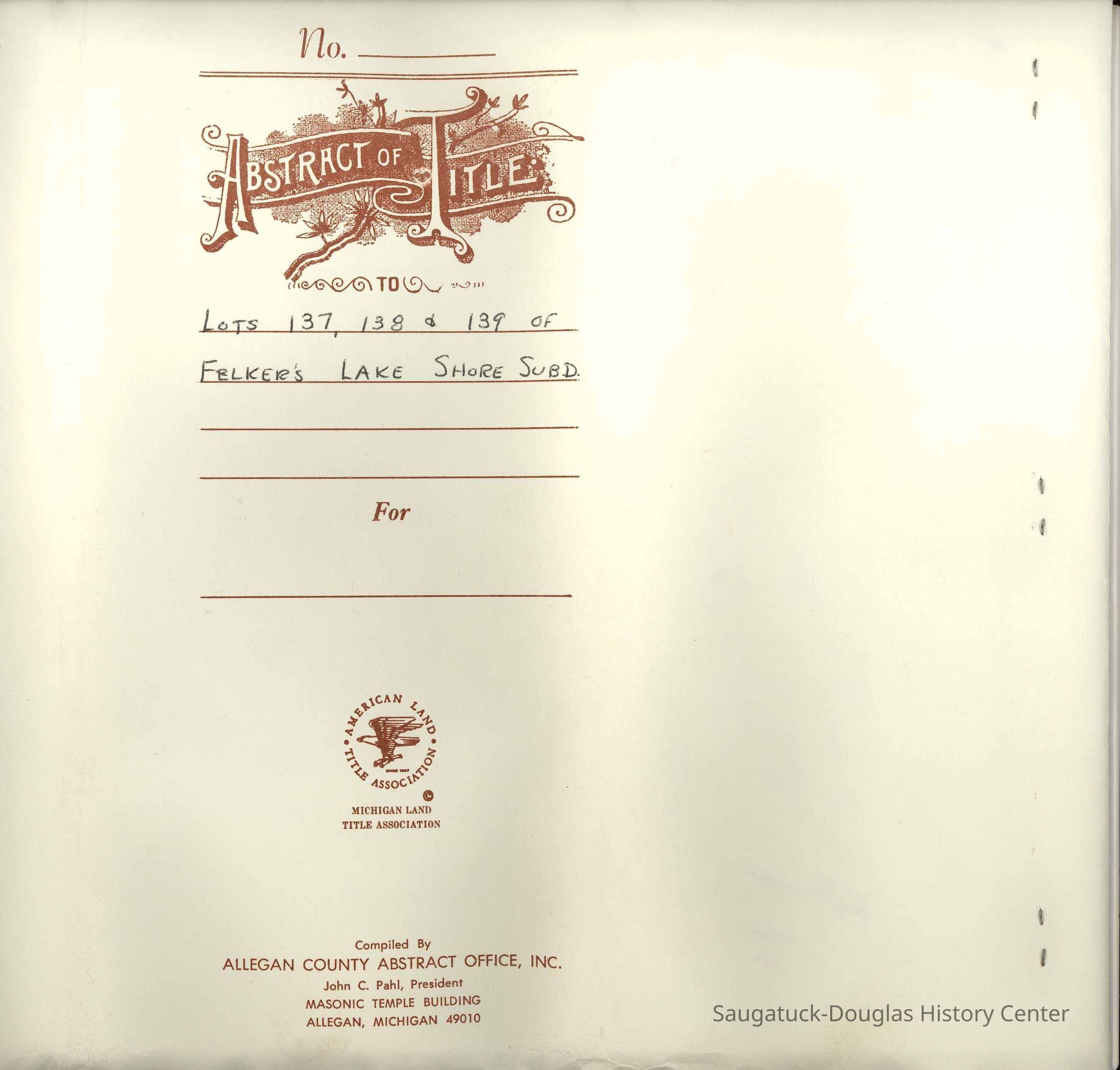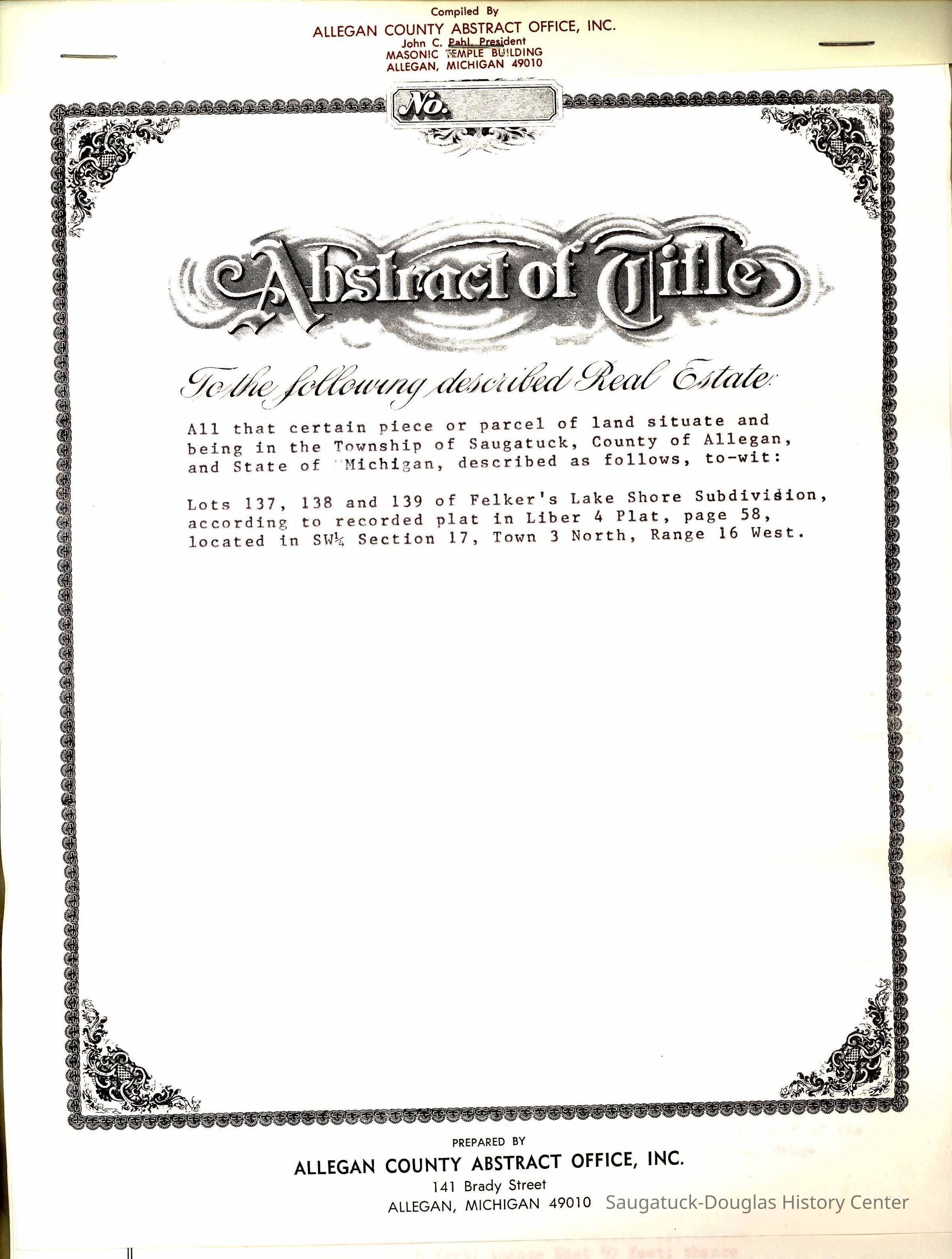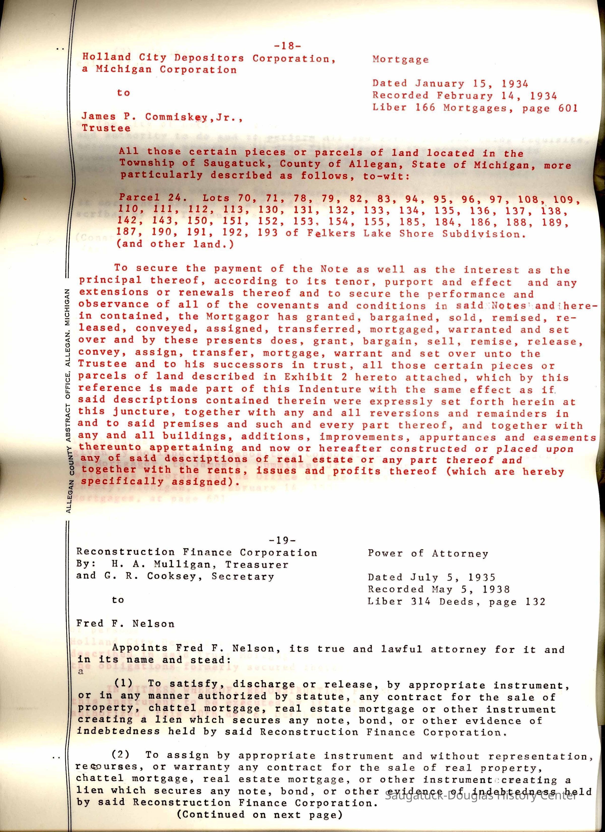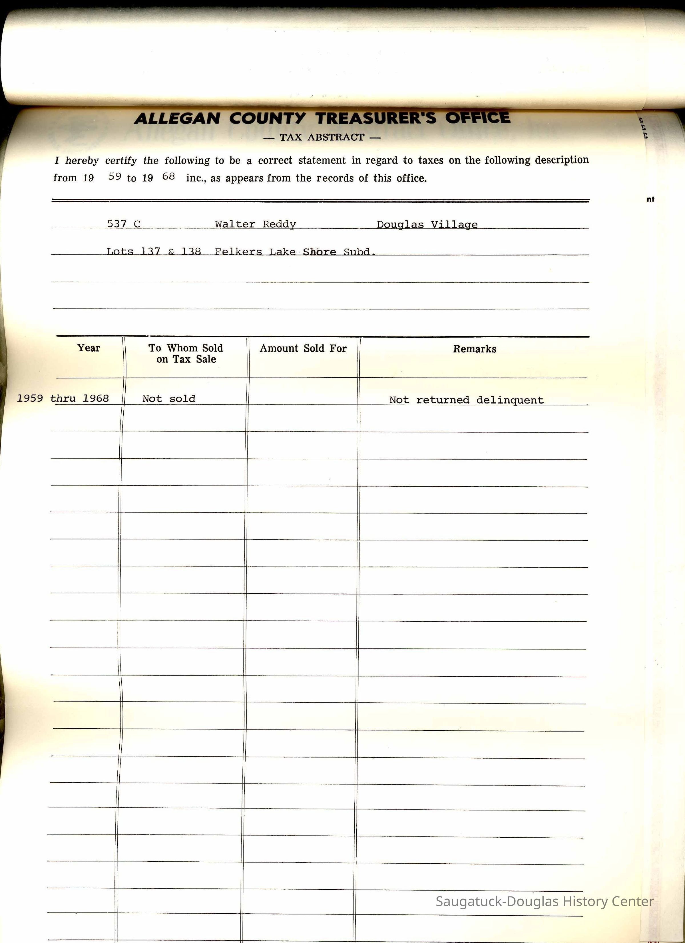 Walter and Nina Reddy of East Lansing, Michigan, purchased several lots in the Felker's Lake Shore Development in 1942 by Quit Claim from two colleagues for "one dollar & other good and valuable considerations". Walter subsequently built the first Felker's Subdivision cottage and took an active part in its development. Walter and Nina are Dorothy Otto's parents. Dorothy, with her husband Tom, continues to live in the second Felker's home built by Walter and Nina.