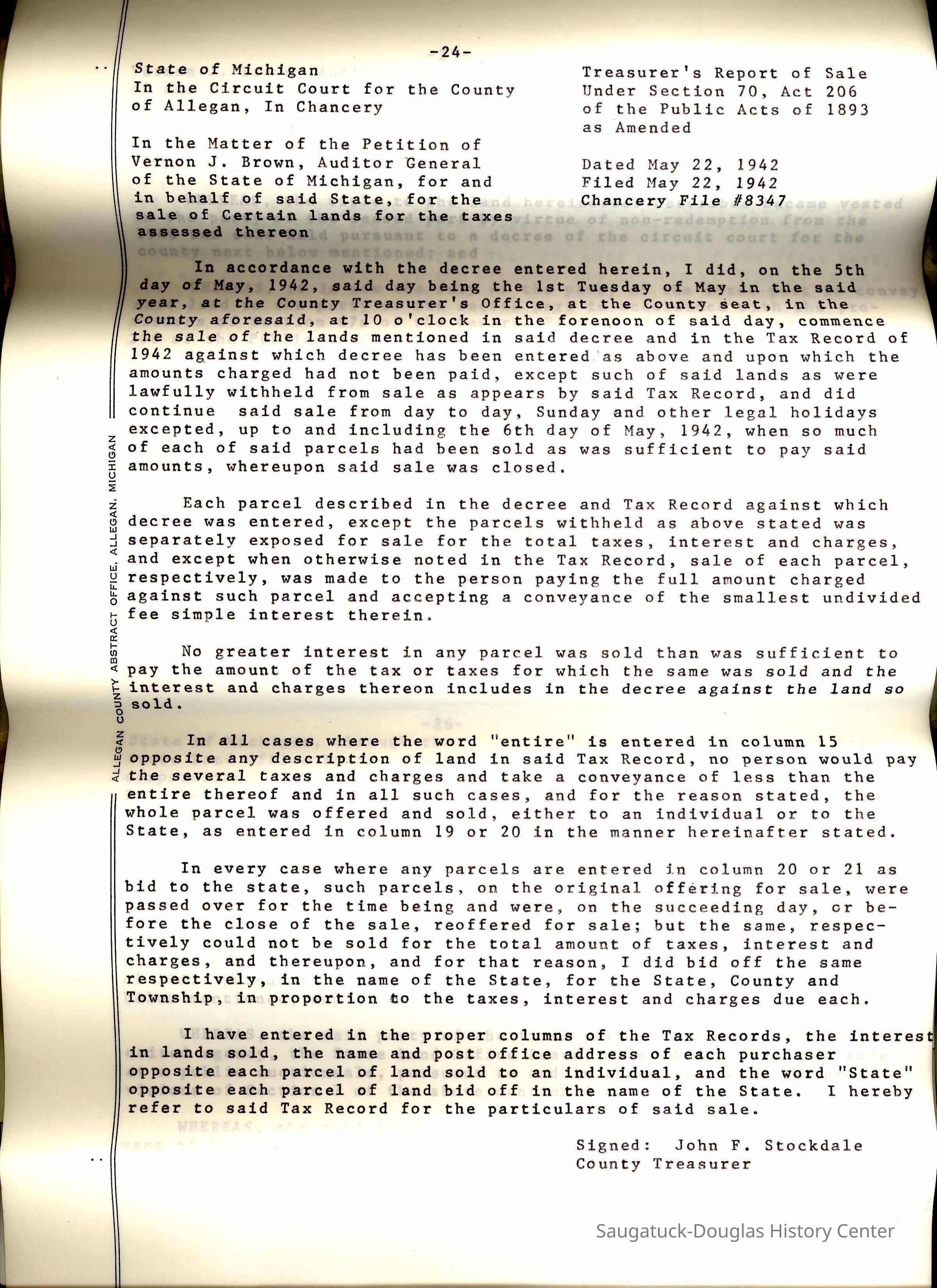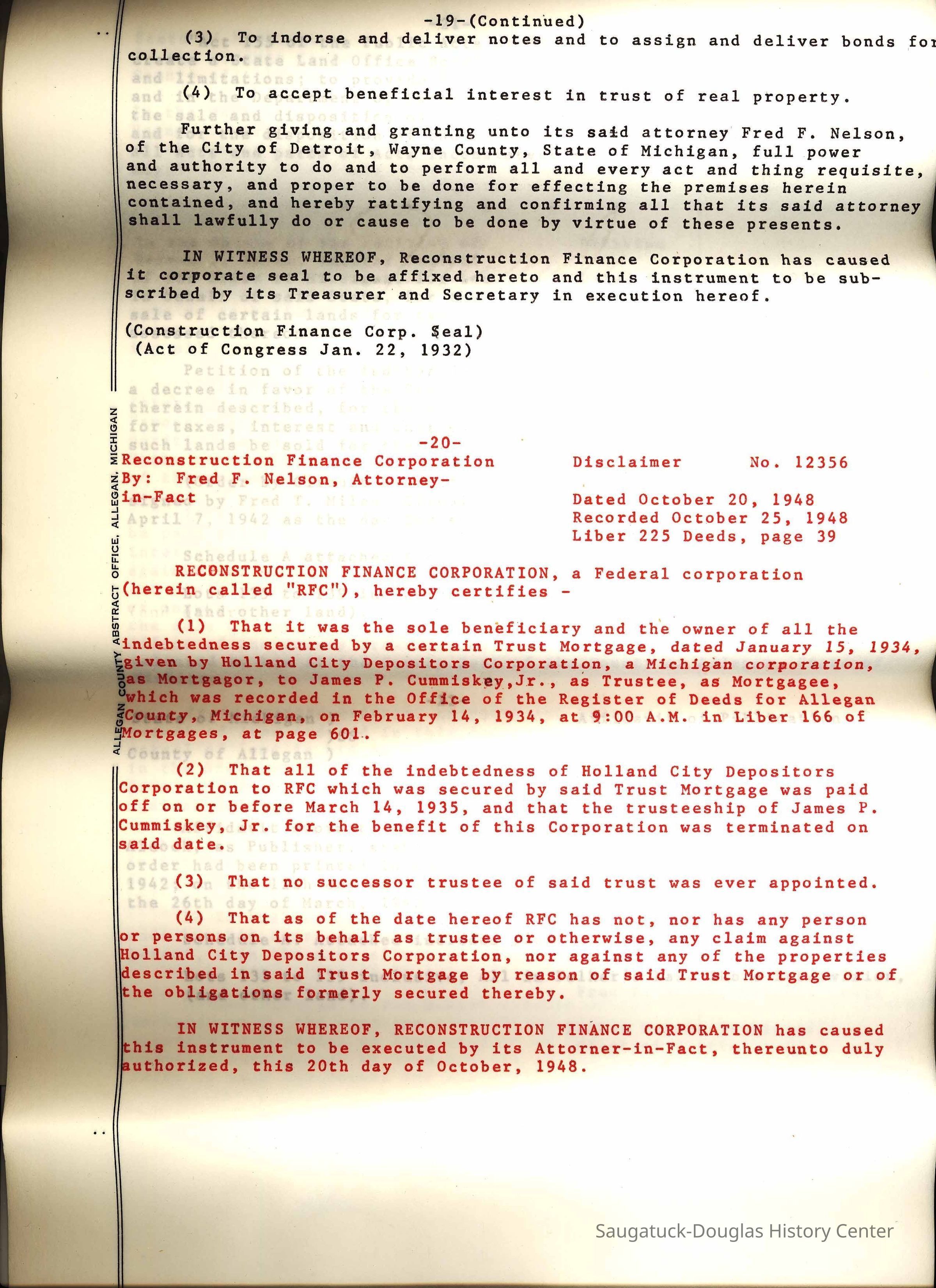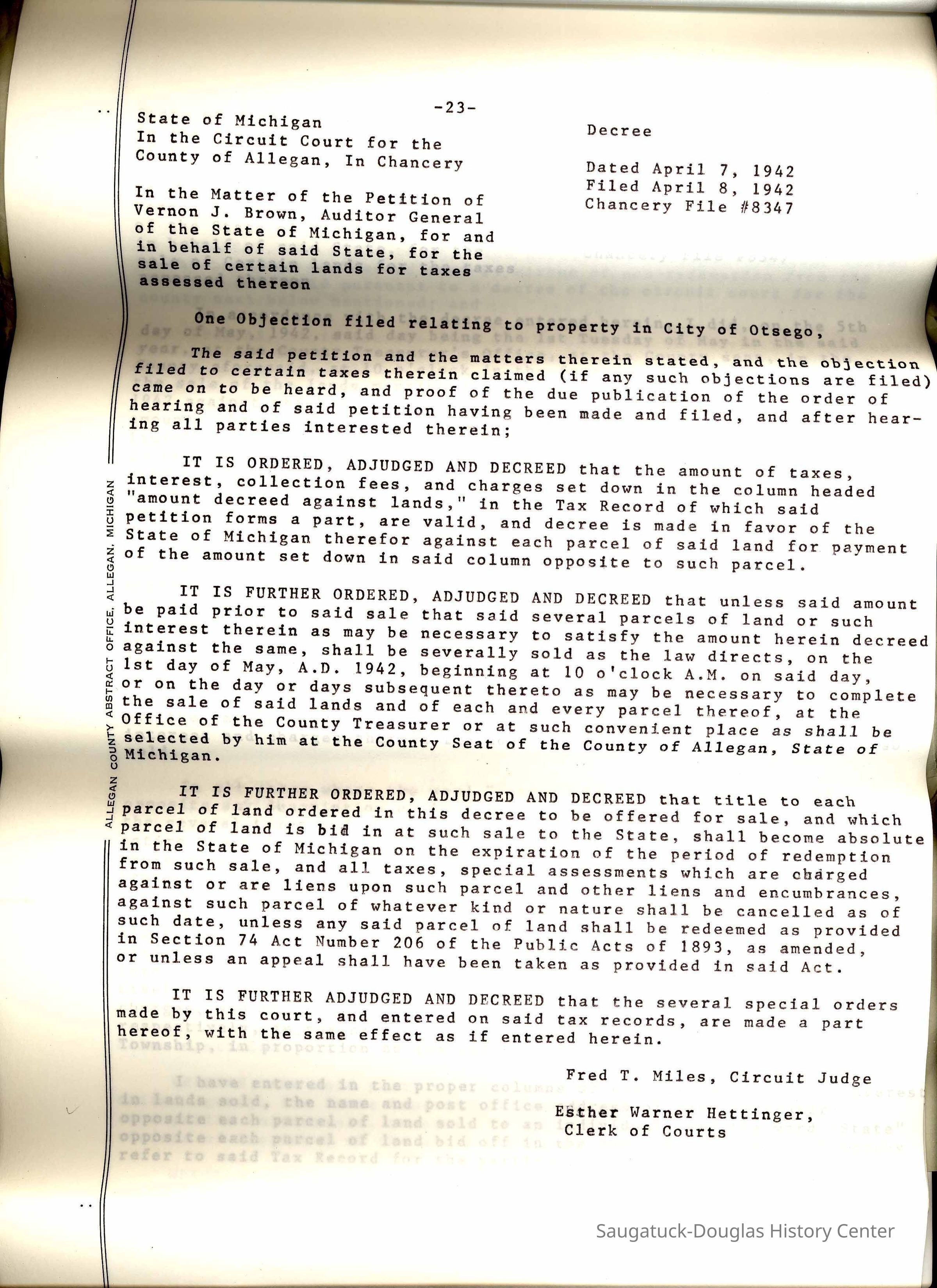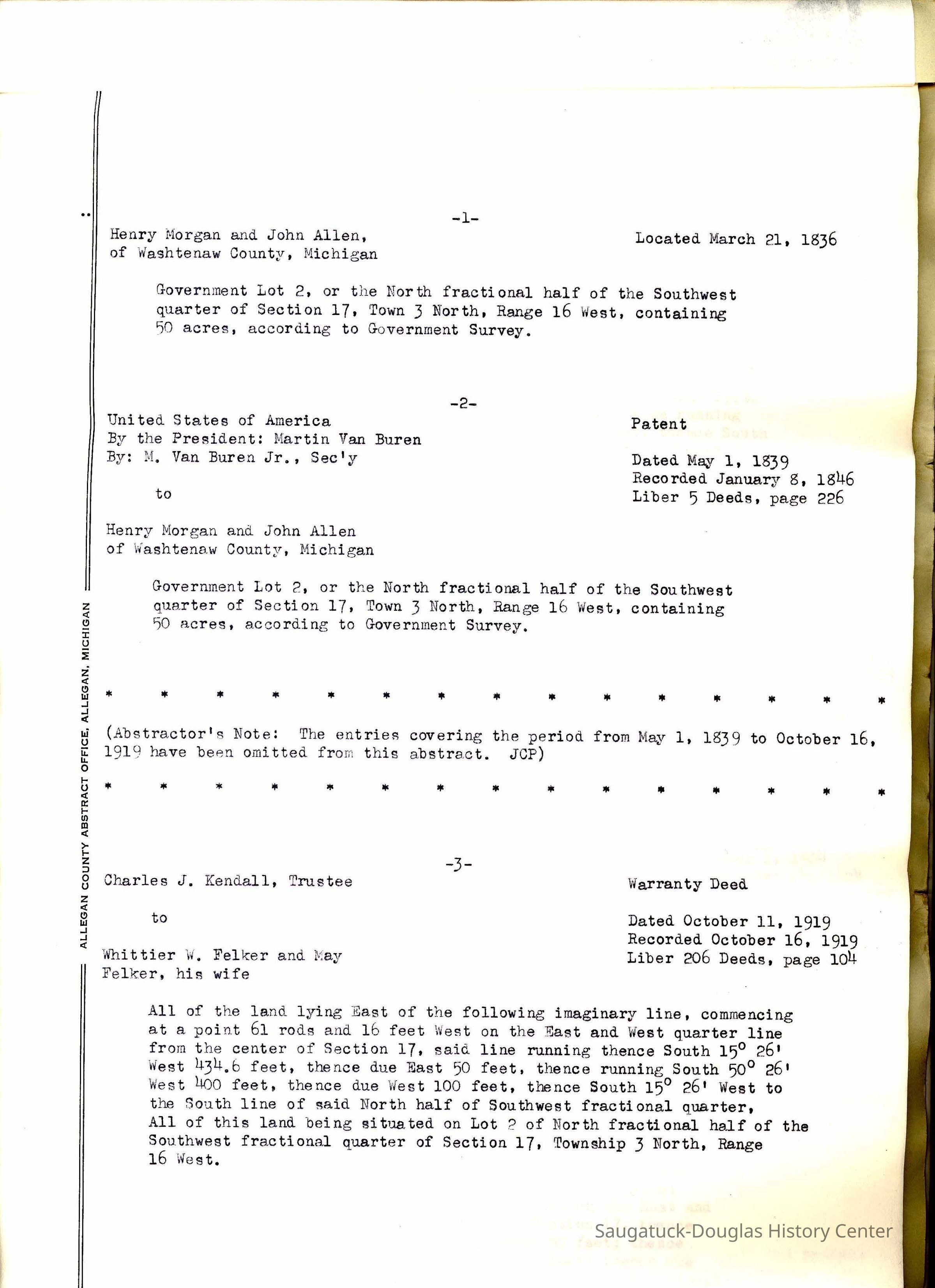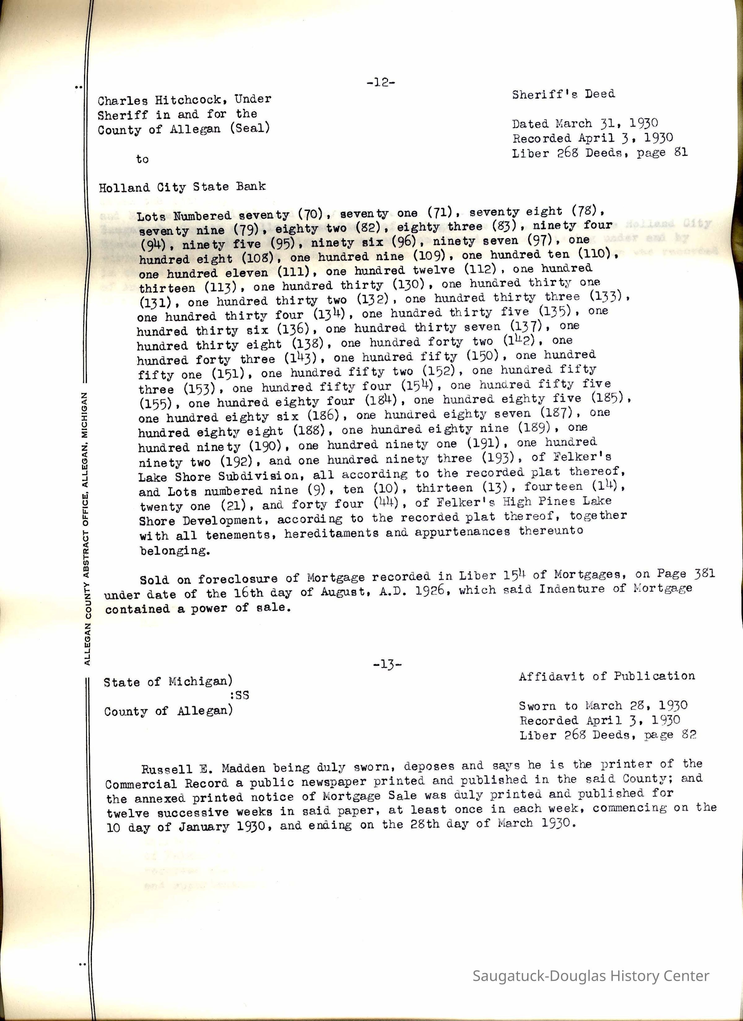 Walter and Nina Reddy of East Lansing, Michigan, purchased several lots in the Felker's Lake Shore Development in 1942 by Quit Claim from two colleagues for "one dollar & other good and valuable considerations". Walter subsequently built the first Felker's Subdivision cottage and took an active part in its development. Walter and Nina are Dorothy Otto's parents. Dorothy, with her husband Tom, continues to live in the second Felker's home built by Walter and Nina.
