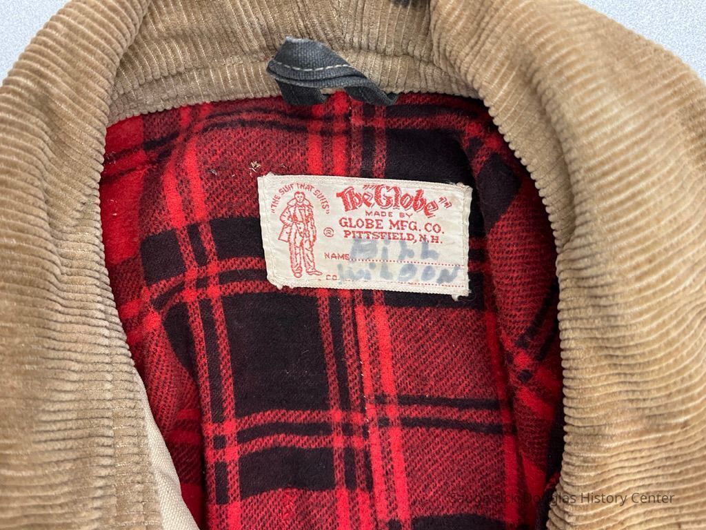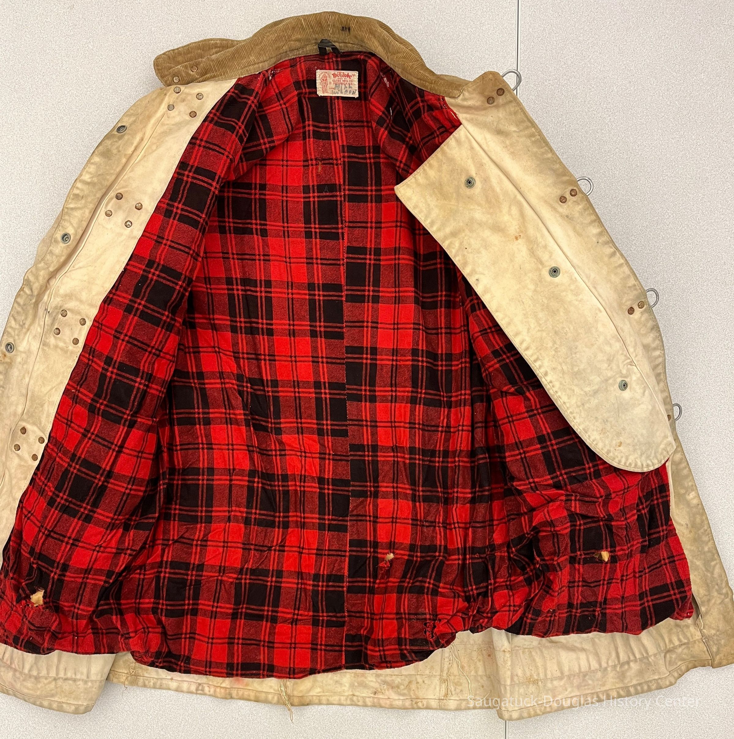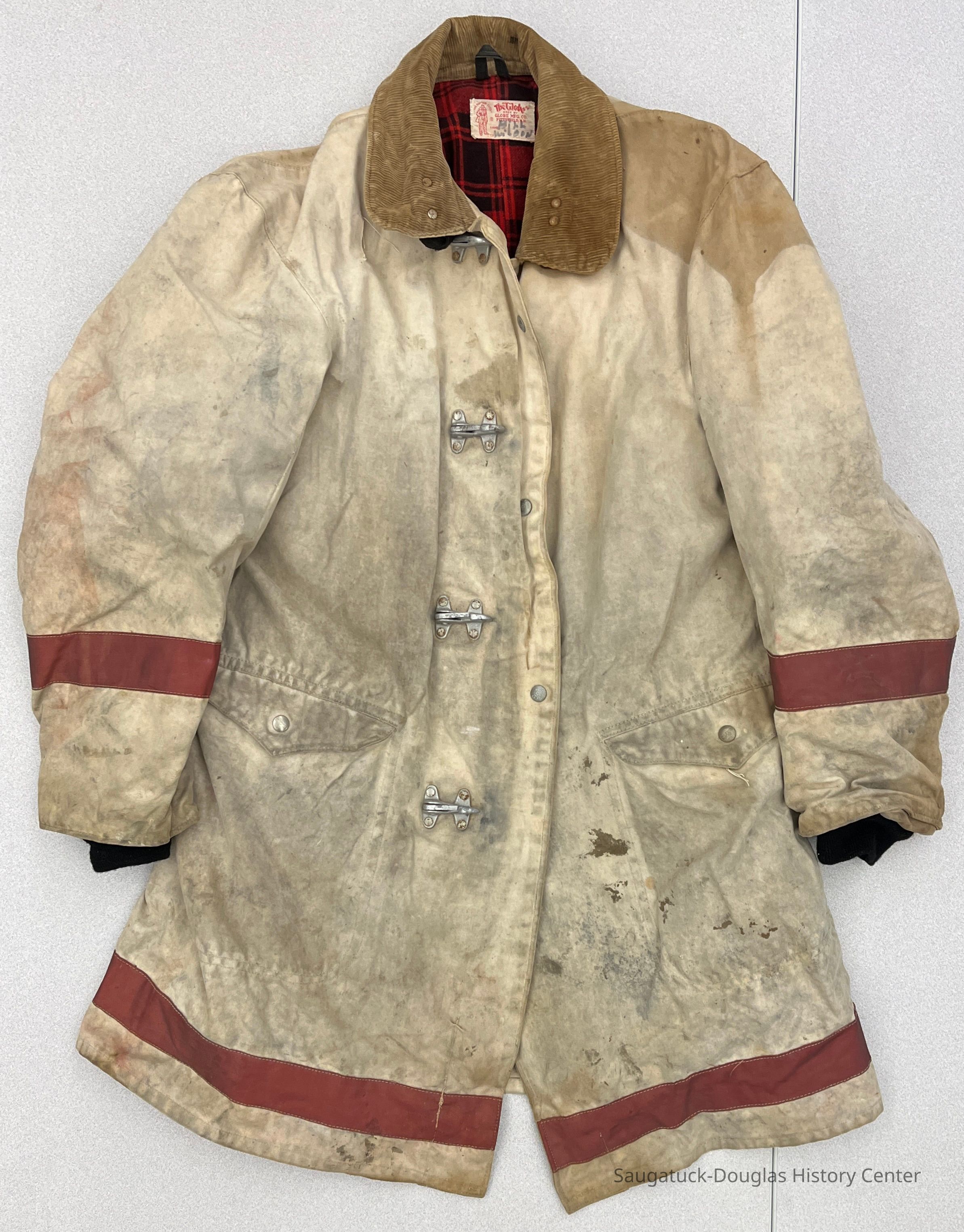 Beige canvas fire fighter's coat, also called a turnout coat. The 3/4-length coat has a tan, corduroy collar, black knit cuffs and red stripes on the forearms and bottom hem. It is lined with red and black plaid flannel and an inner layer of brown paper. The coat has two flapped pockets and latch and snap closures. The manufacturer's tag that is sew to the back collar reads "The Globe Made by Globe Mfg. Co., Pittsfield, N.H. The suit that suits" and has the name Bill Wison hand written in black marker.