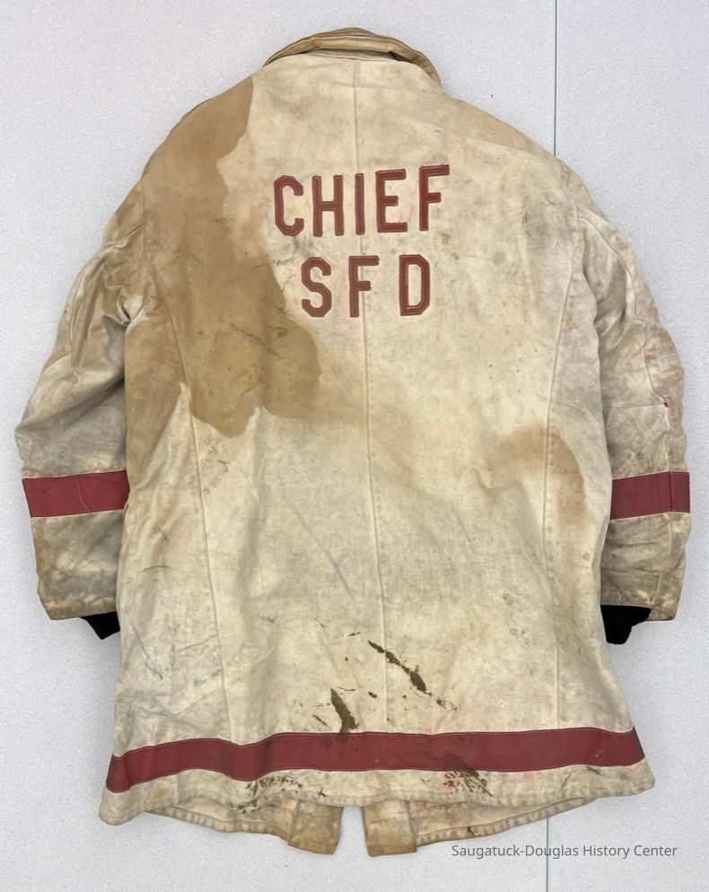 The coat was worn by Saugatuck Fire Chief Bill Wilson whose greatest flaming foe was the Big Pavilion fire.