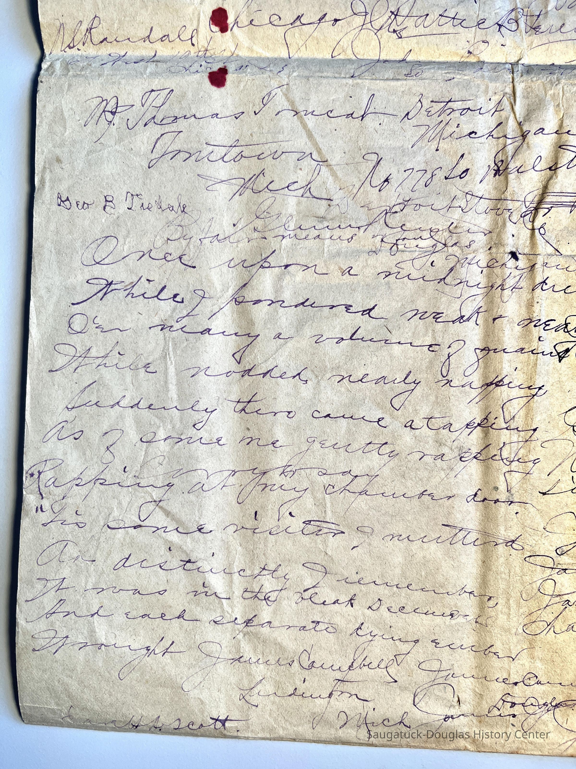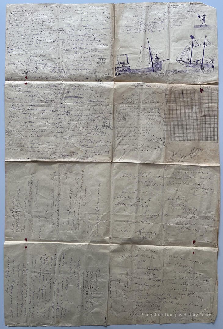 Large sheet of paper, folded in quarters, covered with drawings of ships, signature practice, draft employment letter dated 1891, a grid, transcriptions of The Raven by Edgar Allen Poe and doodles attributed to Captain George B. Tisdale.